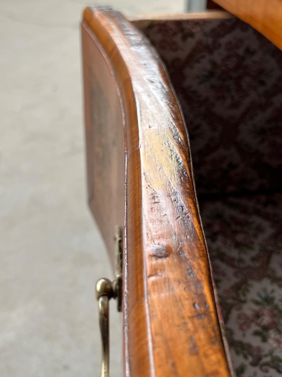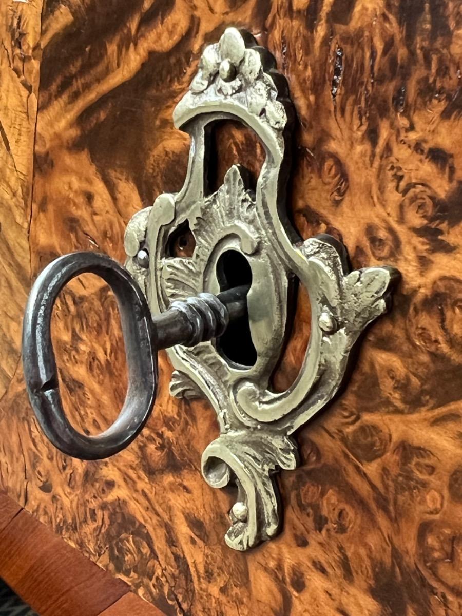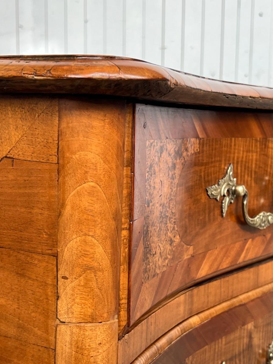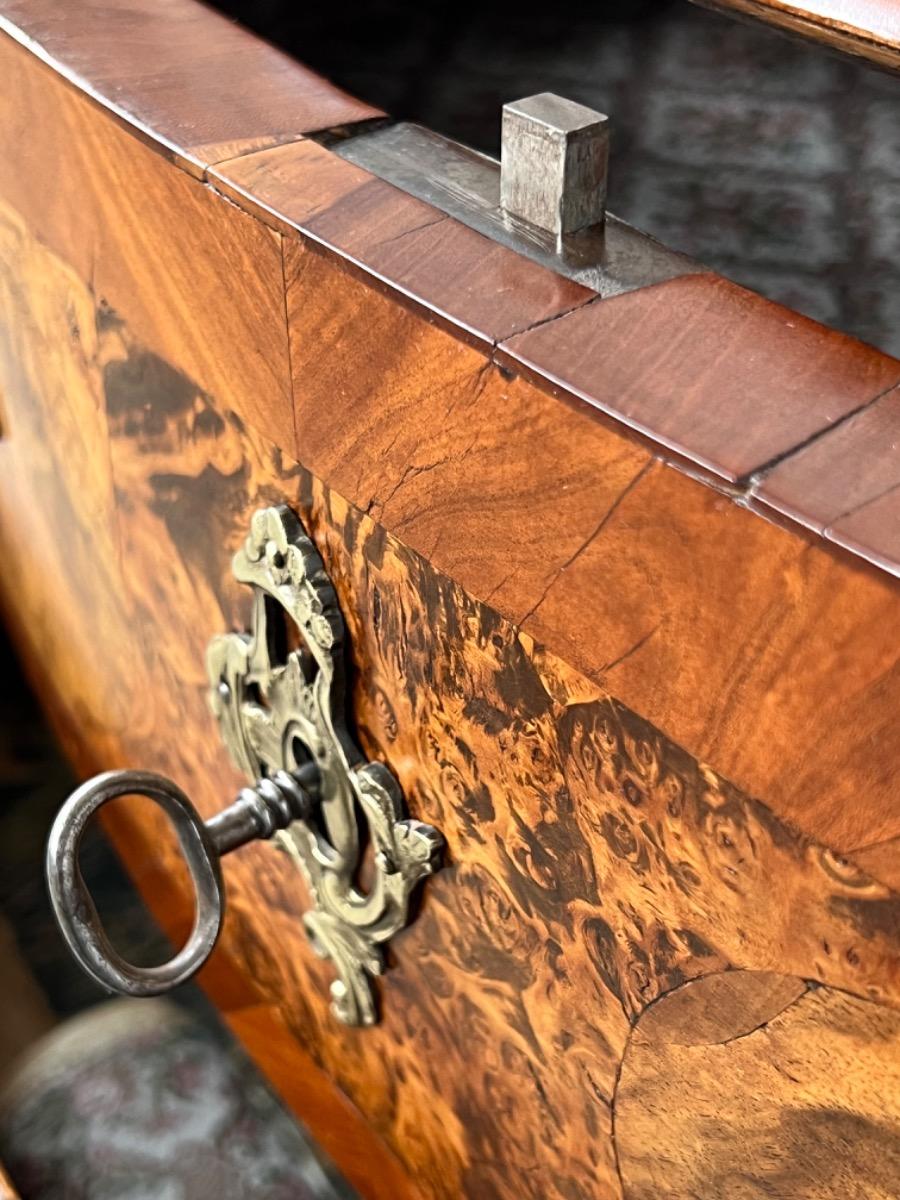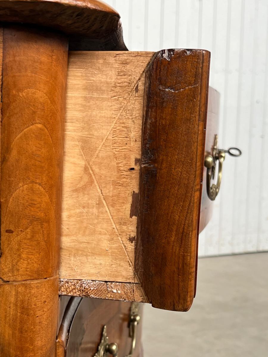 Noten Louis XIV ladekast ‘Du Dauphiné’ met gegoten messing beslag. Licht gebogen laden met, inlegwerk. Gecontouneerd blad en "breacket poten". Achterwand en laden (bodems) van spar/den. Vroeg 18e eeuws notenhouten meubel met inlegwerk van berkenwortel, taxus, kersen en essenhout. Dik ingelegd bovenblad met daaronder drie grote laden, eveneens ingelegd. Alle oorspronkelijke sloten aanwezig er werkend met oorspronkelijke sleutel. Frankrijk, mogelijk Zwitsers Goede kwaliteit, omstreeks 1740-1760. Afm: H= 83cm. B= 119 cm. D= 57-67 cm. (Min-max maten) Onlangs grondig nagelopen op losse delen van constructie en fineer. Houtworm controle : Geen levende houtworm aangetroffen op 9/1/2024 com-2738~