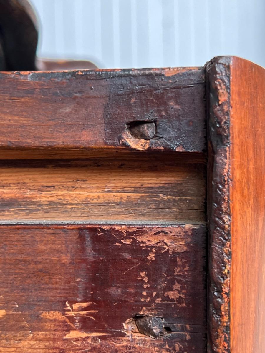 Onlangs grondig nagelopen op losse delen van constructie en fineer. Geen levende houtworm aangetroffen op 16/6/2023