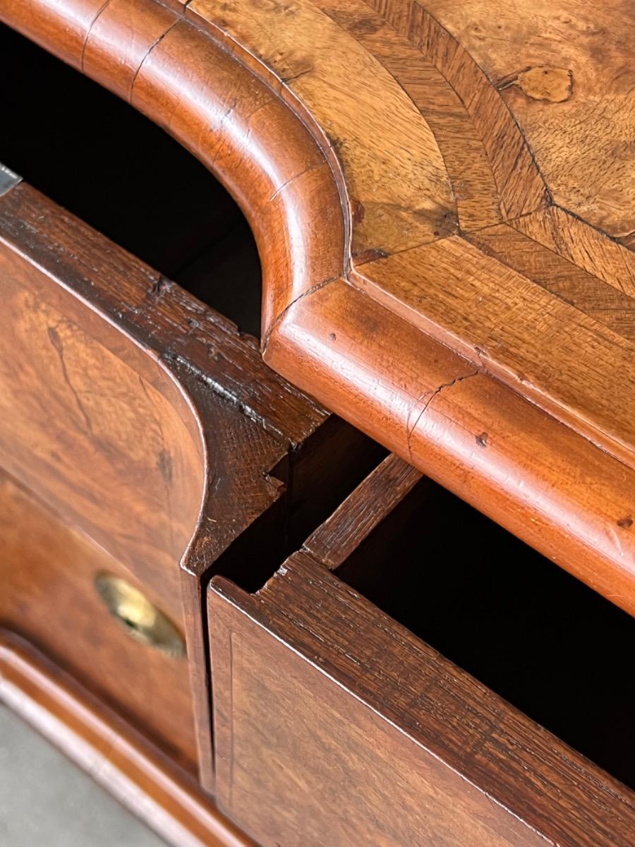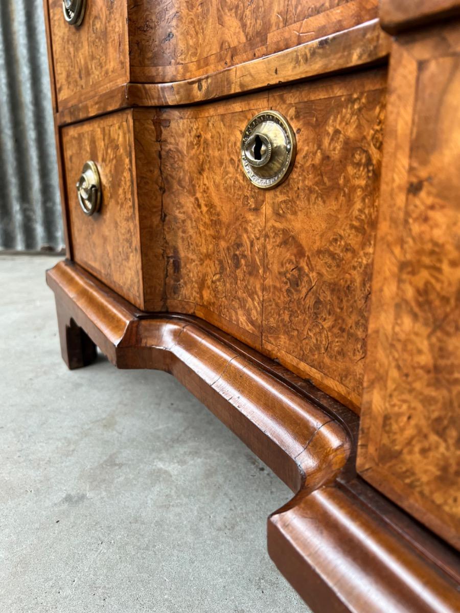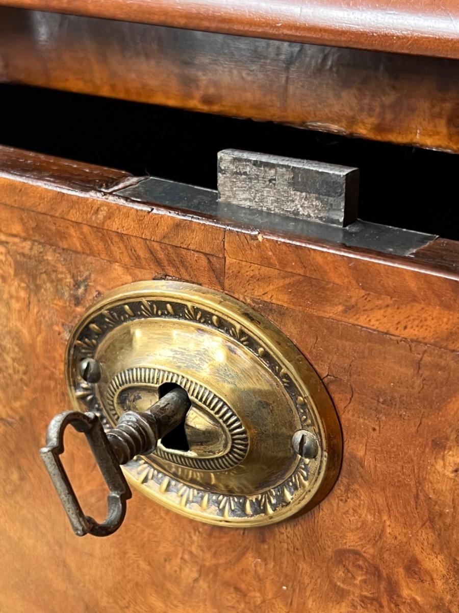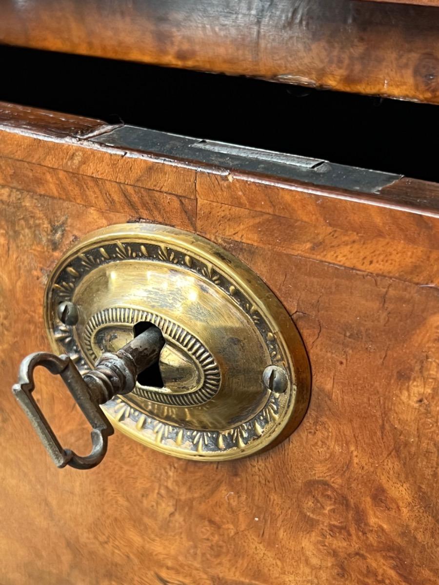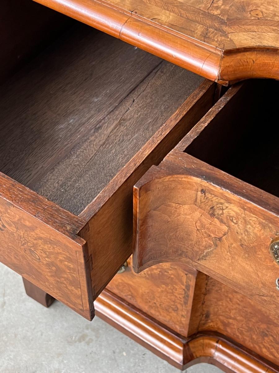 Wortelnoten commode midden 18e eeuw met ovaal verguld messing beslag. 2 over 3 laden.