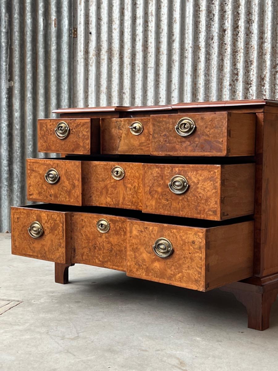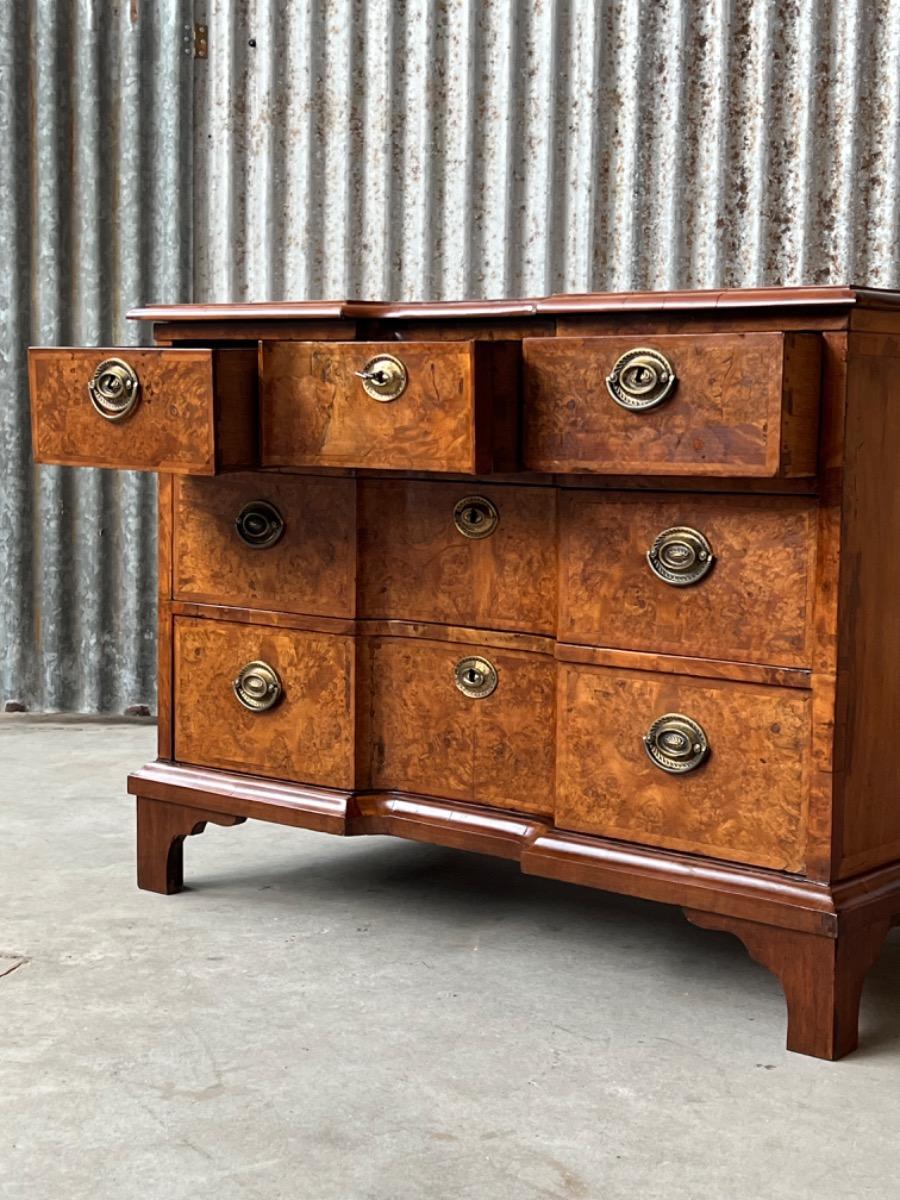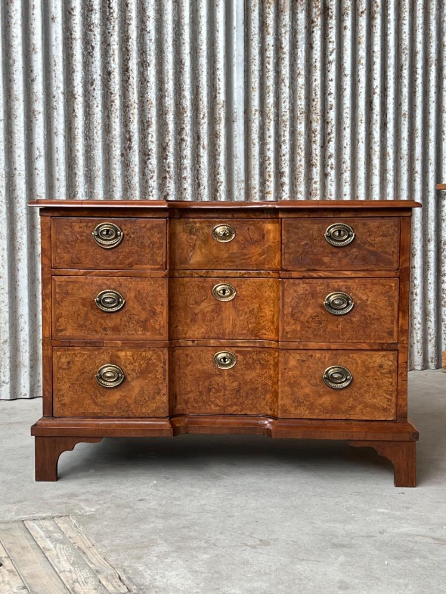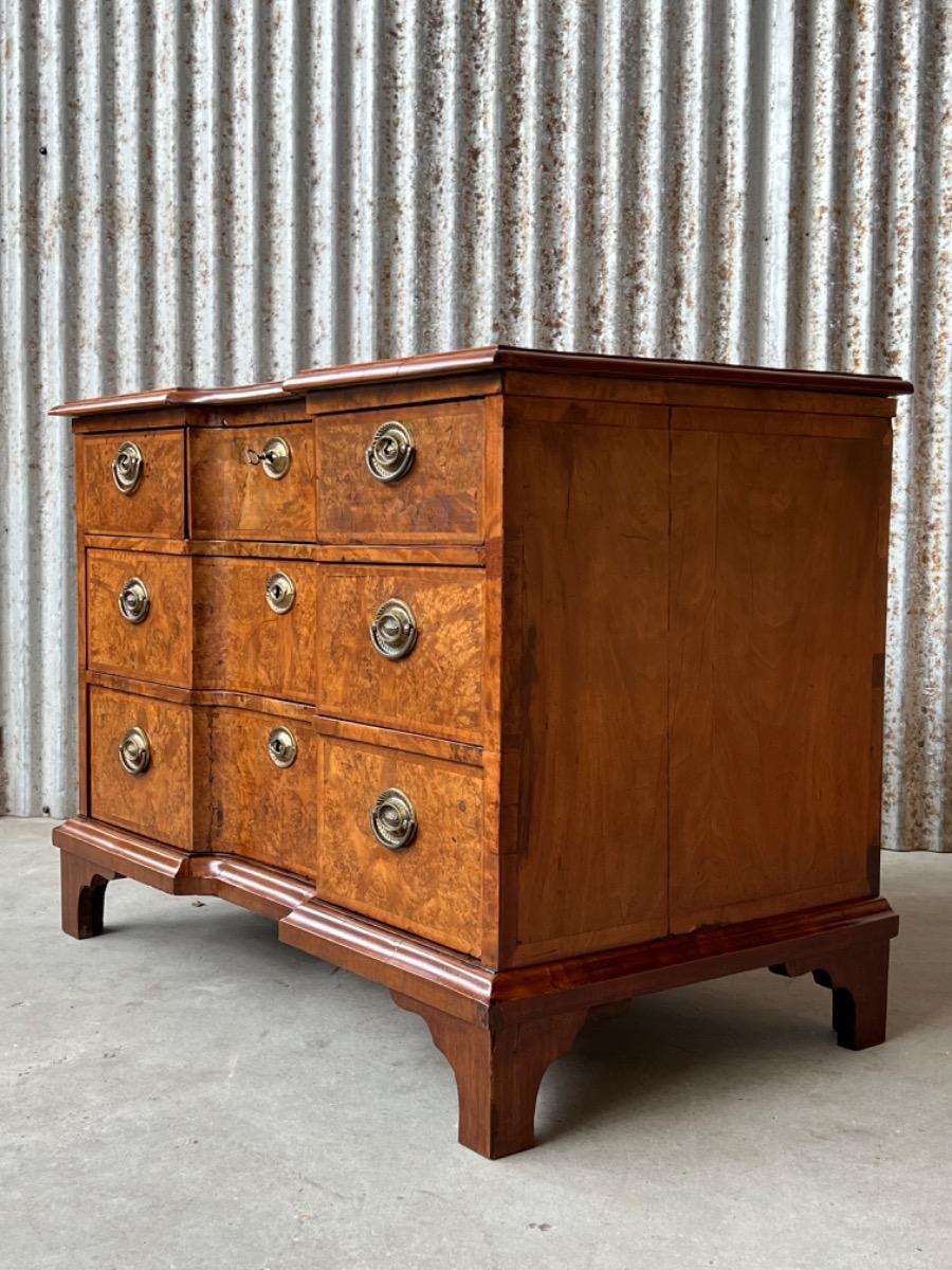 Wortelnoten commode midden 18e eeuw met ovaal verguld messing beslag. 2 over 3 laden.