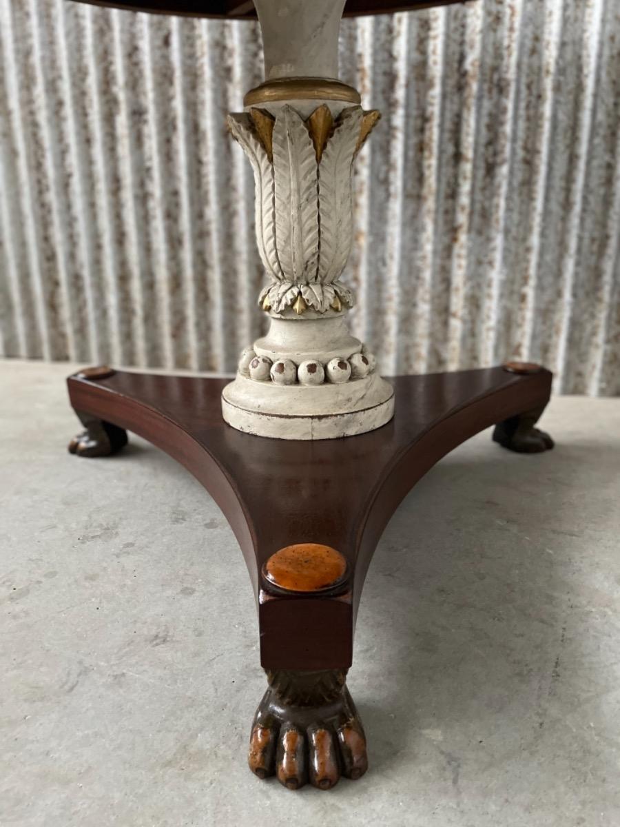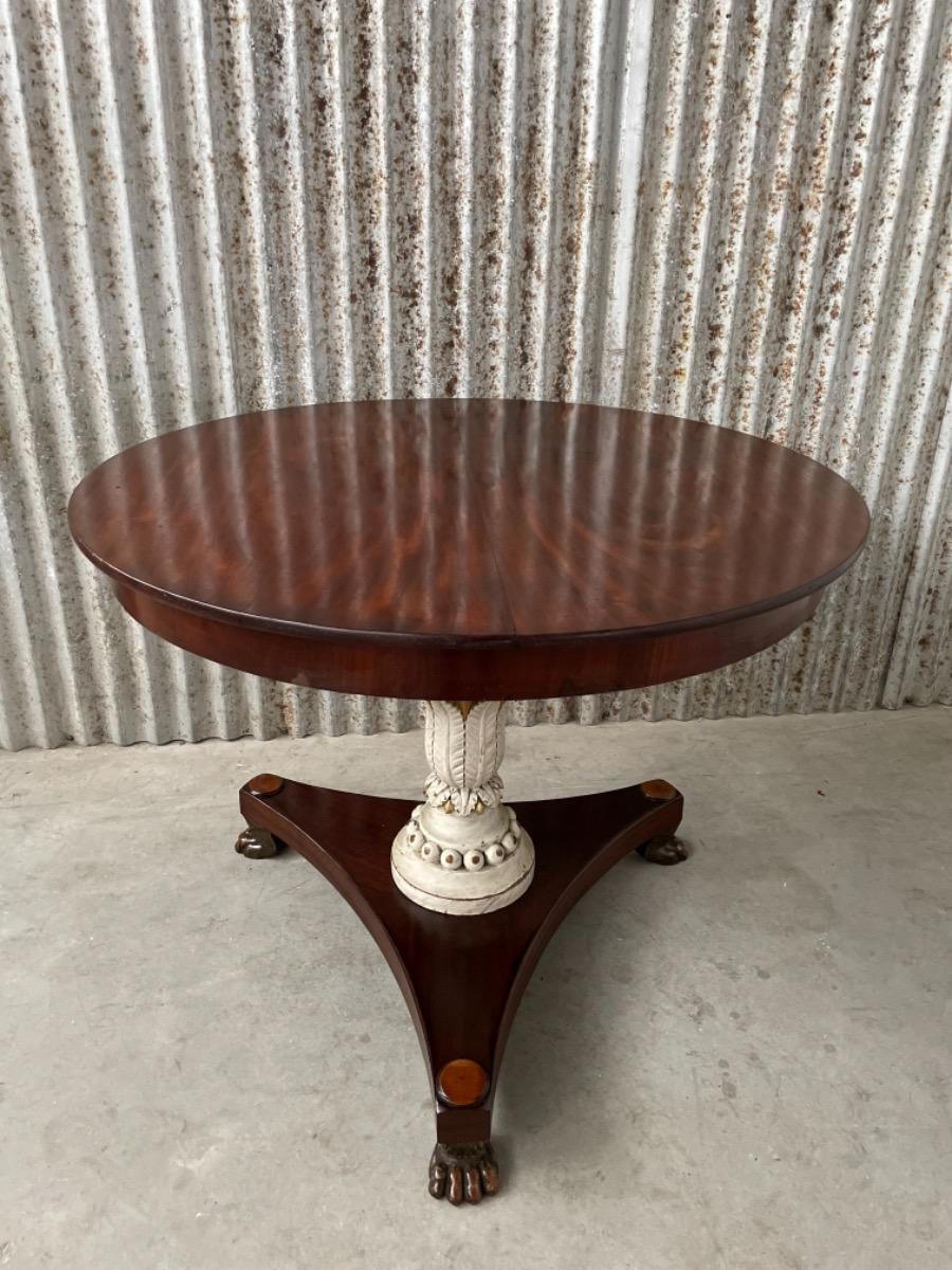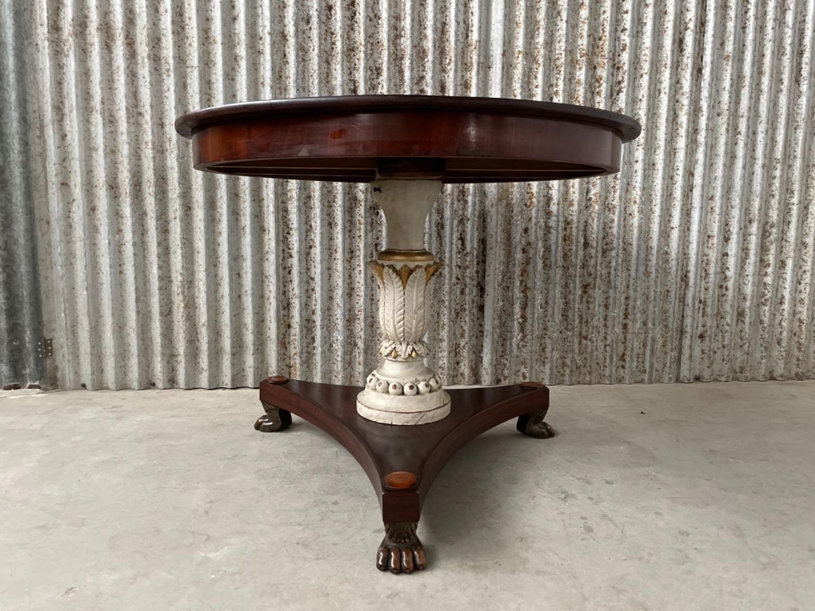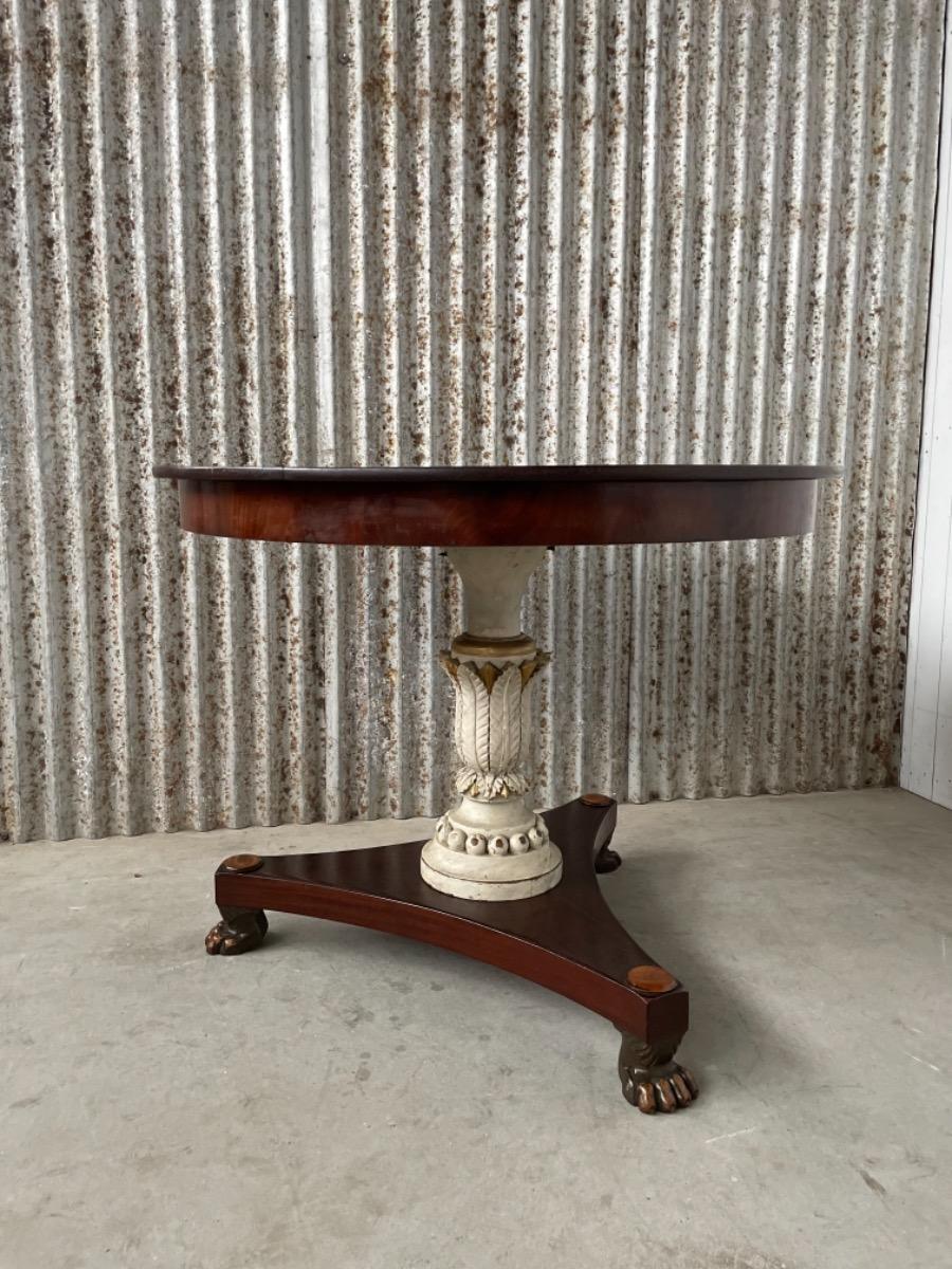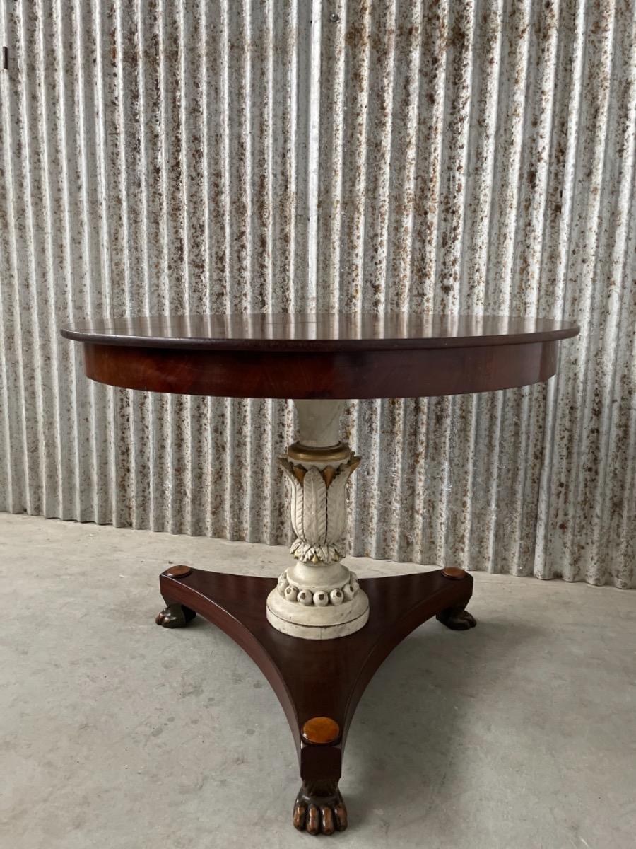 Massief mahonie tafel met gemarmerde centrale poot, vergulde details, acanthusblad. Mahonie driespant gedragen door polychroom verniste klauwpoot. Louis XVI - Empire
