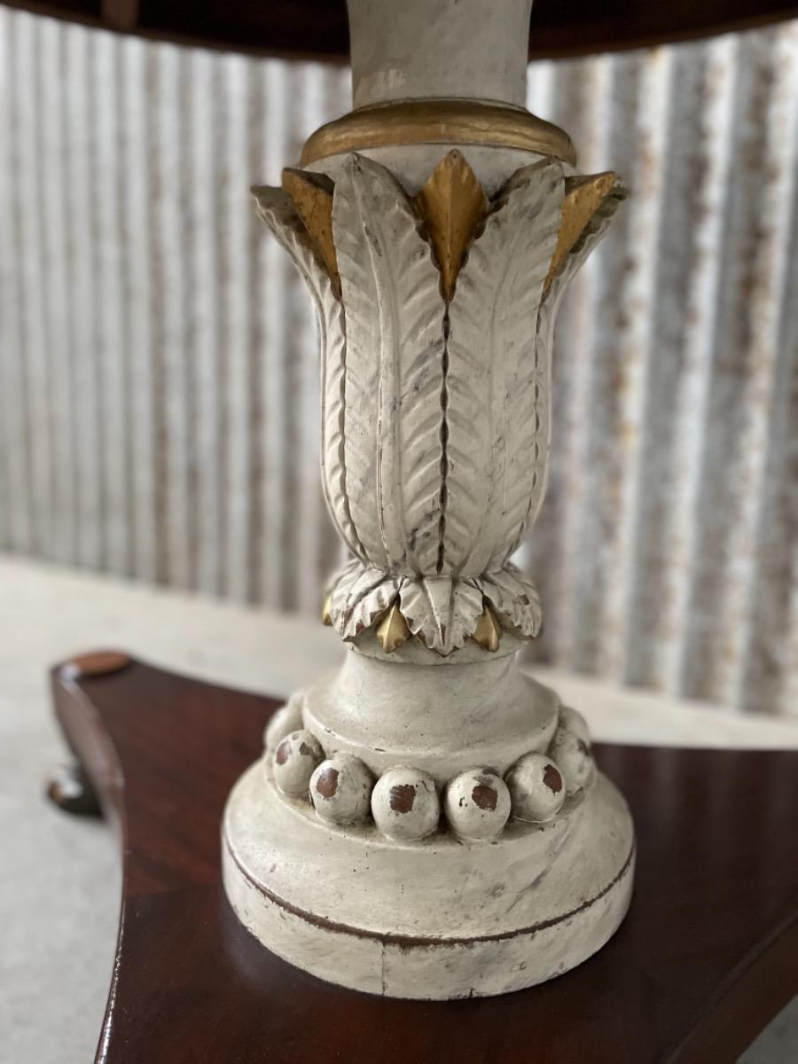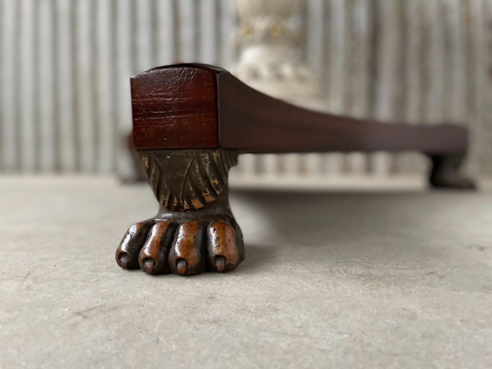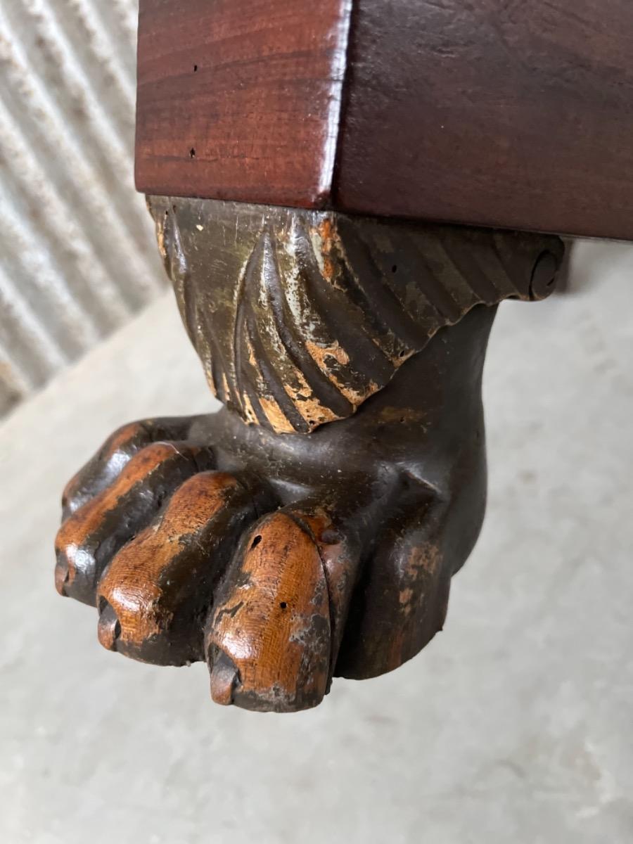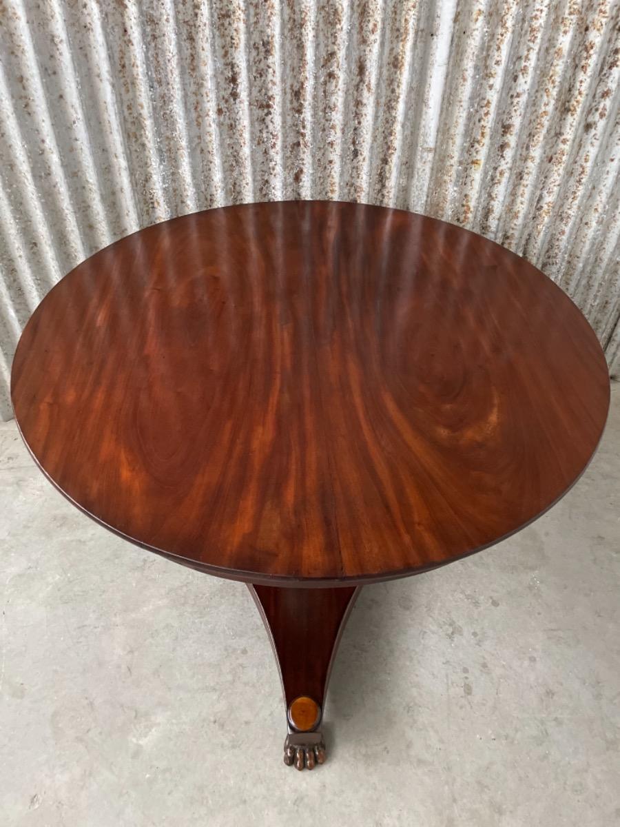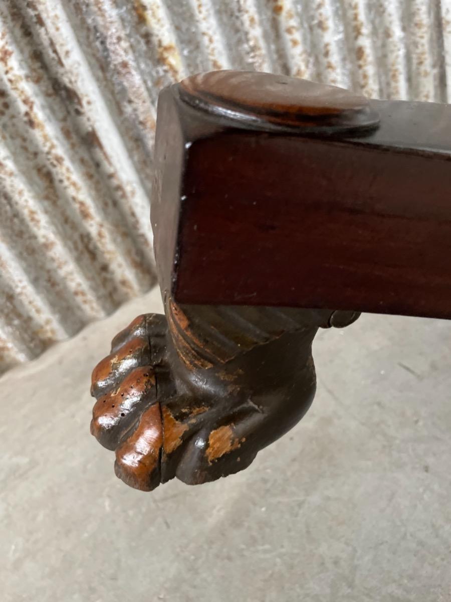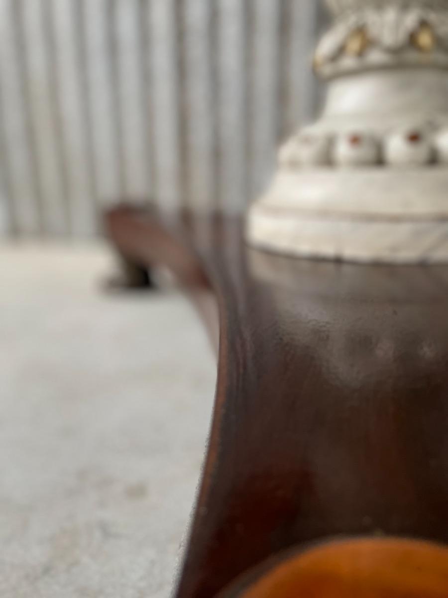 Massief mahonie tafel met gemarmerde centrale poot, vergulde details, acanthusblad. Mahonie driespant gedragen door polychroom verniste klauwpoot. Louis XVI - Empire