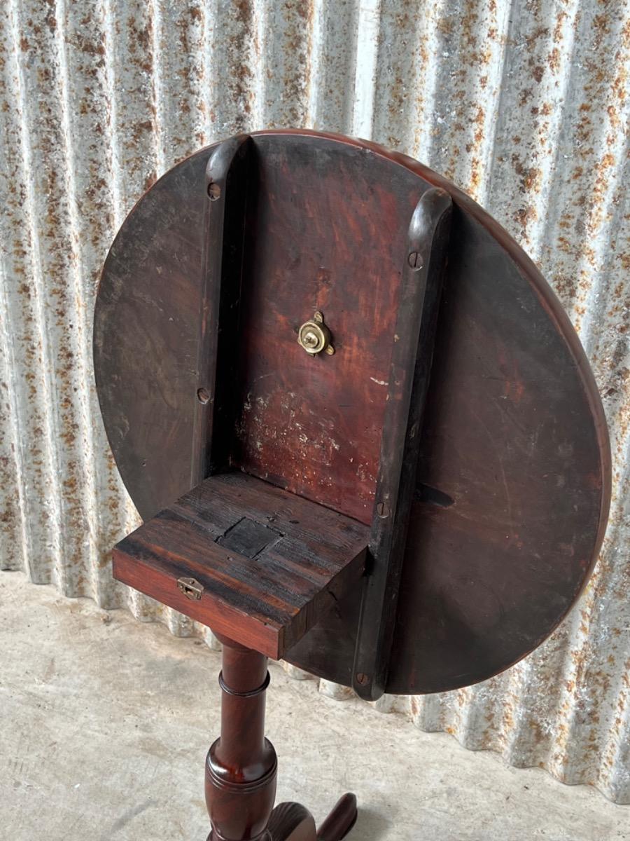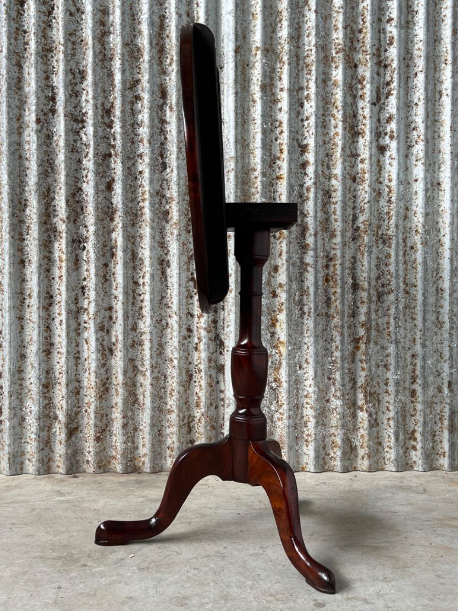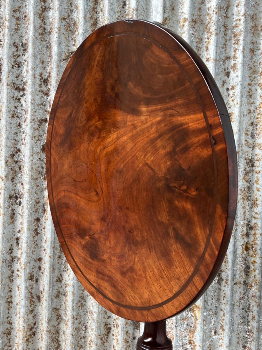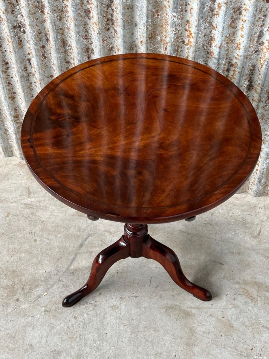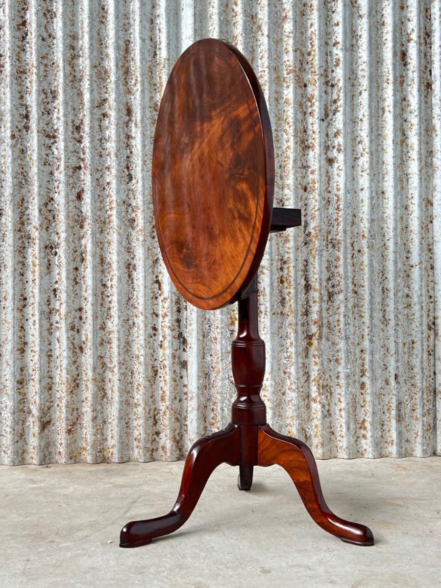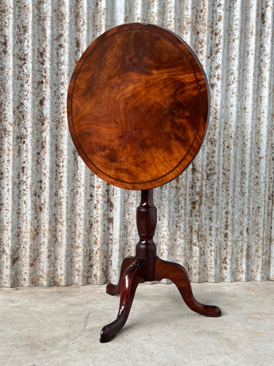 Uitzonderlijk mooie Georgian ‘Tilt top table’ in verrassend mooie staat. Op klapbaar dik massief blad met fraaie tekening, rustend op een gedraaide centrale poot dat qua model direct als 3e kwart 18e eeuw is te herkennen.