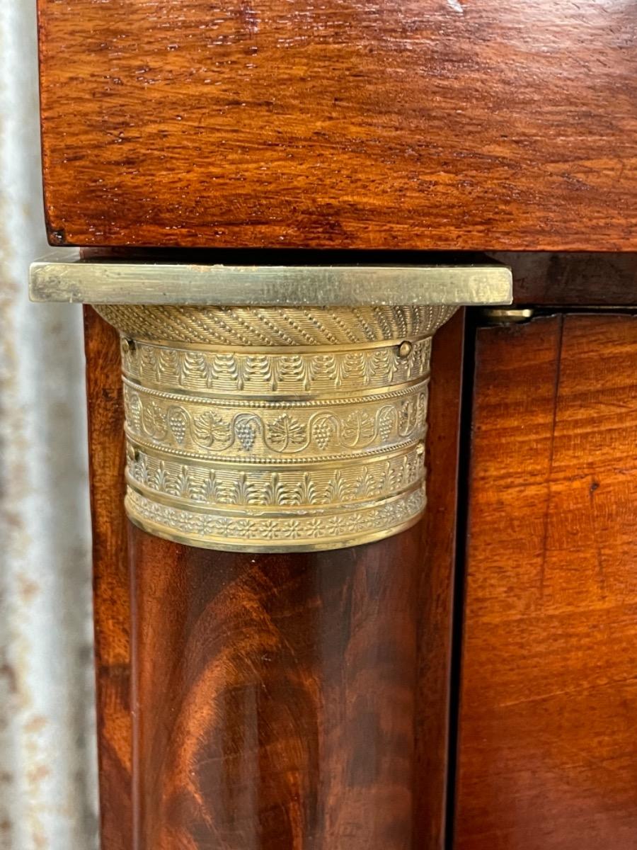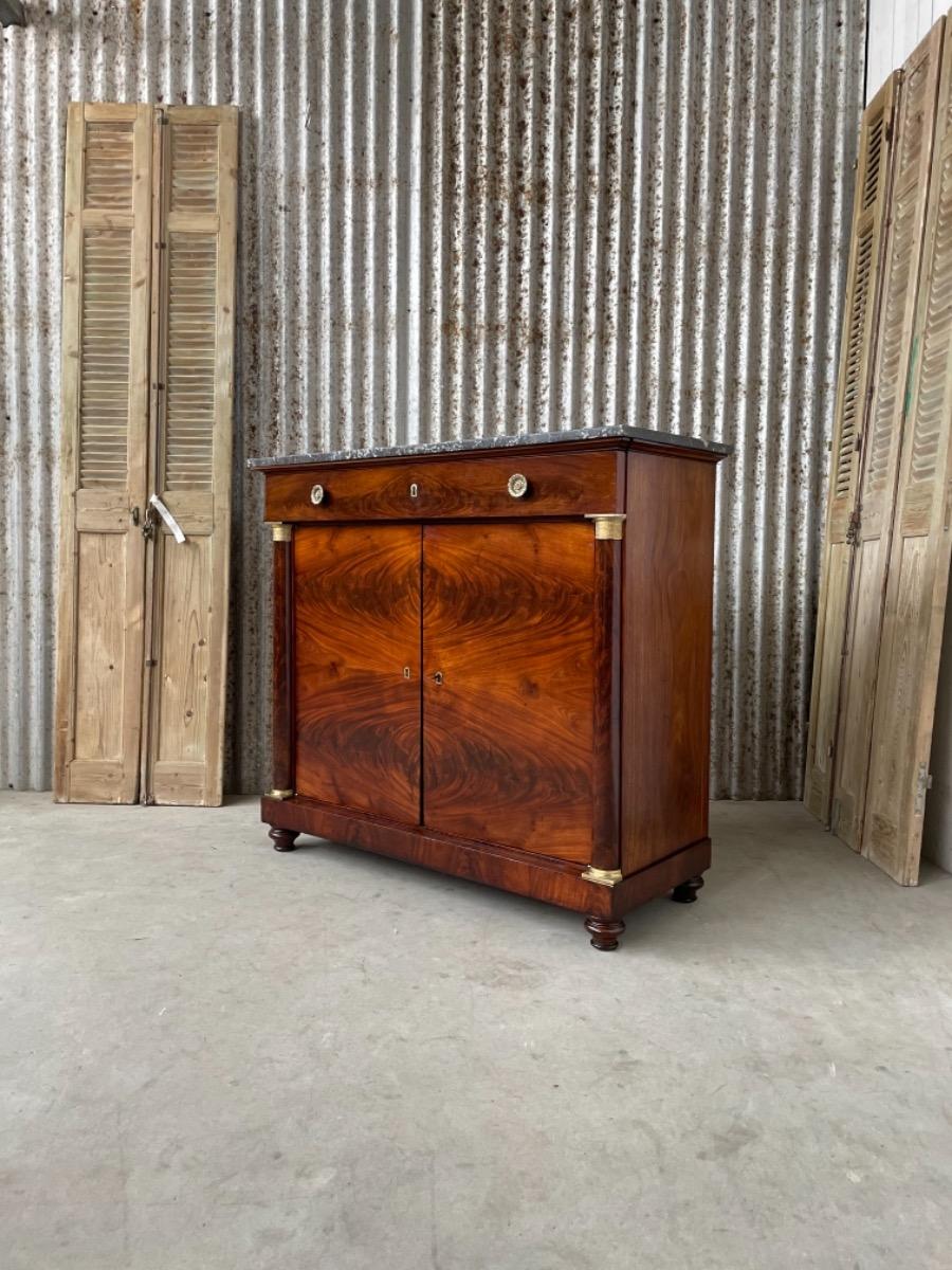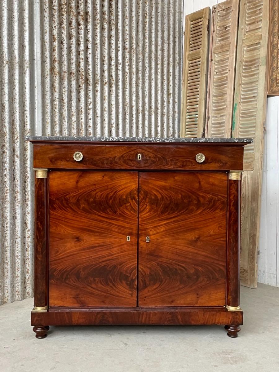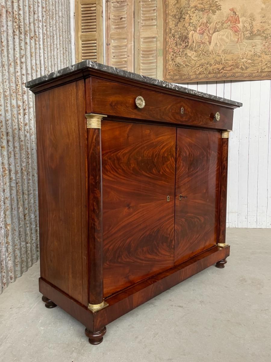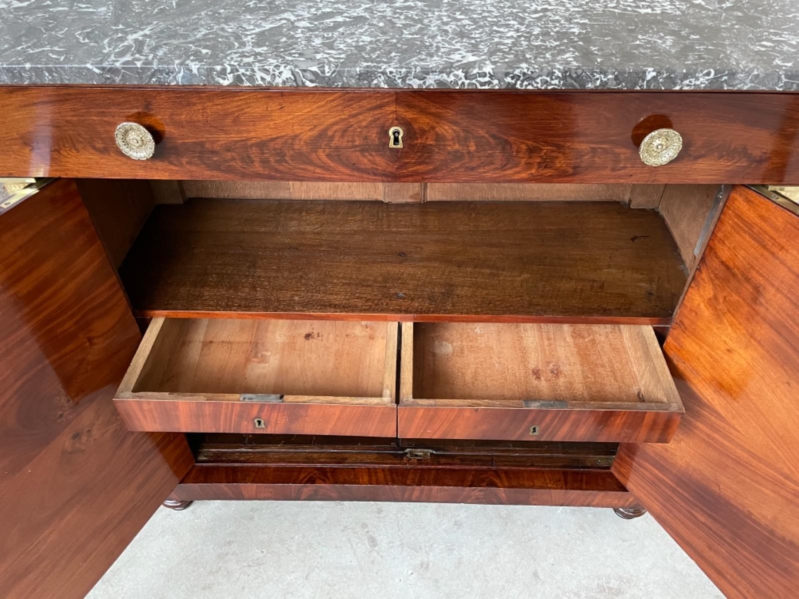 Mahonie epoque empire dressoir, lade in de kap en intern twee laden. St.Anna marmer gedekt. Half volle pilaren met vuur verguld messing kapitelen.