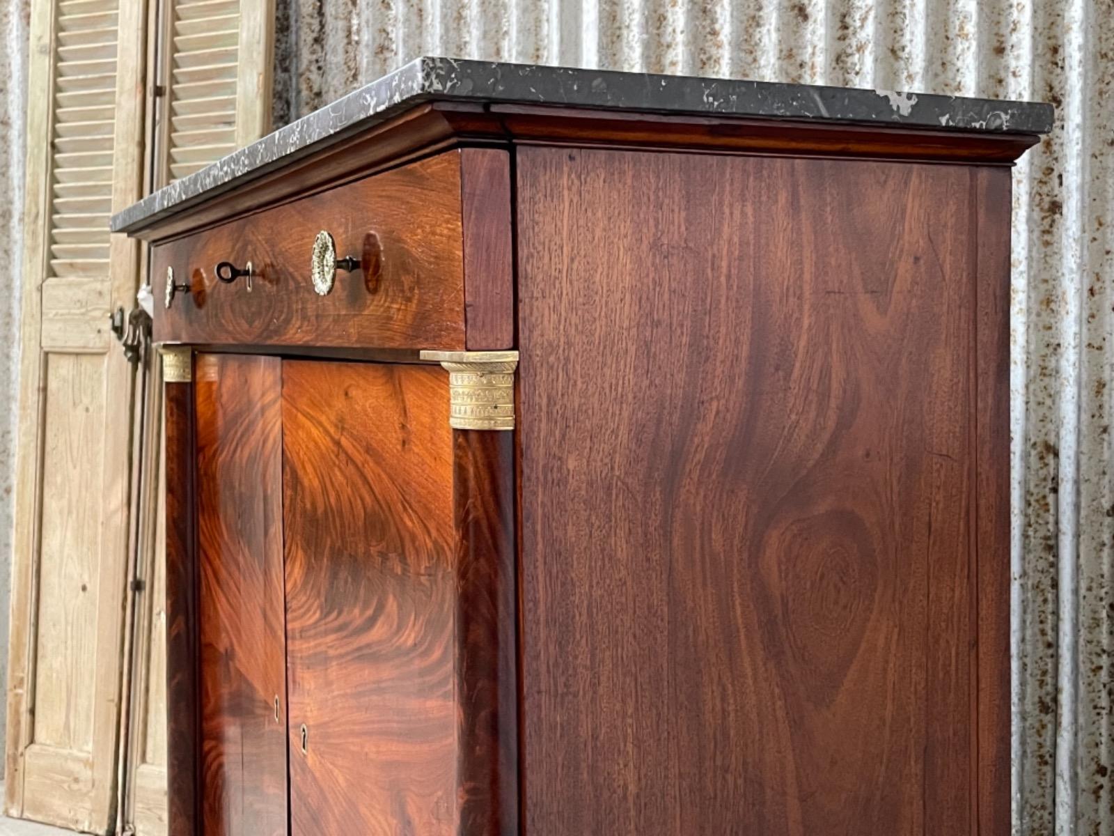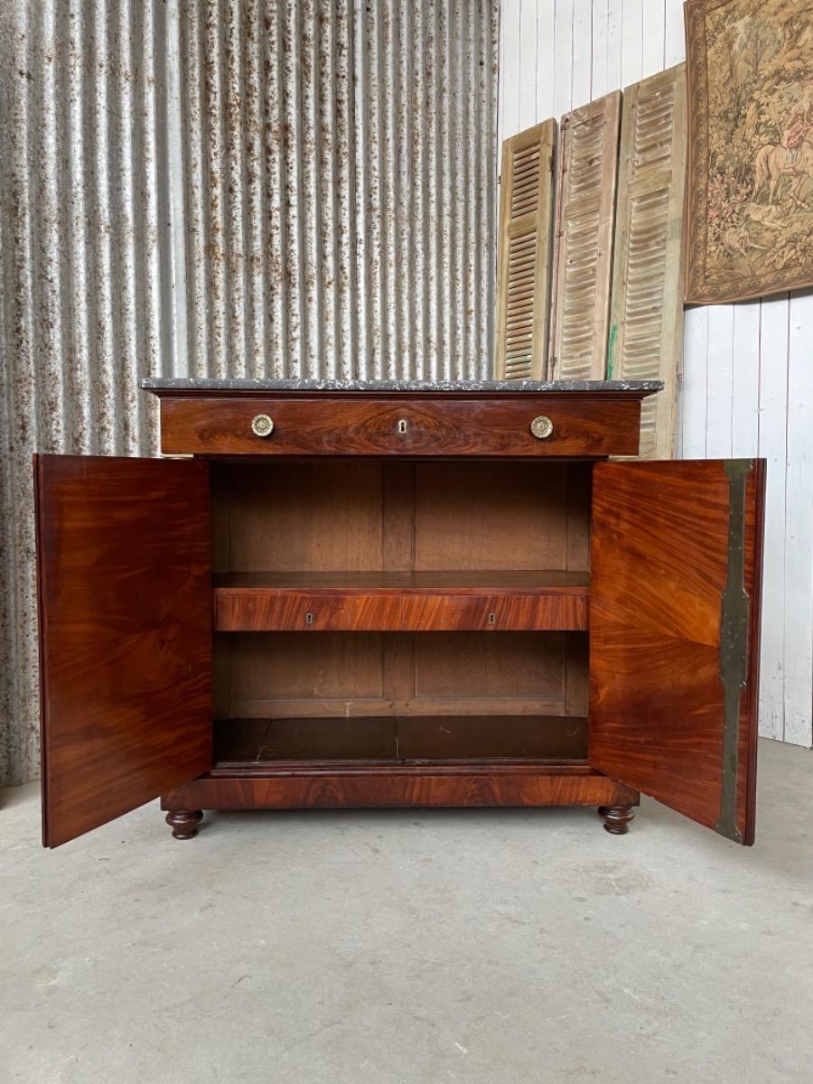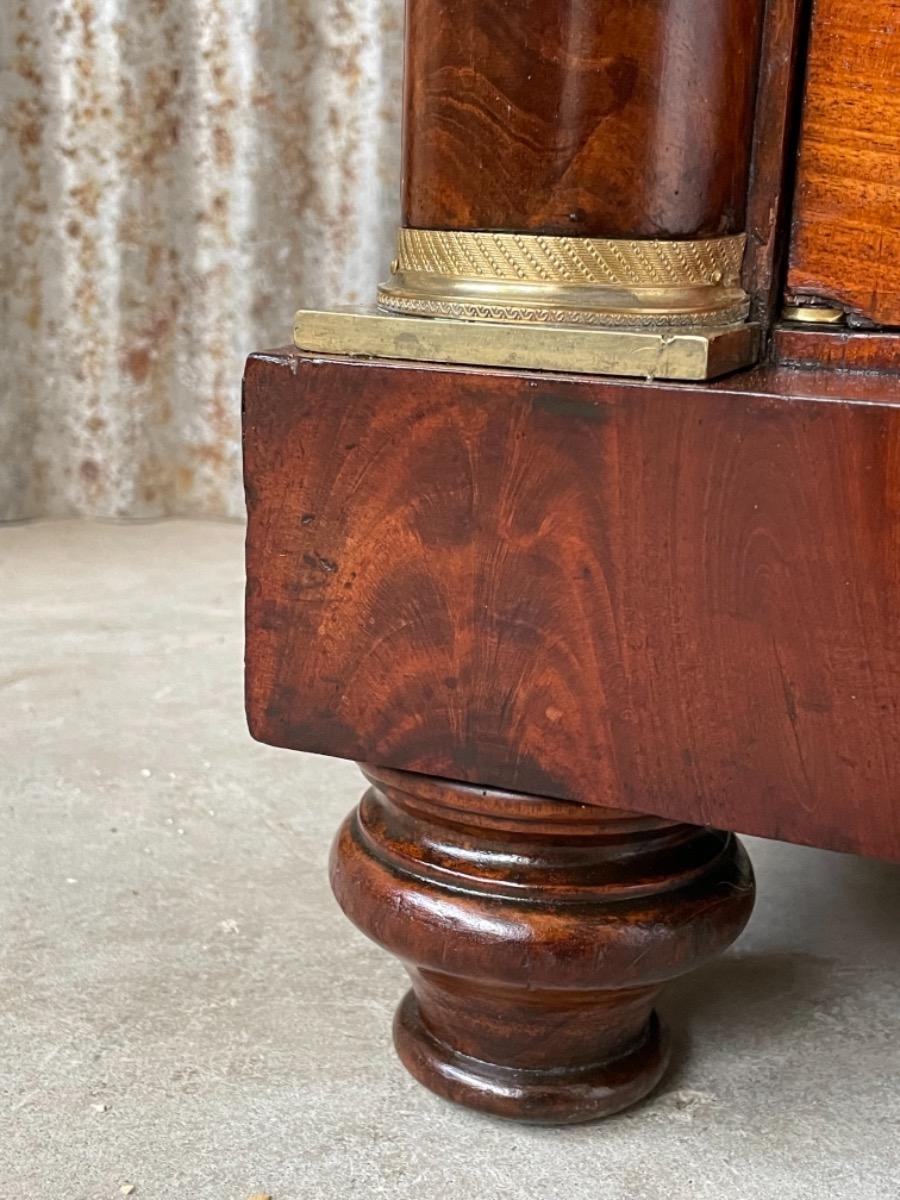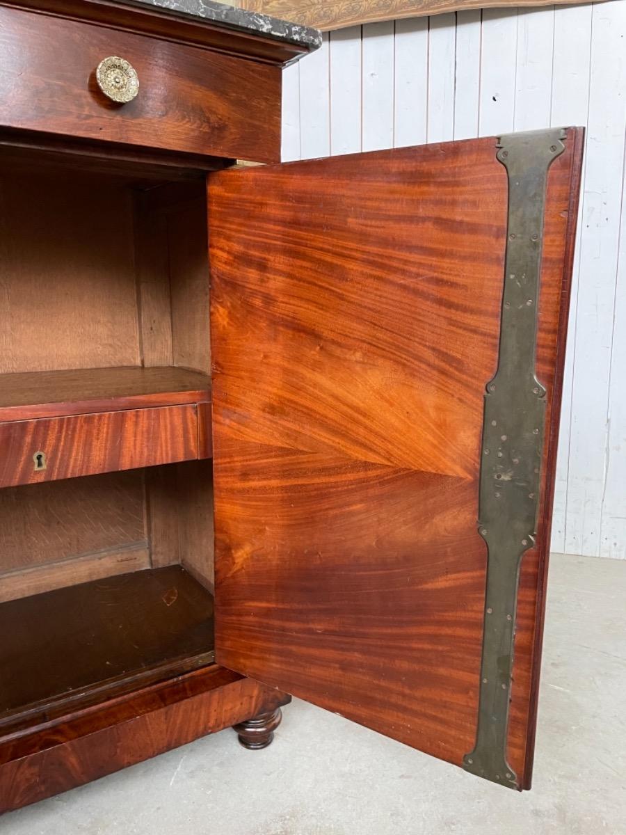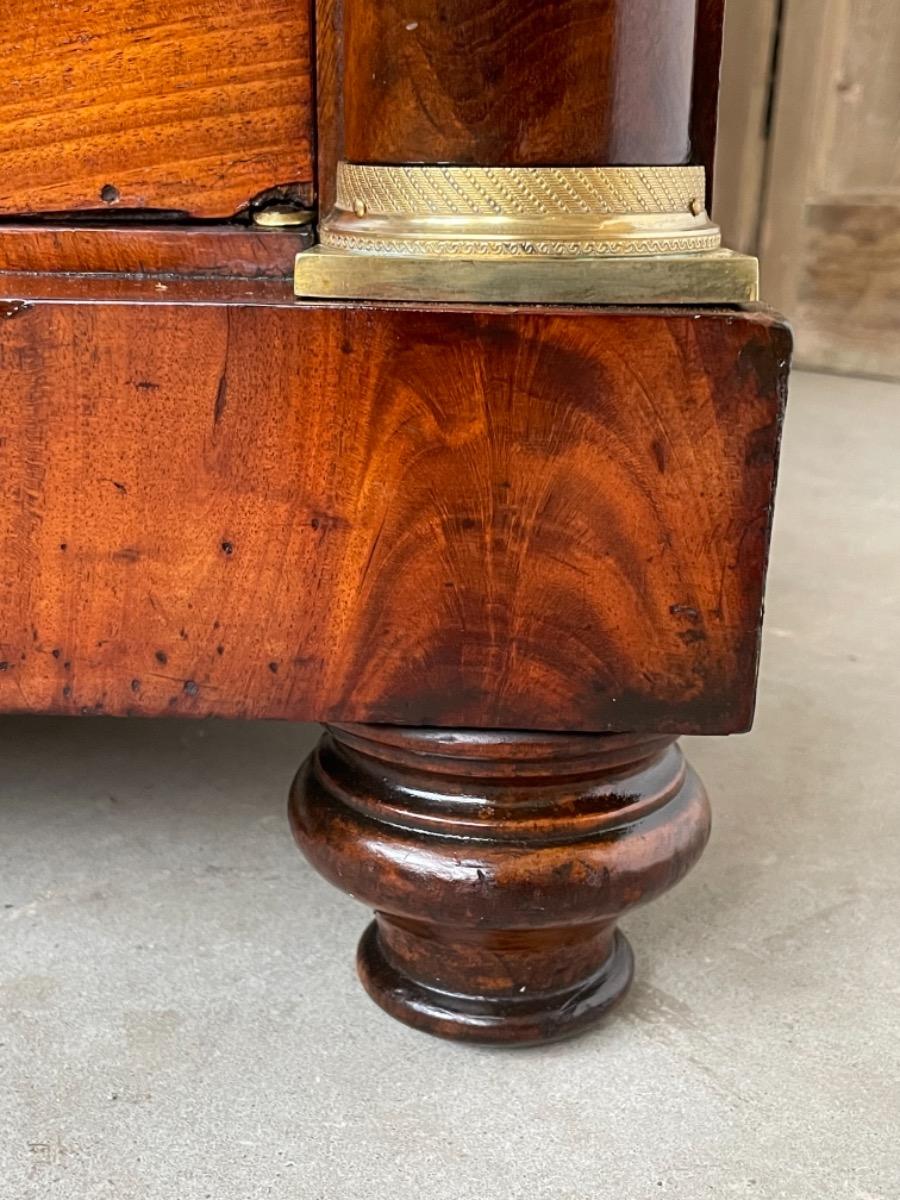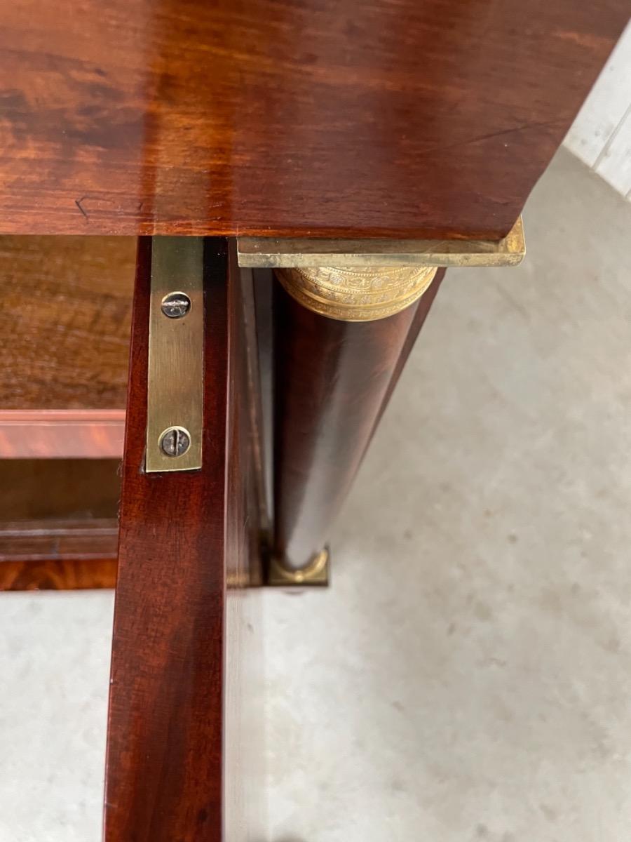 Mahonie epoque empire dressoir, lade in de kap en intern twee laden. St.Anna marmer gedekt. Half volle pilaren met vuur verguld messing kapitelen.