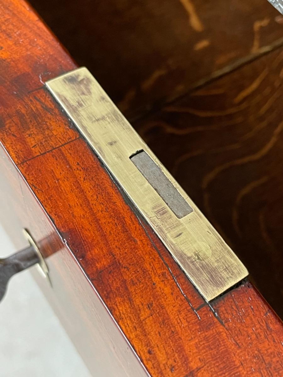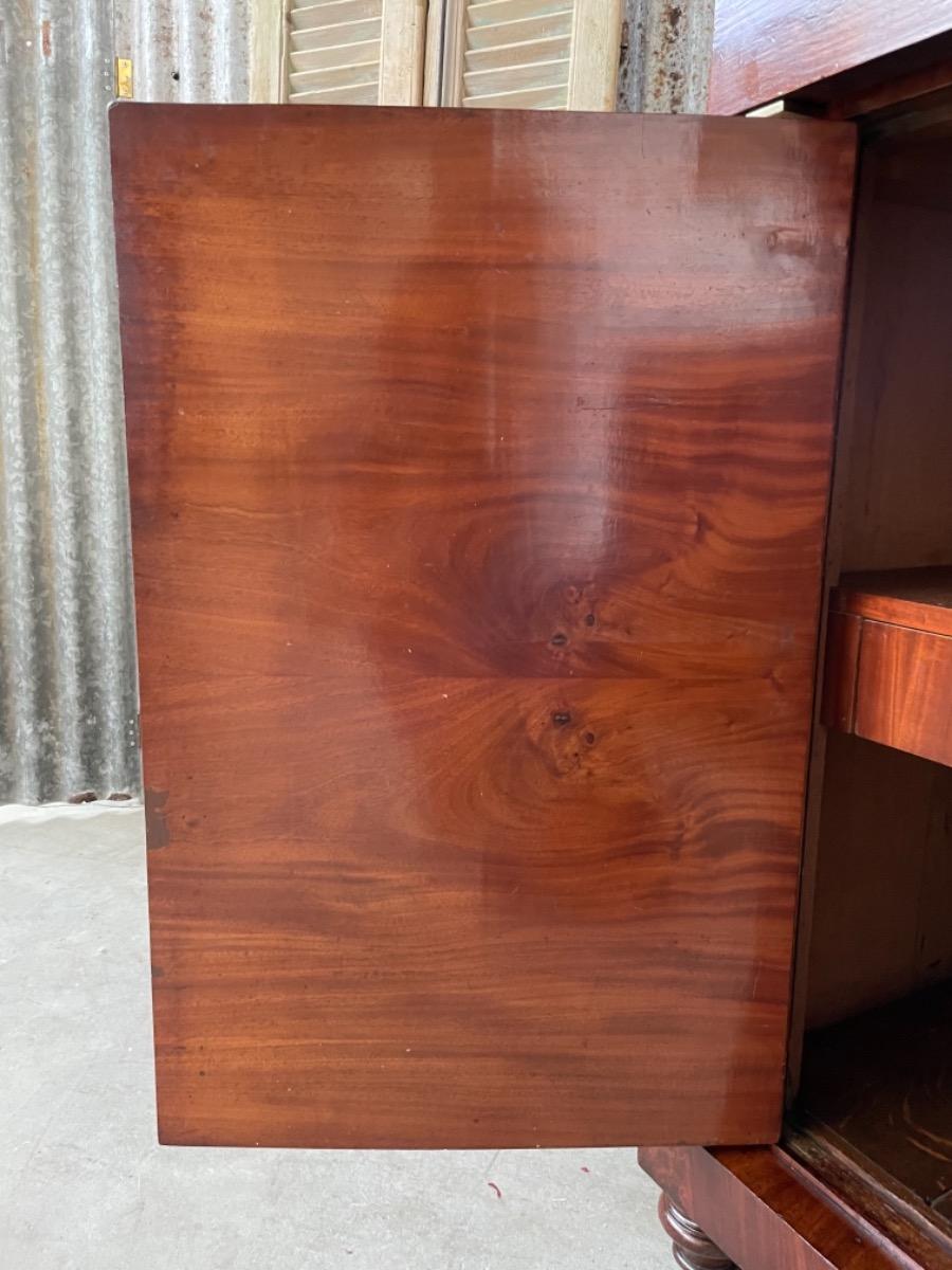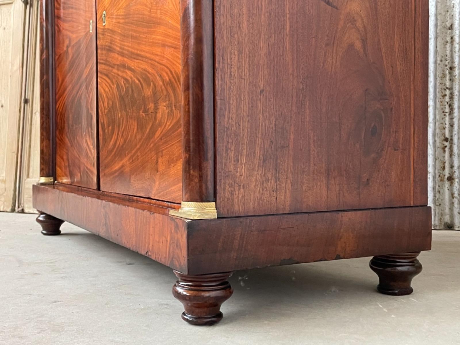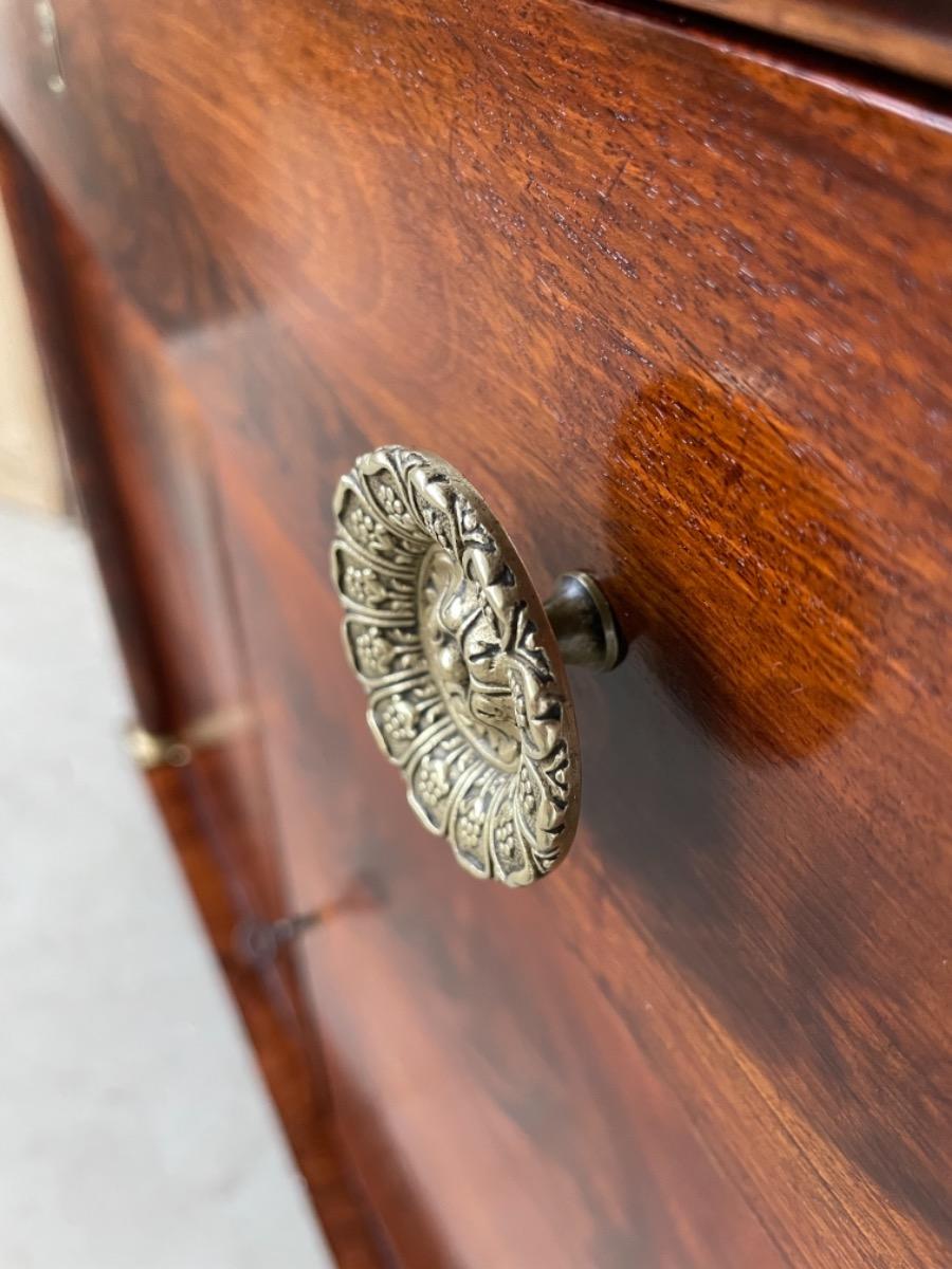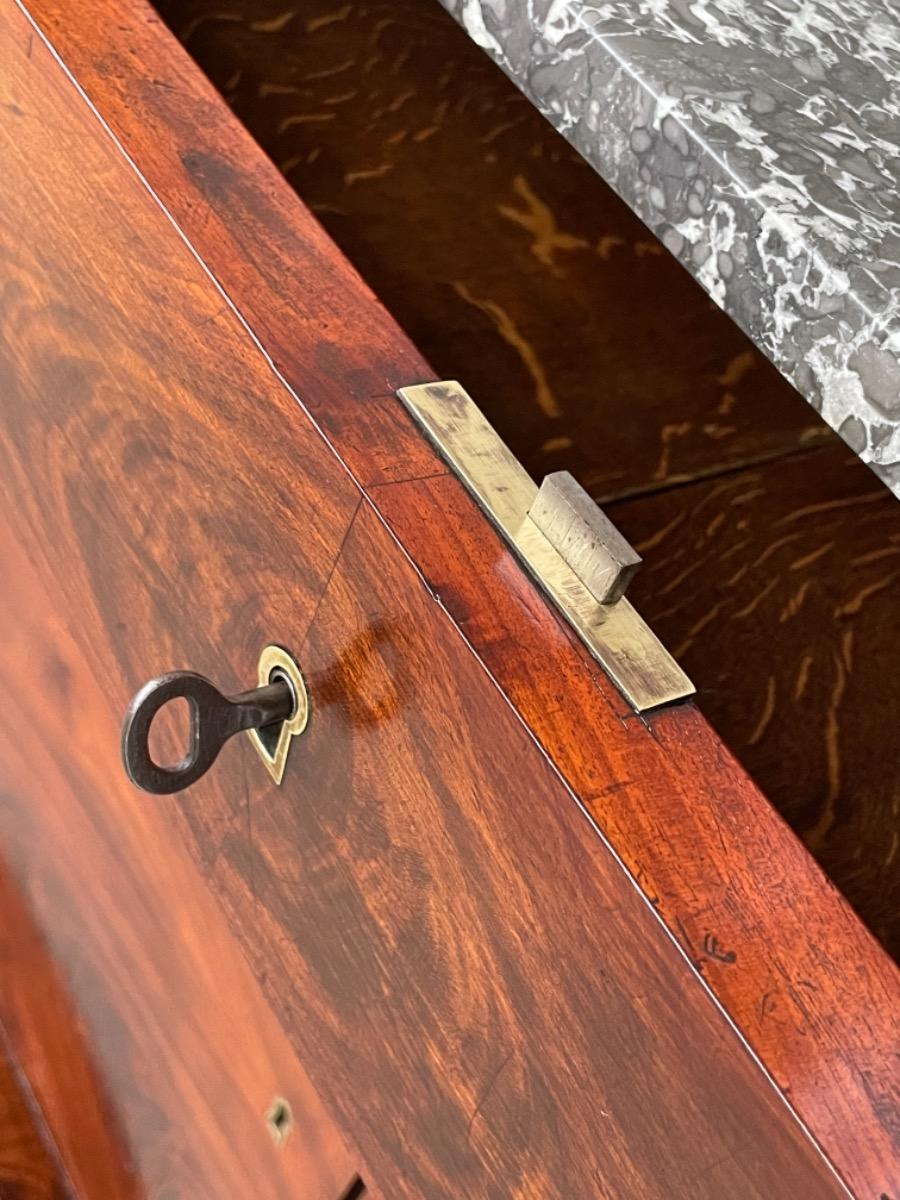 Mahonie epoque empire dressoir, lade in de kap en intern twee laden. St.Anna marmer gedekt. Half volle pilaren met vuur verguld messing kapitelen.