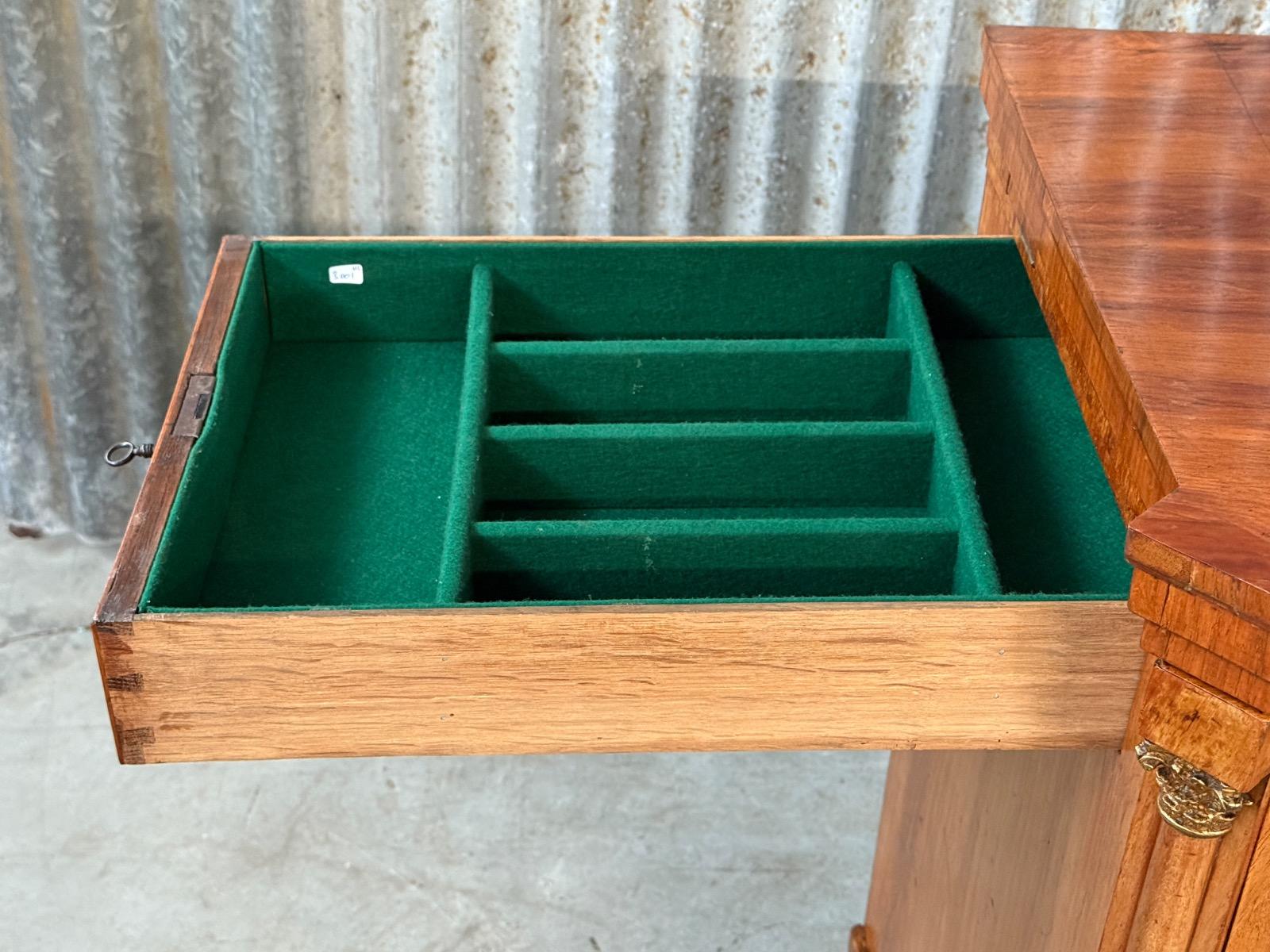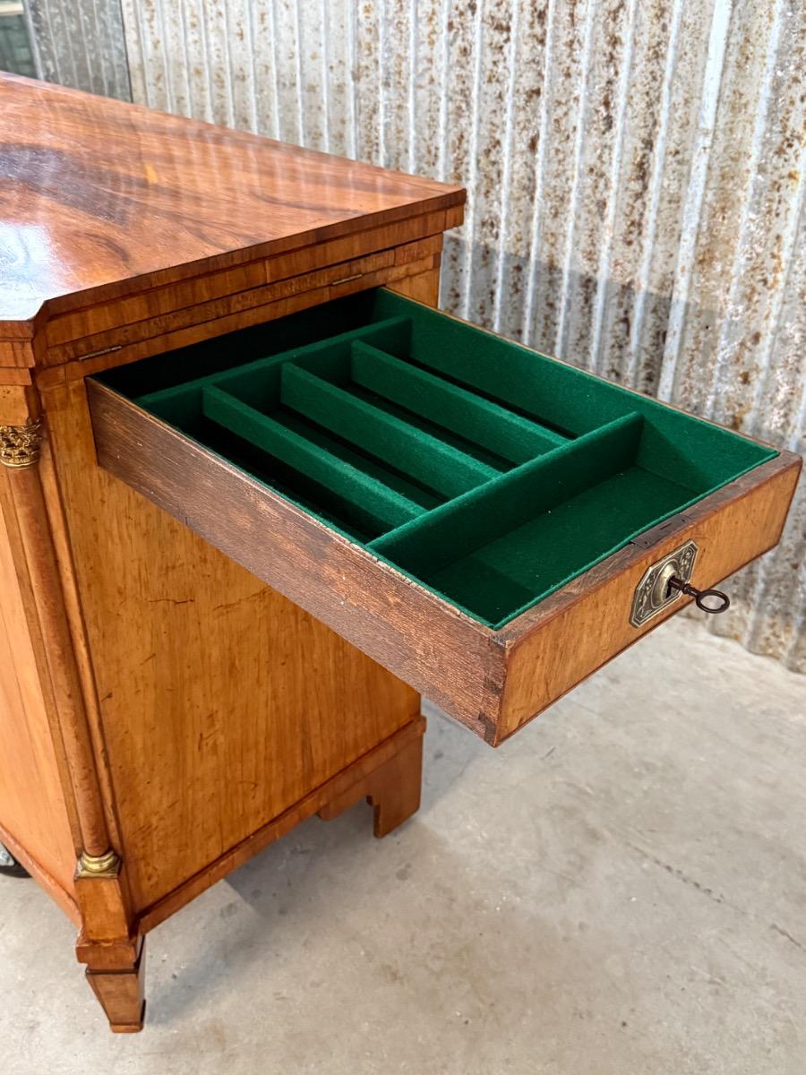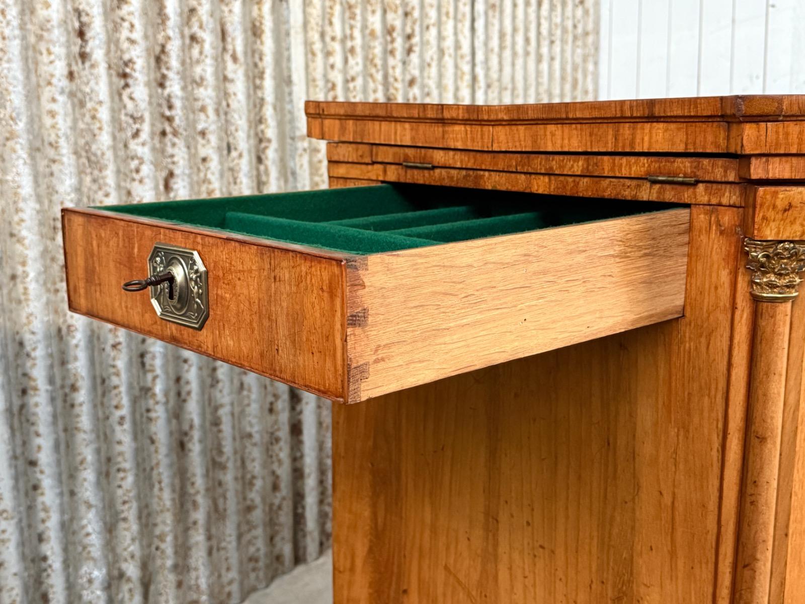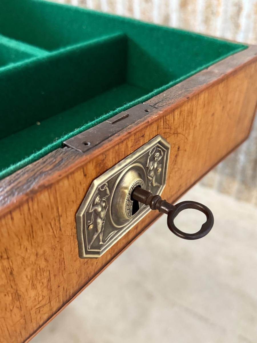Onder het opklapbare blad, twee uitvouw bladen die rusten op de laden die zijwaards uit het meubel te trekken zijn. Deze zijn met groen vilt belijmd en ogen fris. Ook de binnen kast is netjes en schoon.