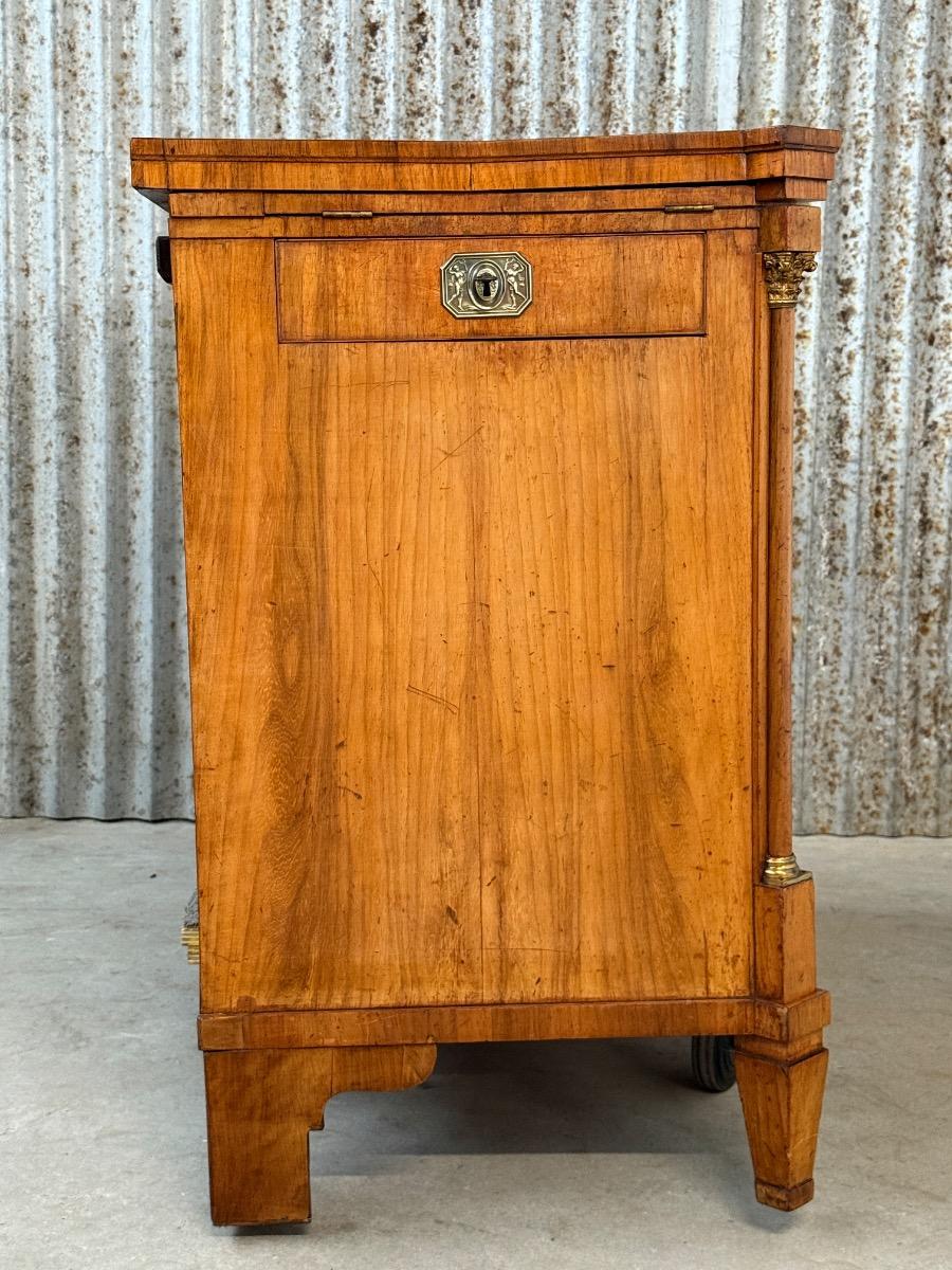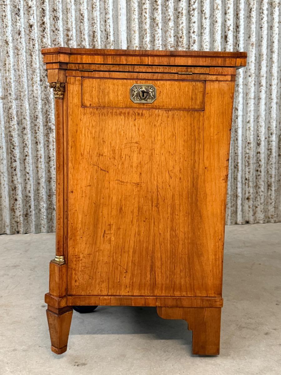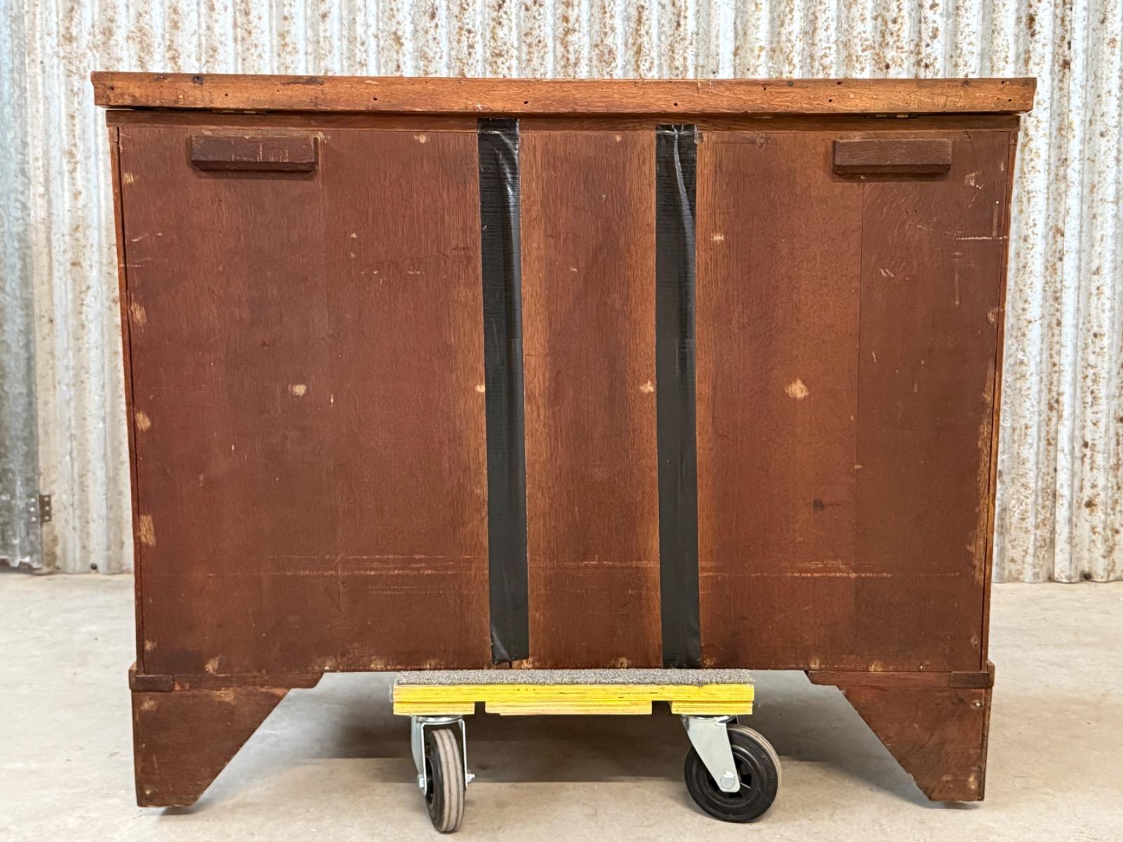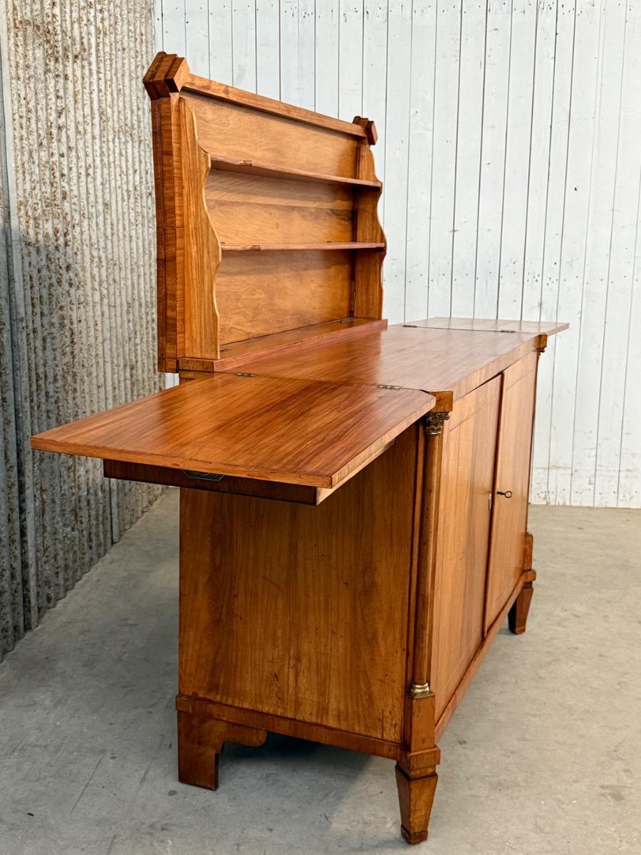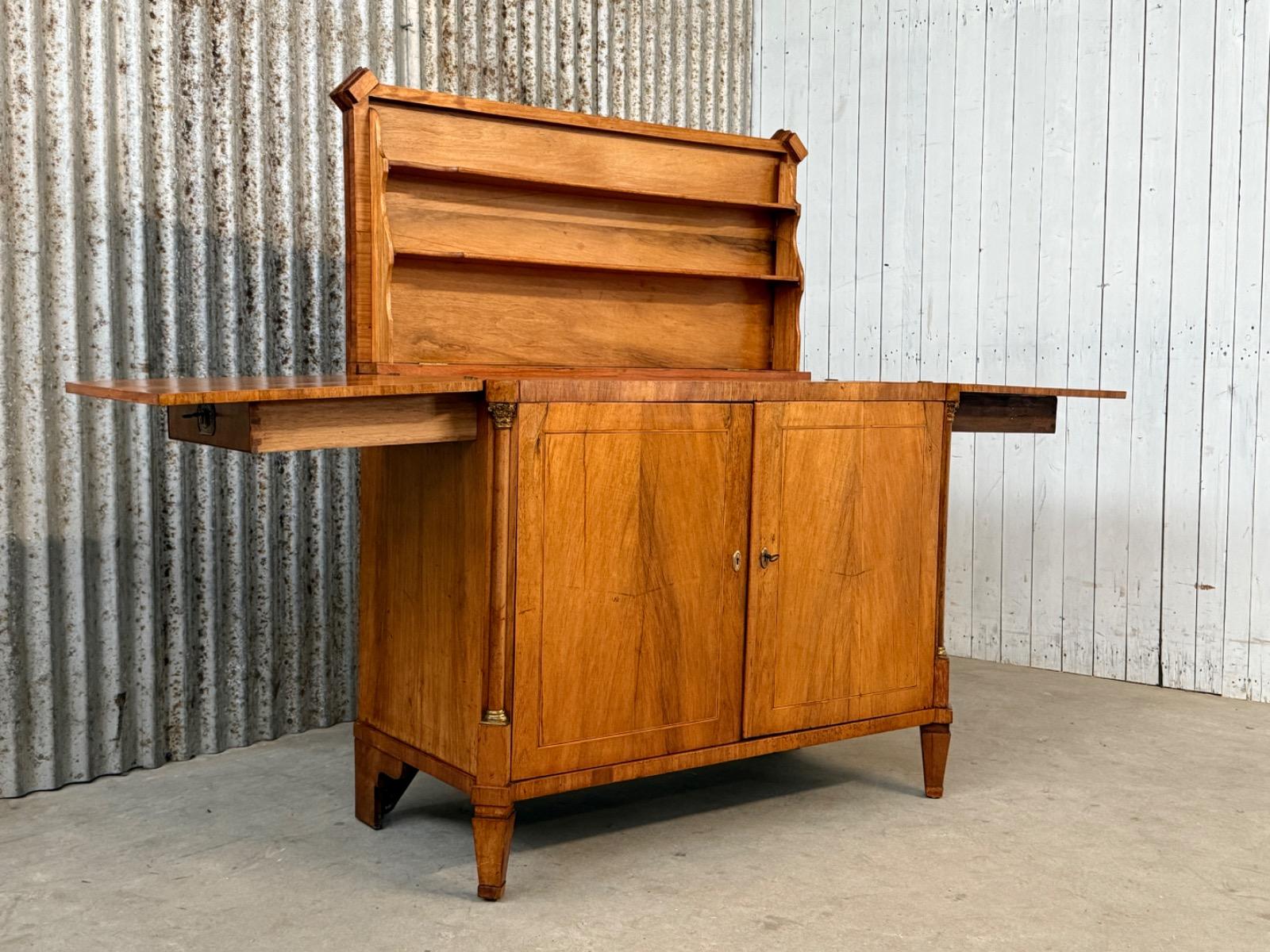 Onder het opklapbare blad, twee uitvouw bladen die rusten op de laden die zijwaards uit het meubel te trekken zijn. Deze zijn met groen vilt belijmd en ogen fris. Ook de binnen kast is netjes en schoon.