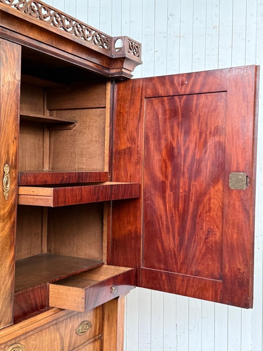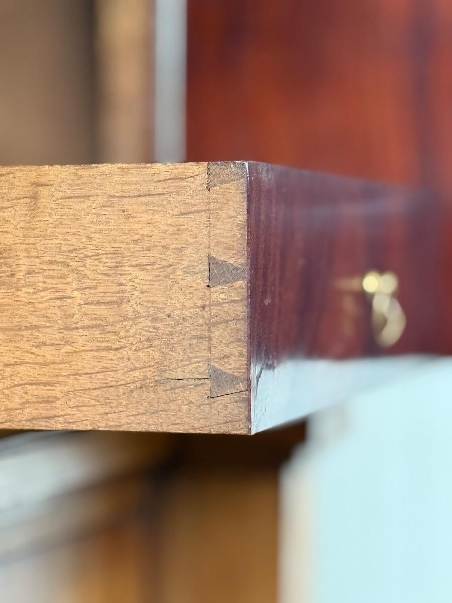 Bloem mahonie op eikenhout gefineerd, achterwand oorspronkelijk en compleet. Drie brede laden in de onderkast geflankeerd door twee volle vierkantige pilaren.