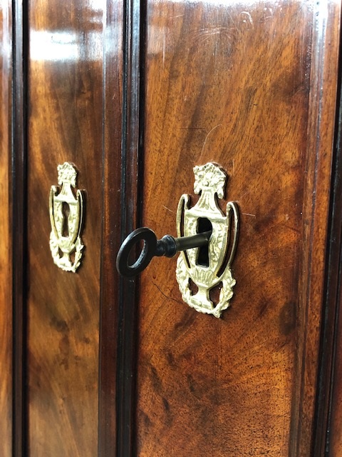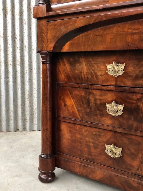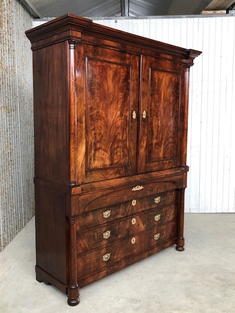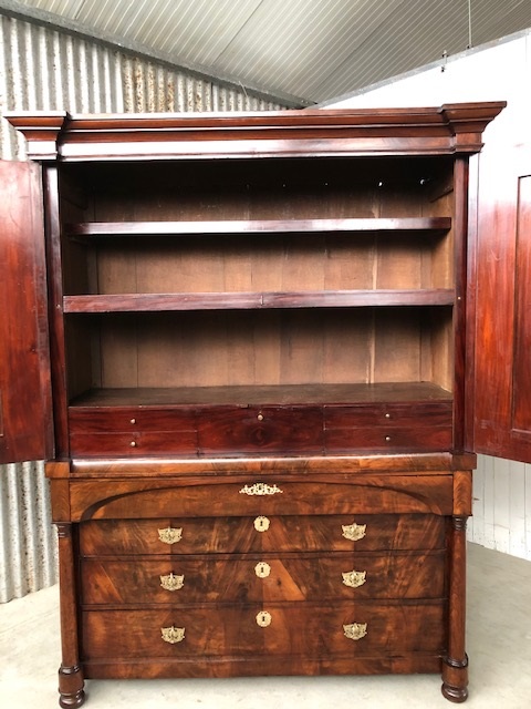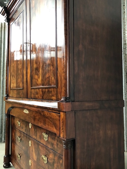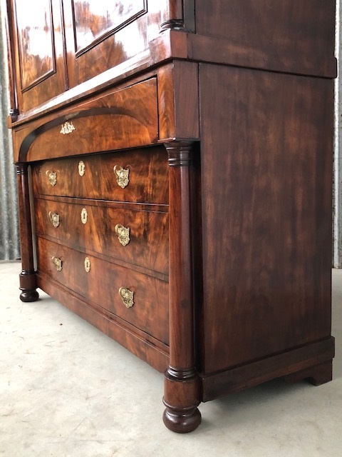 Bloem mahonie op eikenhout gefineerd, achterwand oorspronkelijk en compleet. 4 laden in de onderkast geflankeerd door twee volle pilaren. 5 laden in bovenkast achter de twee paneel deuren. Slot en werkende sleutel in deur.