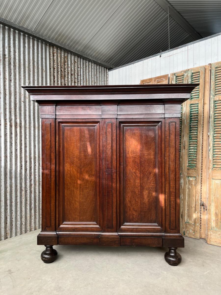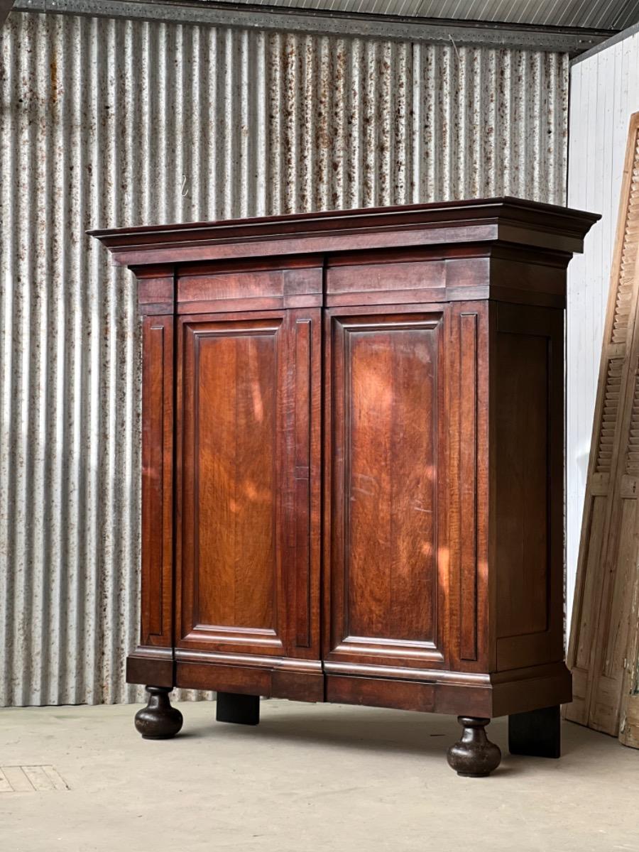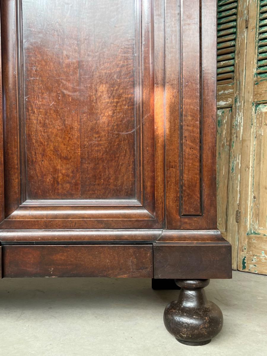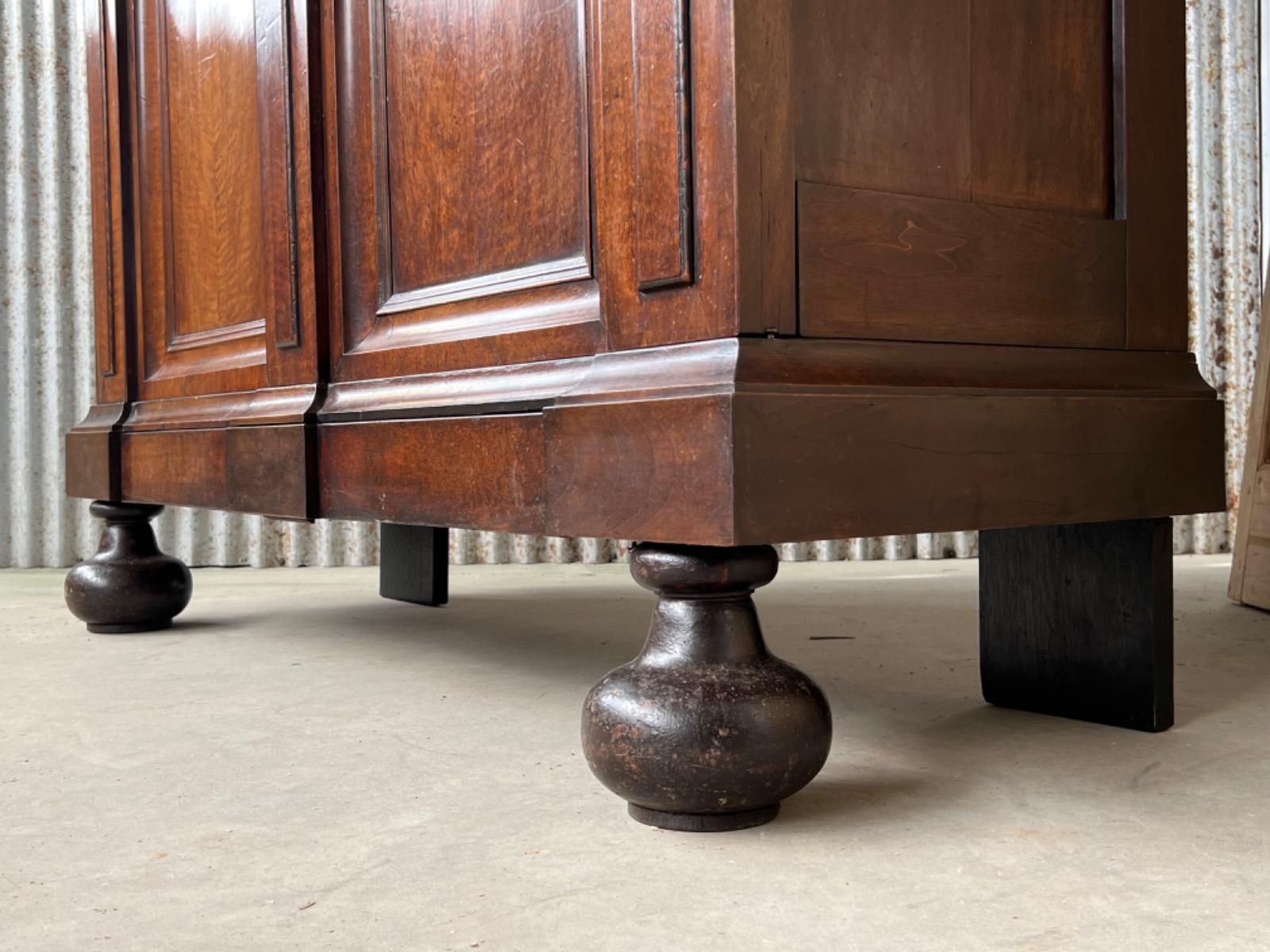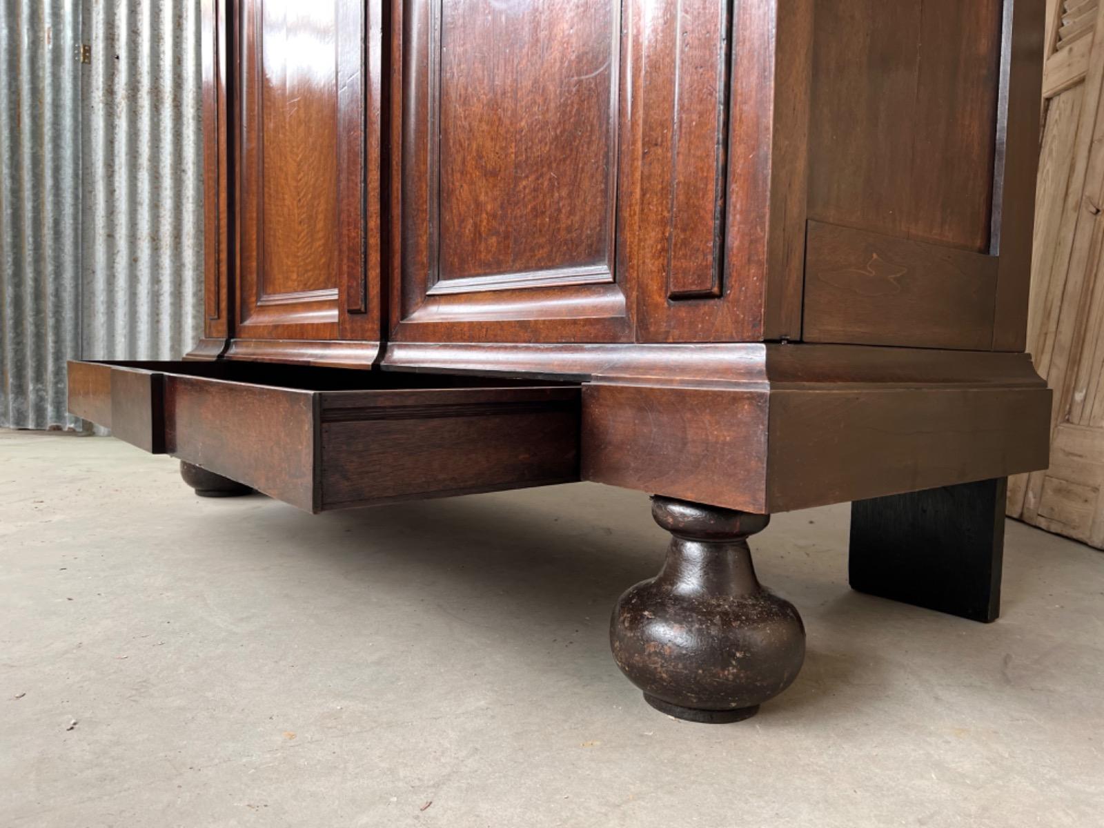 Notenhouten Notaris of Pastoors kast. 2e-3e kwart 18e eeuw. Grote overhangende en rijk geprofileerde kap met daaronder twee flinke deuren met evenals de zijden een panel. Achter de deuren 3 vaste en getoogde planken met midden 2 (bestek) laden. Tussen de tweed bolpoten een verborgen of blinde lade. Slot en sleutel oorspronkelijk en werkend. Sleutel entre verborgen in middenstijl. Zeer fraaie warme was patina. Holland Ca. 1740 - 1760 Afm: H= 199,5 cm B= 159 - 191 cm D= 55 - 72 cm Not-2330~