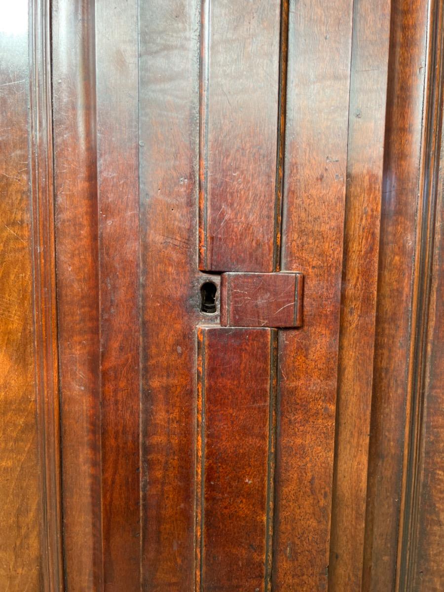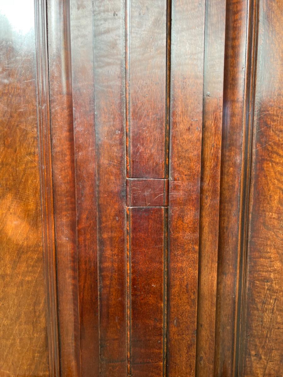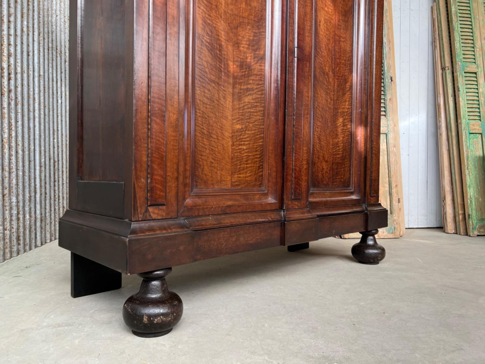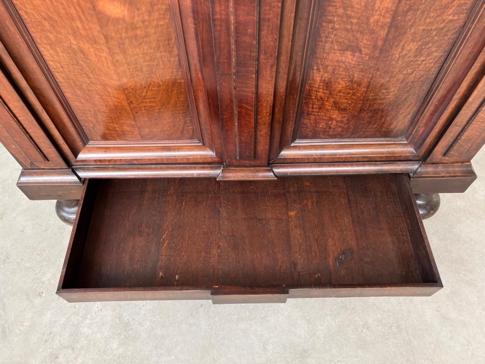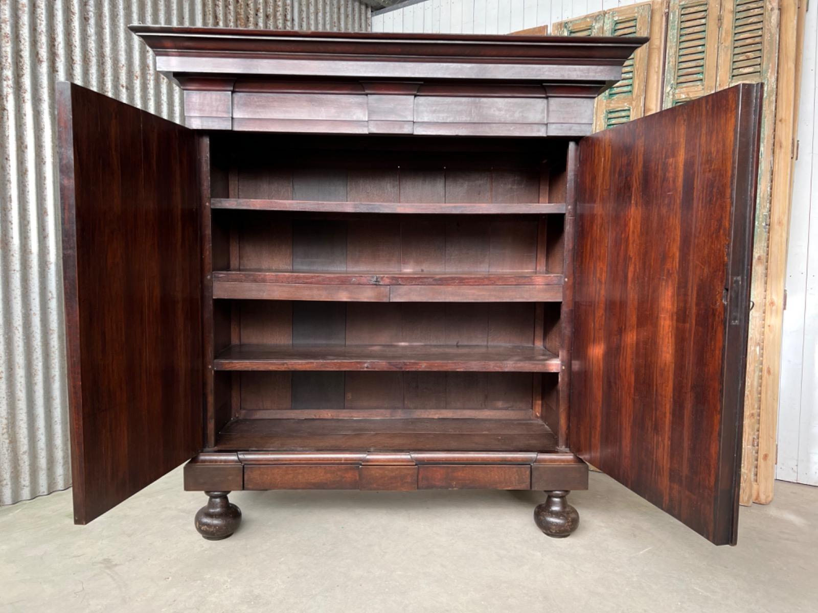 Notenhouten Notaris of Pastoors kast. 2e-3e kwart 18e eeuw. Grote overhangende en rijk geprofileerde kap met daaronder twee flinke deuren met evenals de zijden een panel. Achter de deuren 3 vaste en getoogde planken met midden 2 (bestek) laden. Tussen de tweed bolpoten een verborgen of blinde lade. Slot en sleutel oorspronkelijk en werkend. Sleutel entre verborgen in middenstijl. Zeer fraaie warme was patina. Holland Ca. 1740 - 1760 Afm: H= 199,5 cm B= 159 - 191 cm D= 55 - 72 cm Not-2330~