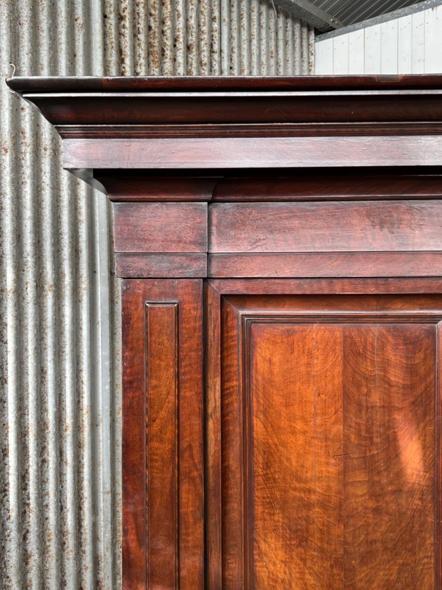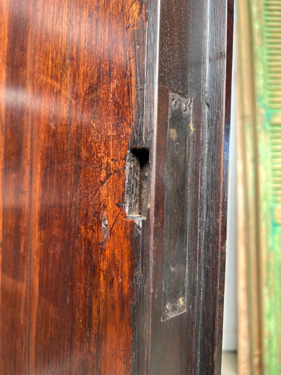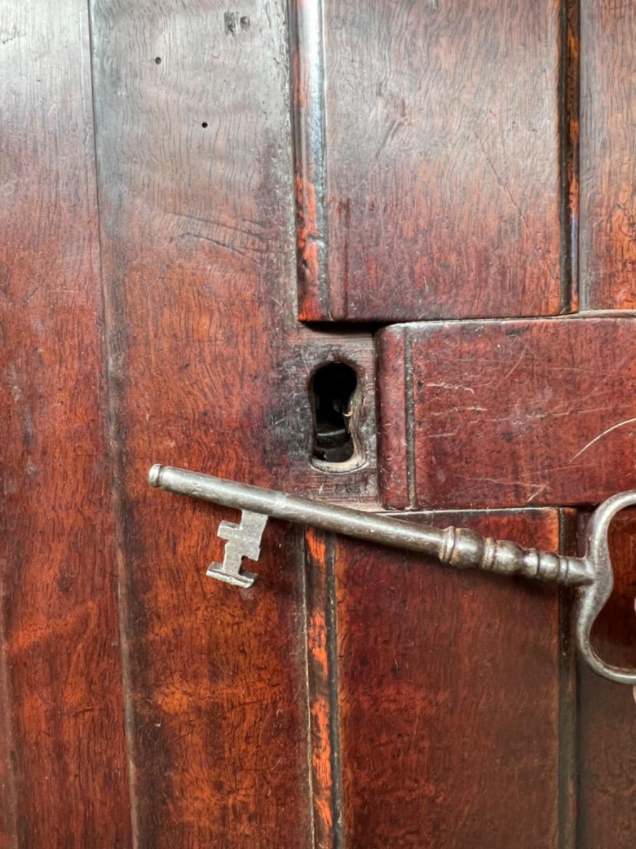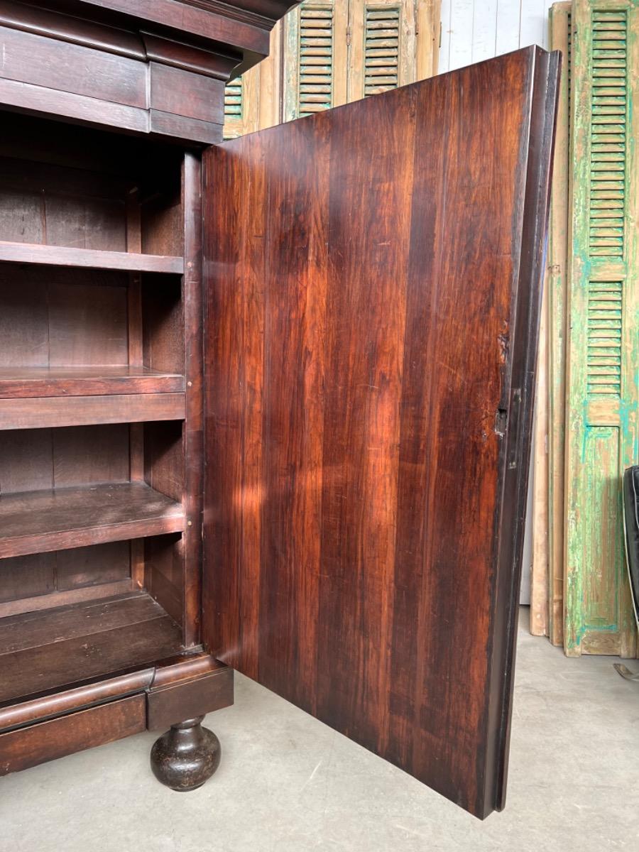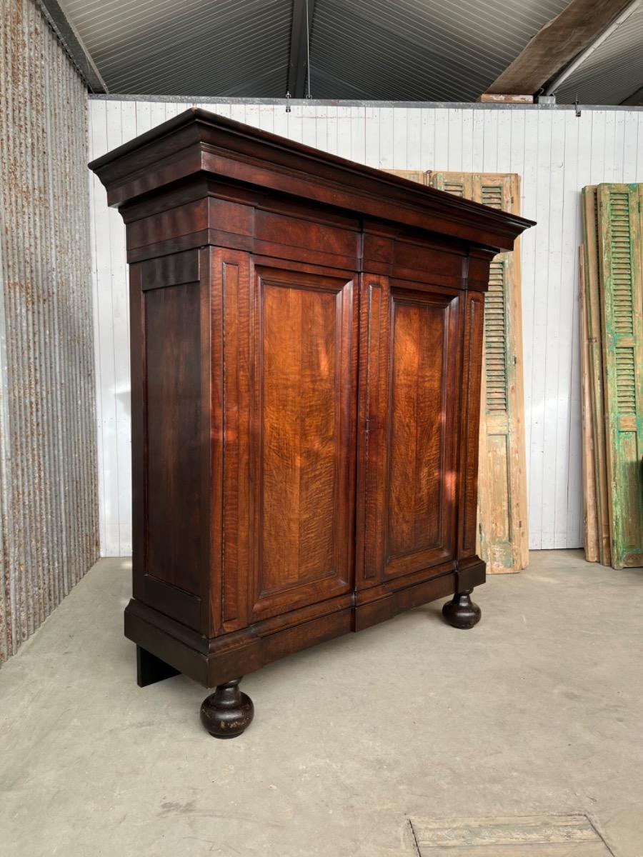 Notenhouten Notaris of Pastoors kast. 2e-3e kwart 18e eeuw. Grote overhangende en rijk geprofileerde kap met daaronder twee flinke deuren met evenals de zijden een panel. Achter de deuren 3 vaste en getoogde planken met midden 2 (bestek) laden. Tussen de tweed bolpoten een verborgen of blinde lade. Slot en sleutel oorspronkelijk en werkend. Sleutel entre verborgen in middenstijl. Zeer fraaie warme was patina. Holland Ca. 1740 - 1760 Afm: H= 199,5 cm B= 159 - 191 cm D= 55 - 72 cm Not-2330~