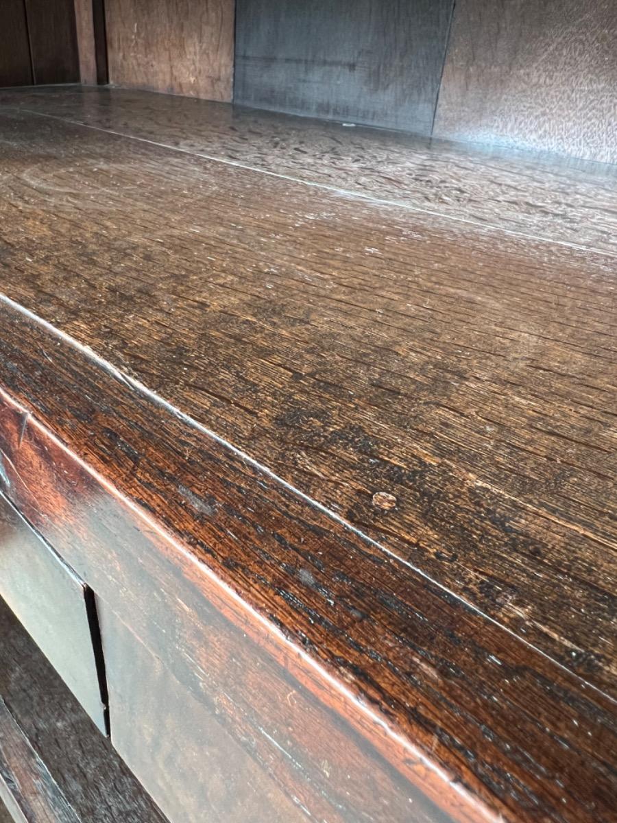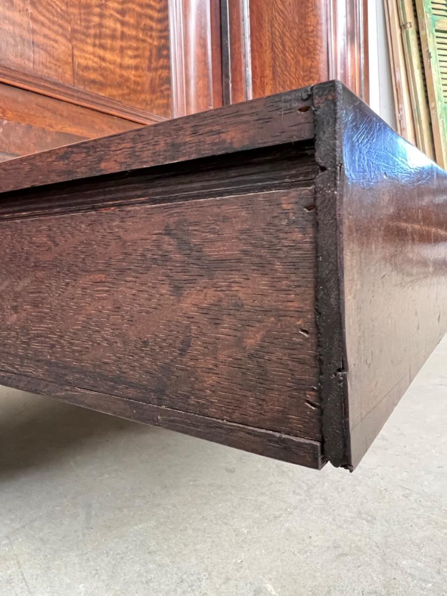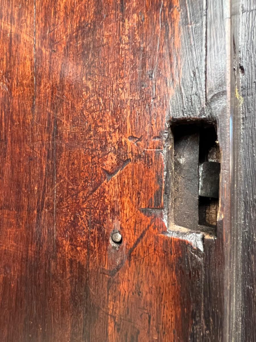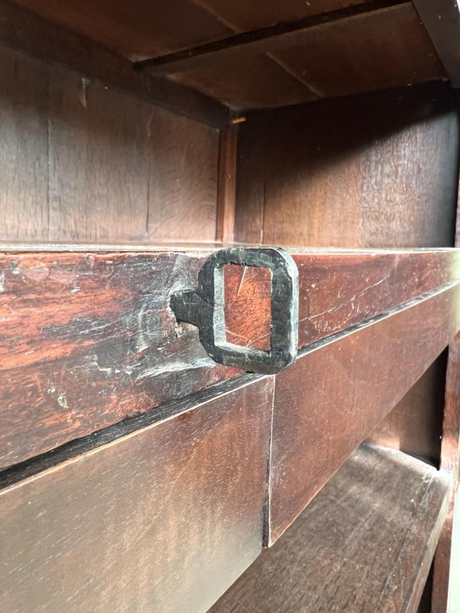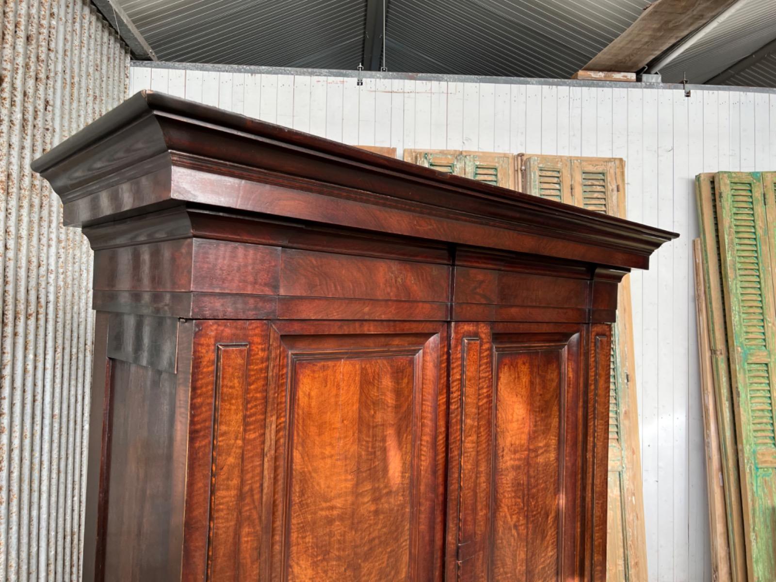Notenhouten Notaris of Pastoors kast. 2e-3e kwart 18e eeuw. Grote overhangende en rijk geprofileerde kap met daaronder twee flinke deuren met evenals de zijden een panel. Achter de deuren 3 vaste en getoogde planken met midden 2 (bestek) laden. Tussen de tweed bolpoten een verborgen of blinde lade. Slot en sleutel oorspronkelijk en werkend. Sleutel entre verborgen in middenstijl. Zeer fraaie warme was patina. Holland Ca. 1740 - 1760 Afm: H= 199,5 cm B= 159 - 191 cm D= 55 - 72 cm Not-2330~