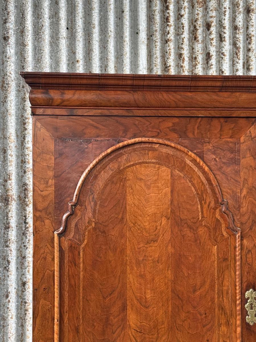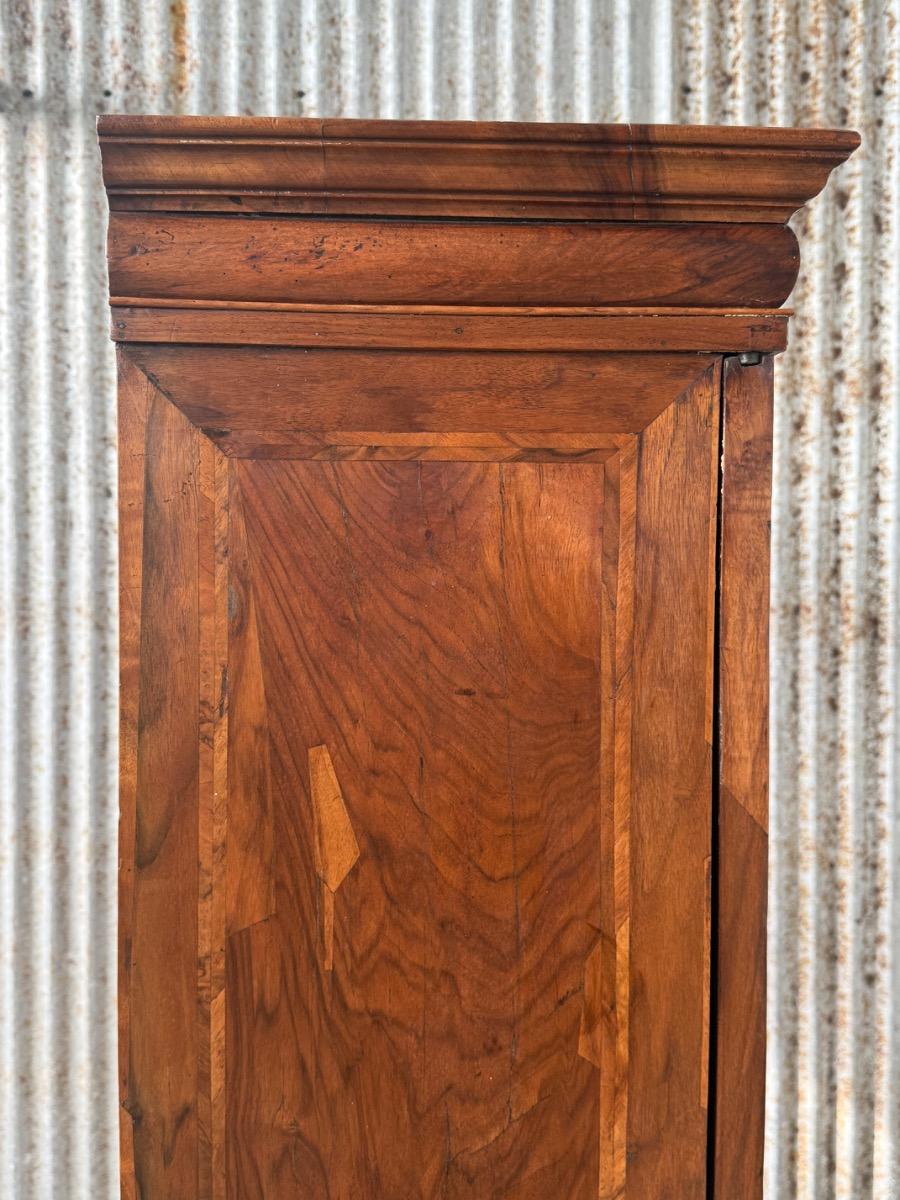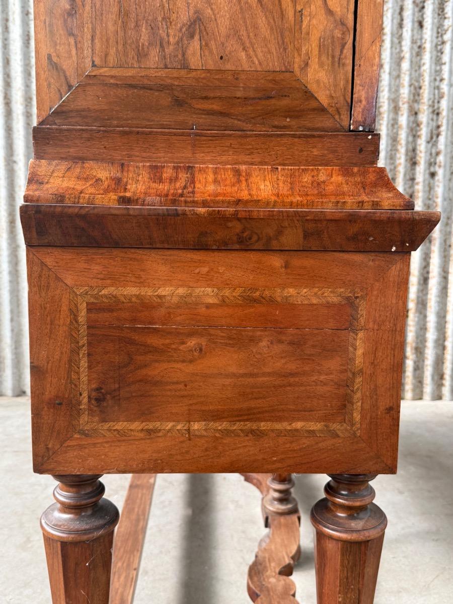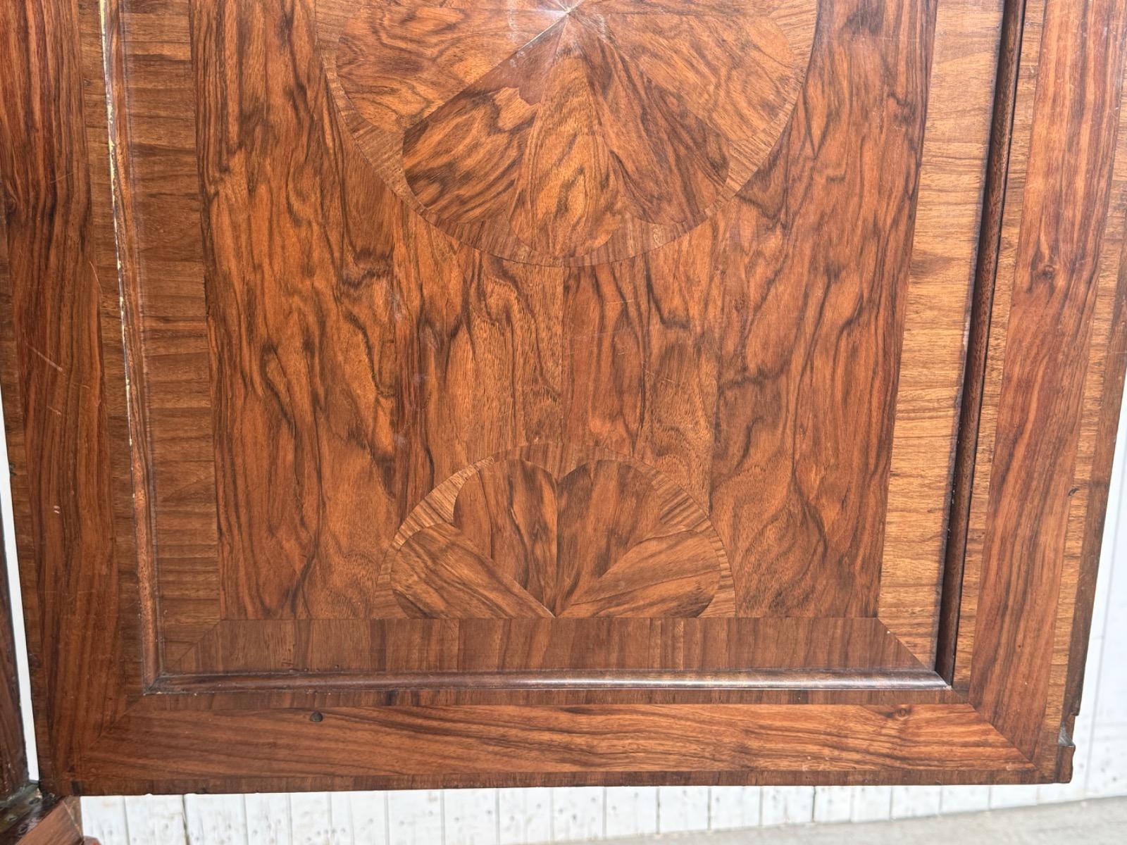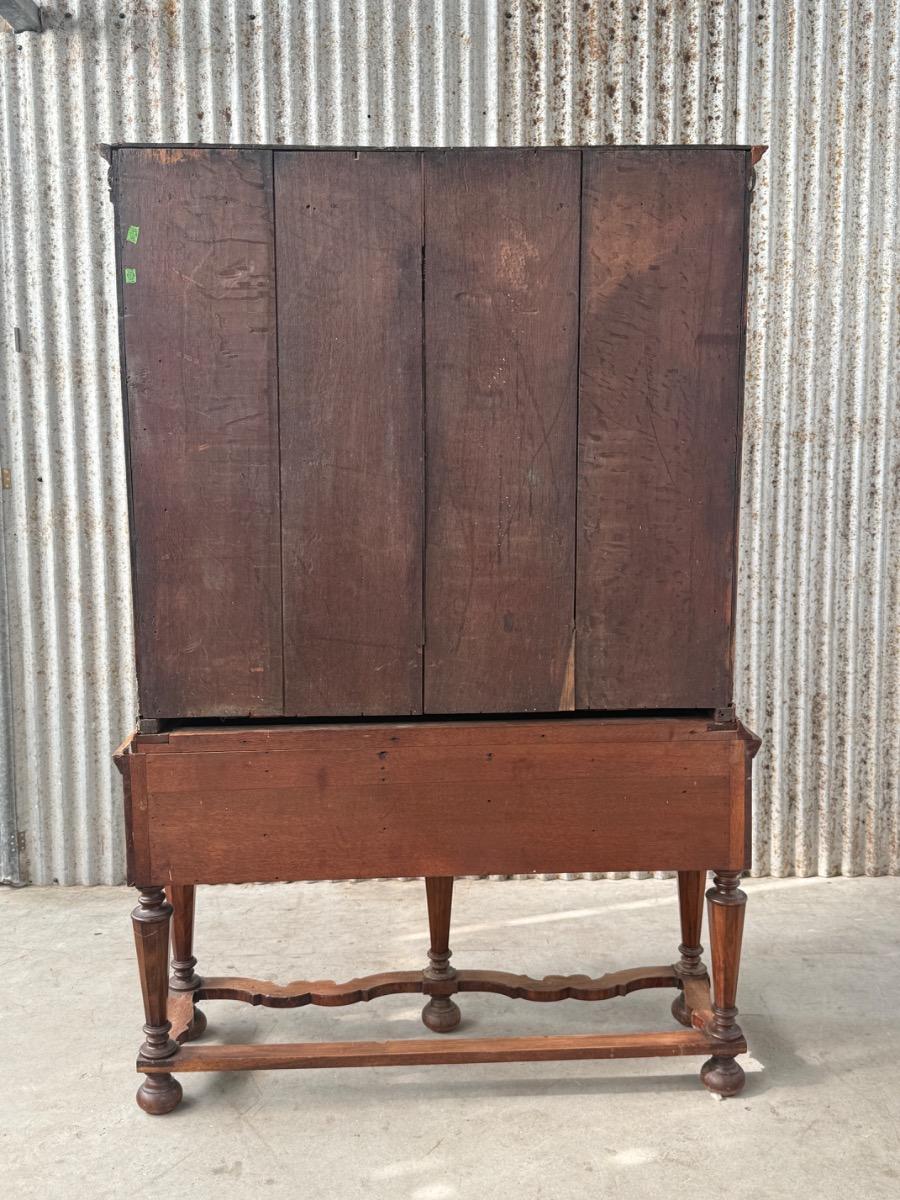 Voorzien van kras band inlegwerk aan de randen van de laden. Binnenkant deuren met zeer fraai gedetailleerd inlegwerk. Slot en sleutel werkend.