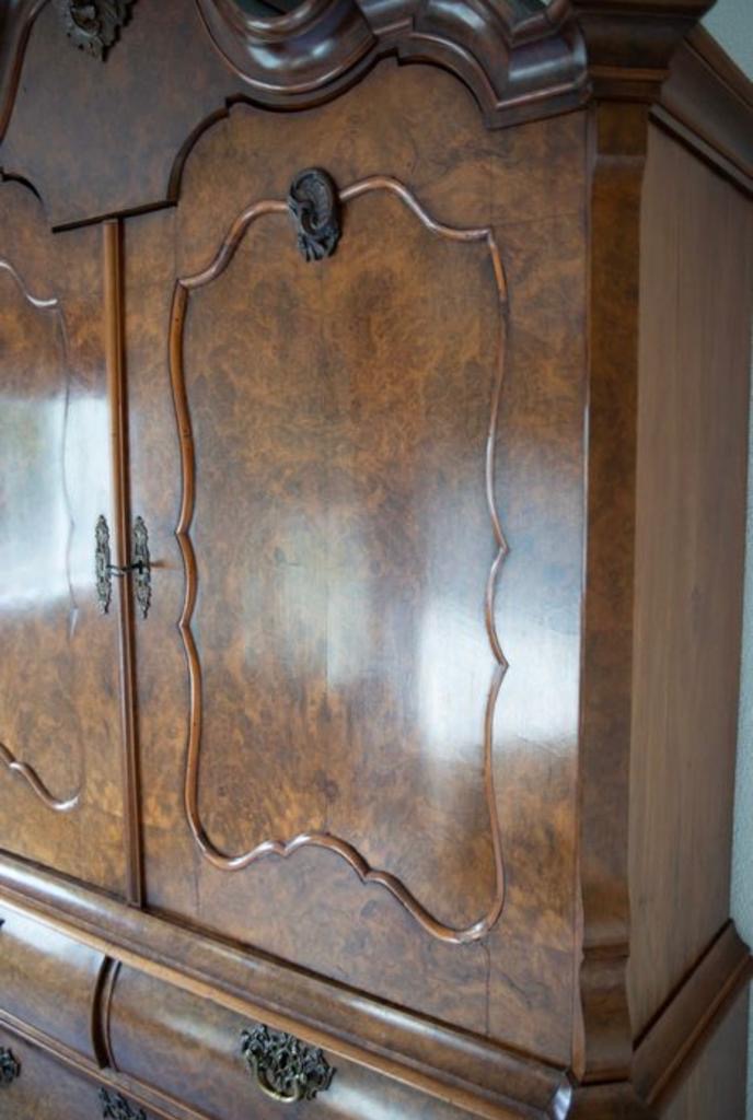 Wortelnoten kabinet Louis xv kabinet, Hollands noten kabinet. Gewelfde deuren en dubbel gebogen kap met gesneden / gestoken ornamenten. Gegoten messing ladentrekkers.