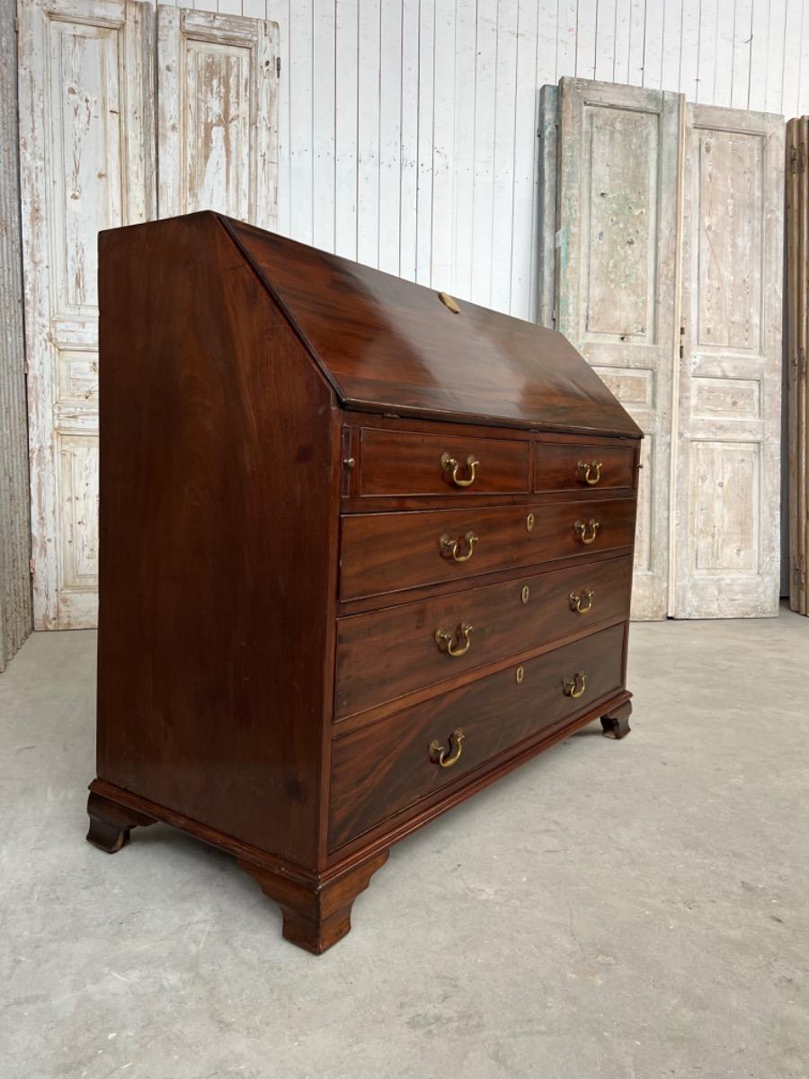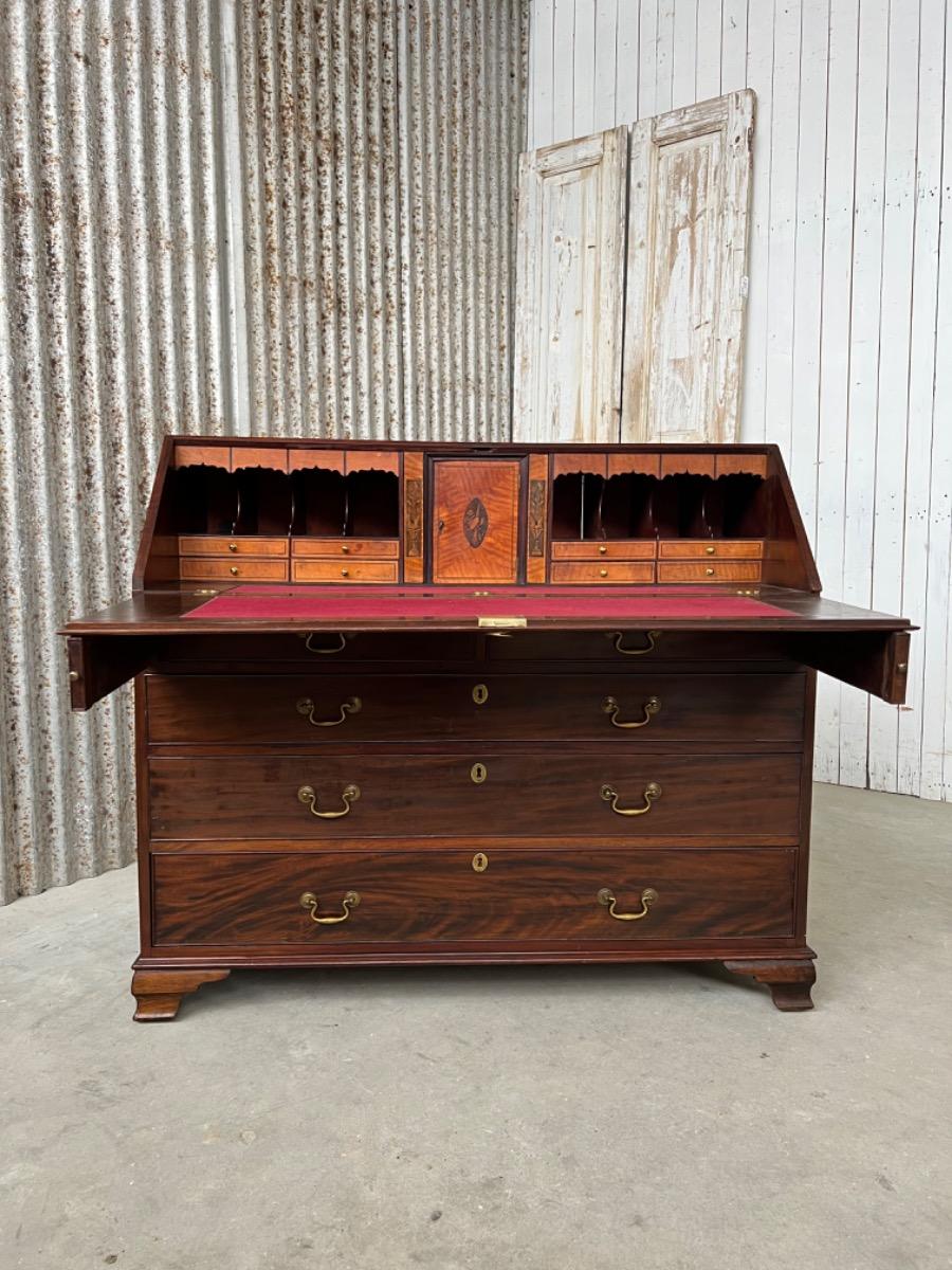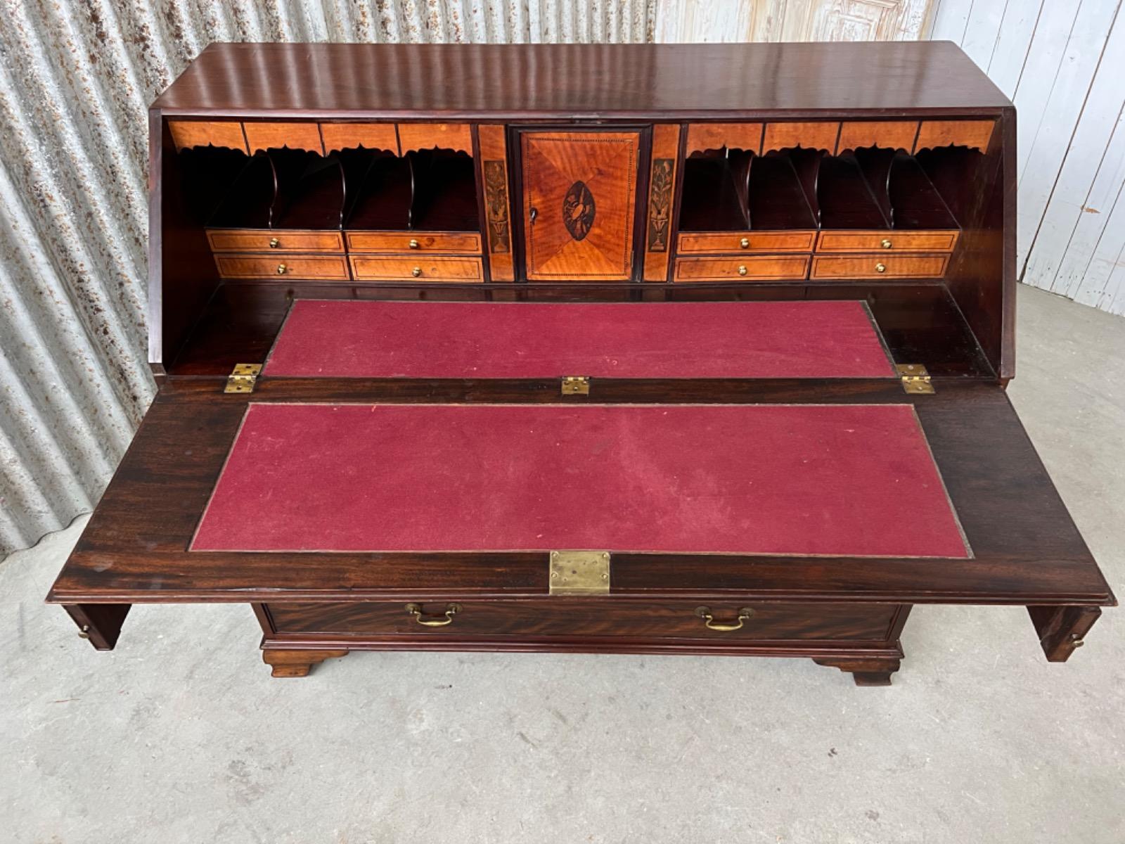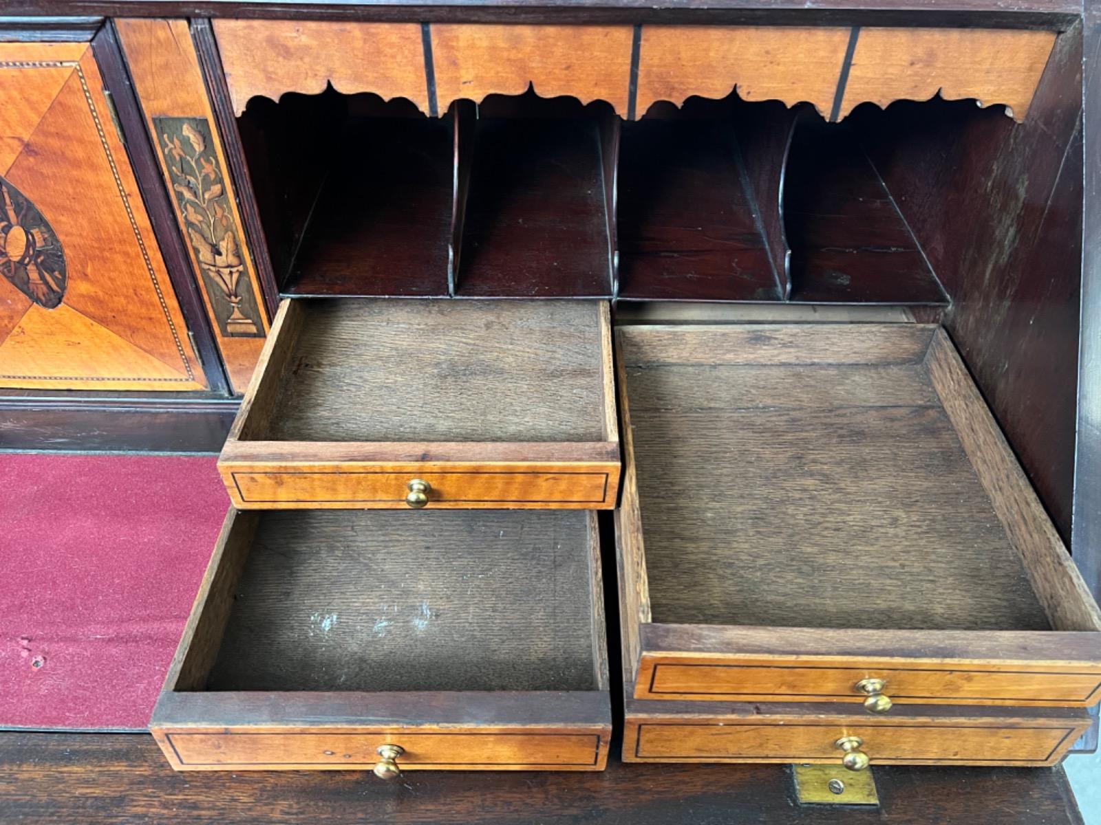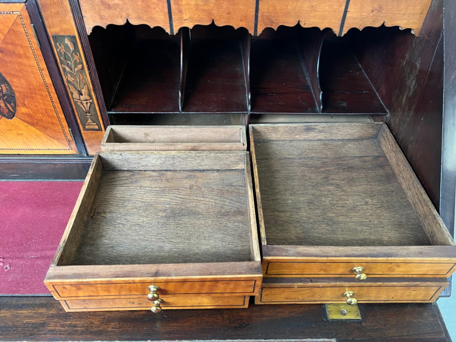 Met vuur verguld messing knopjes in het interieur. Gegoten sleutel entré’s en ‘zwanenhals’ beslag. Knopjes, scharnieren en beslag oorspronkelijk. Bureau klep gedragen door twee trekkers, waaronder 5 laden. Geheel gedragen door gebogen ‘bracket’ poten.