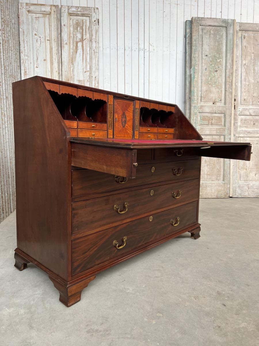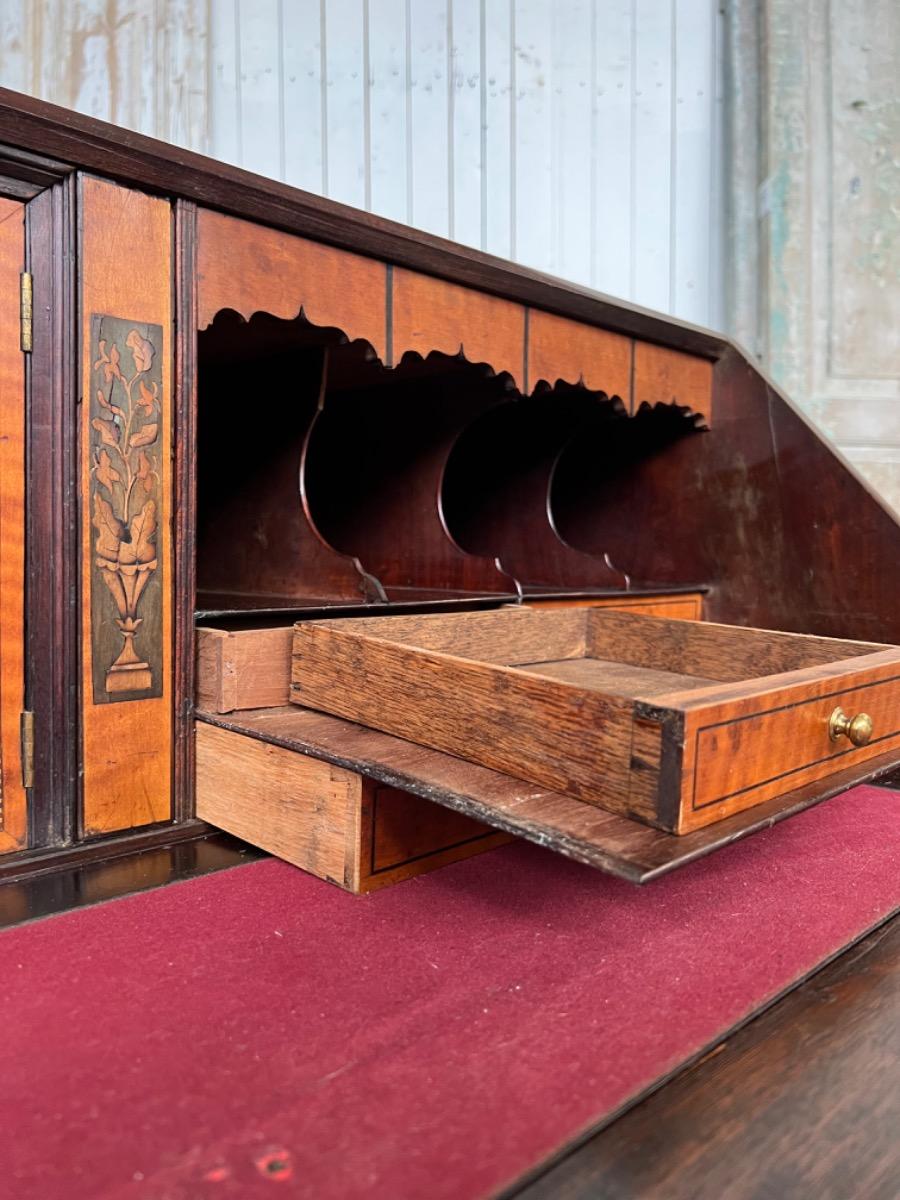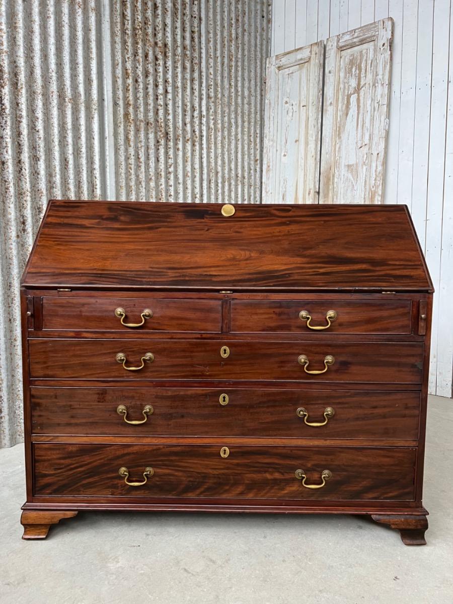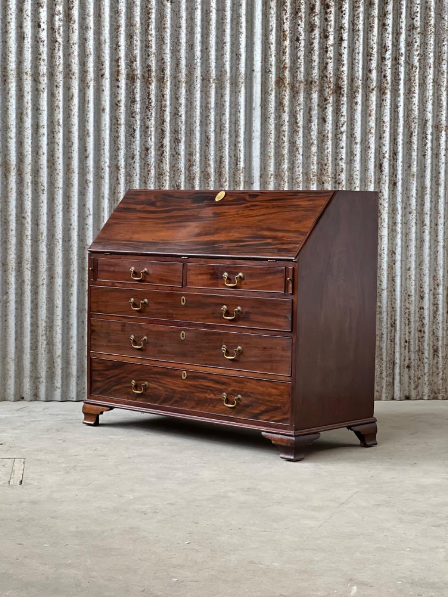 Met vuur verguld messing knopjes in het interieur. Gegoten sleutel entré’s en ‘zwanenhals’ beslag. Knopjes, scharnieren en beslag oorspronkelijk. Bureau klep gedragen door twee trekkers, waaronder 5 laden. Geheel gedragen door gebogen ‘bracket’ poten.