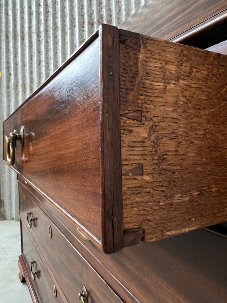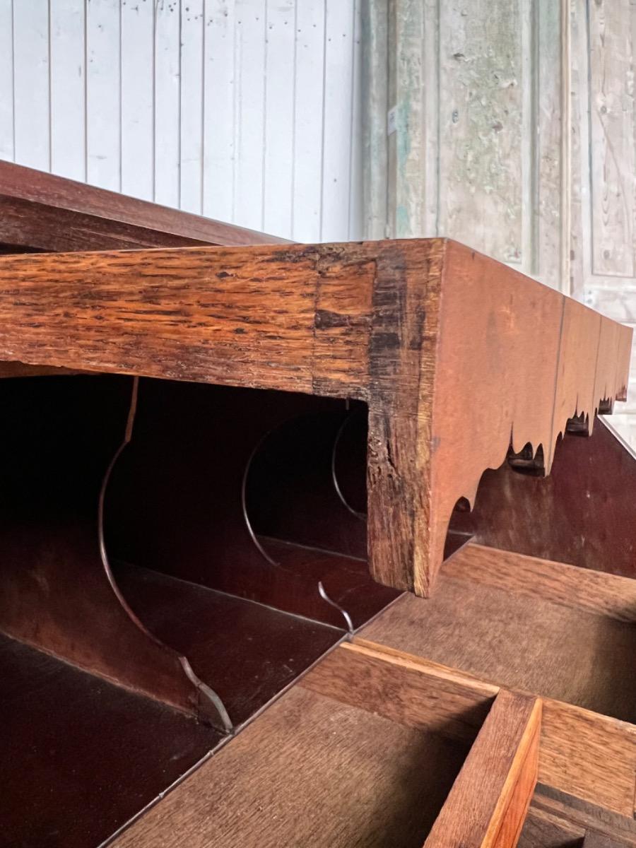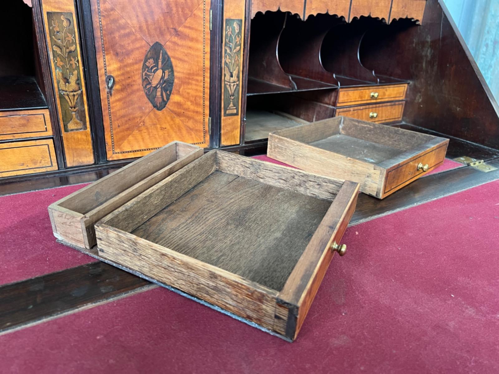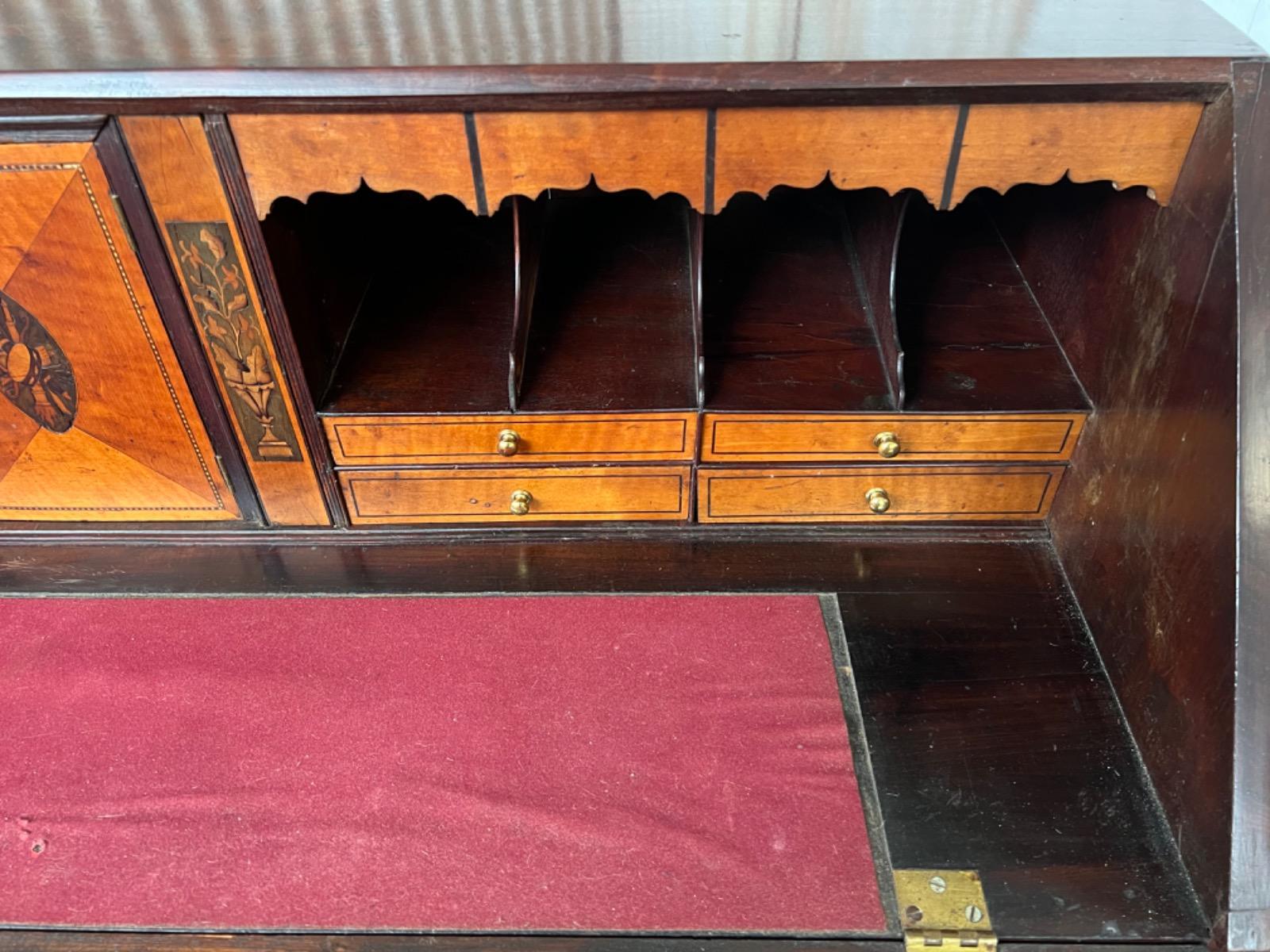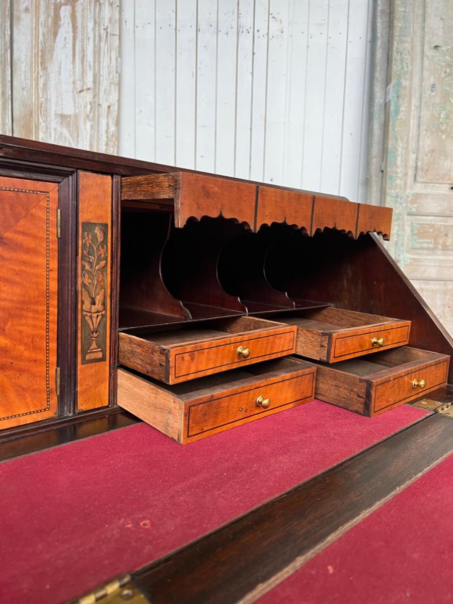 Met vuur verguld messing knopjes in het interieur. Gegoten sleutel entré’s en ‘zwanenhals’ beslag. Knopjes, scharnieren en beslag oorspronkelijk. Bureau klep gedragen door twee trekkers, waaronder 5 laden. Geheel gedragen door gebogen ‘bracket’ poten.