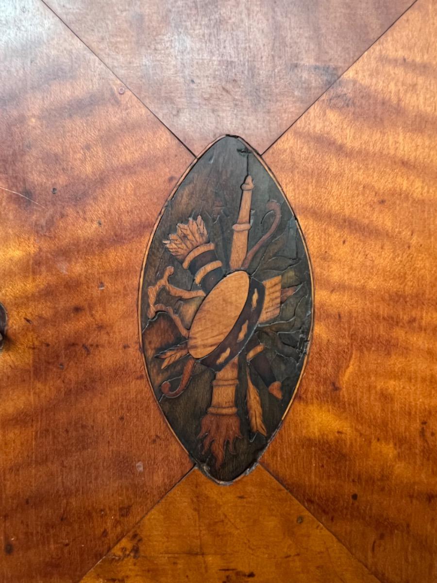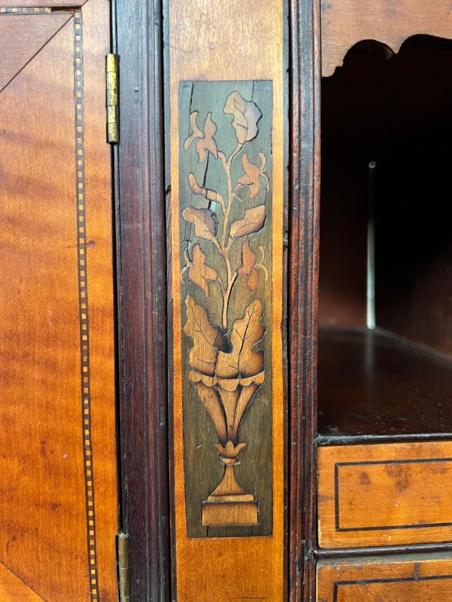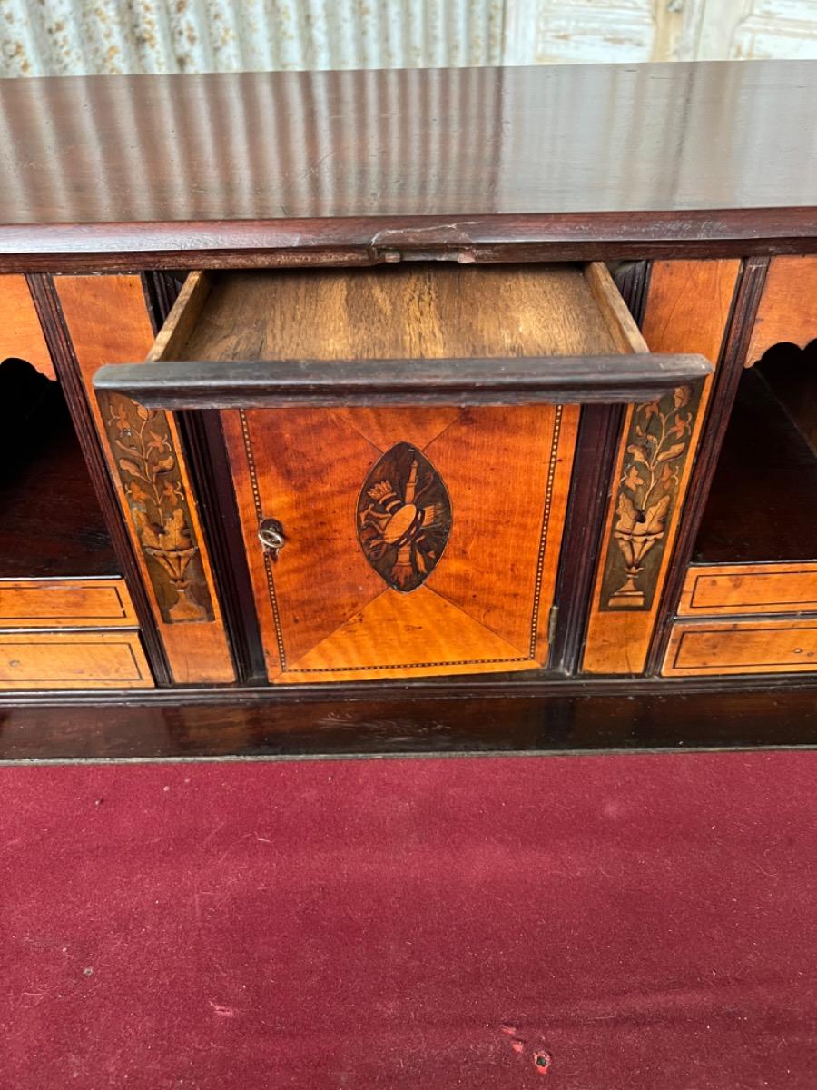 Deurtje waarboven een verborgen lade. Aan weerszijden "geheime" vakken, 1van de 4 interieur laden links waar van 1 met extra verborgen lade aan de achterkant.