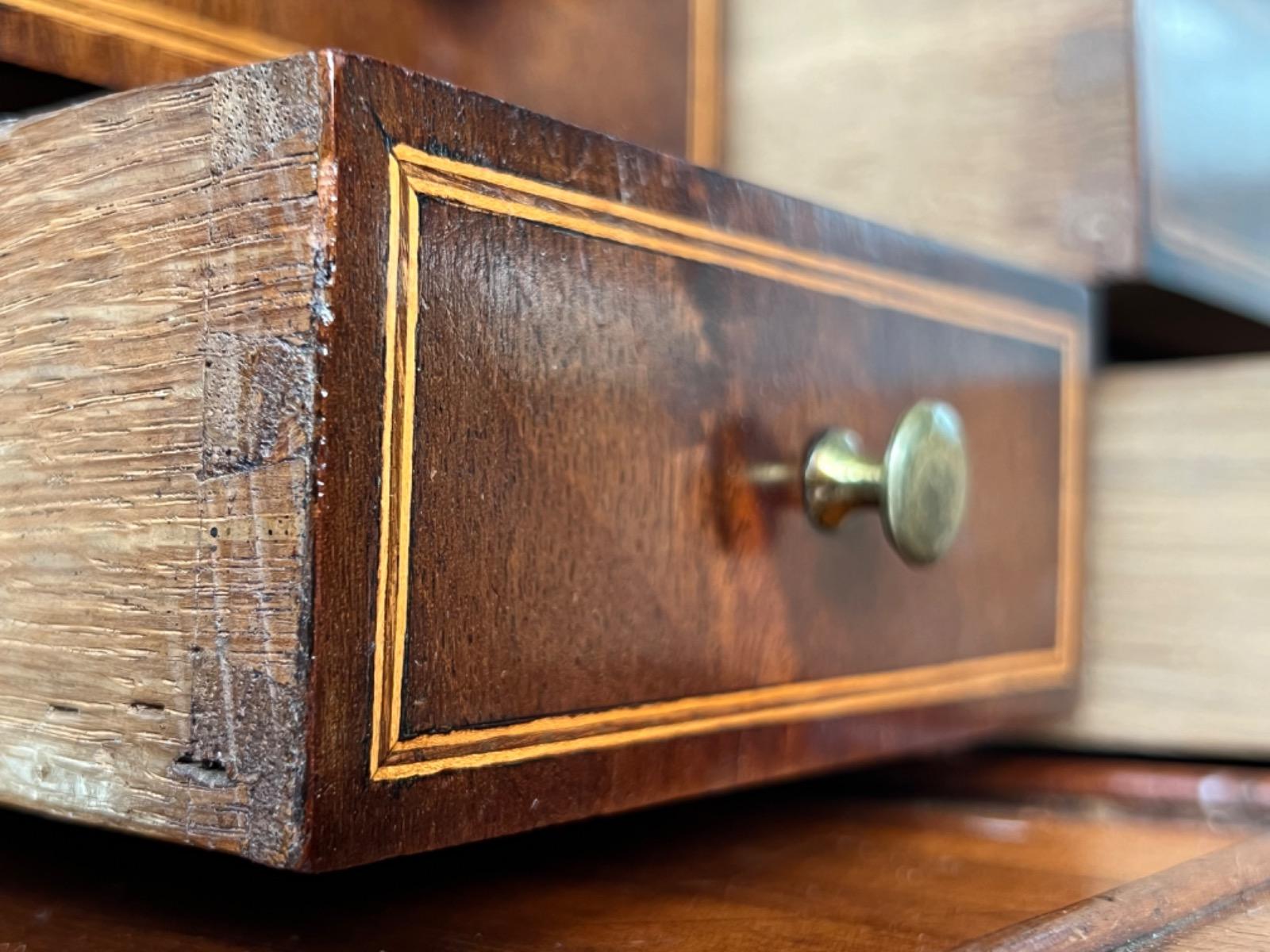 Mooi doorlopend en recht nervig mahonie fineer (op eiken) ook op de zijden.
