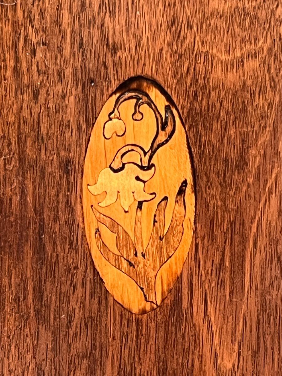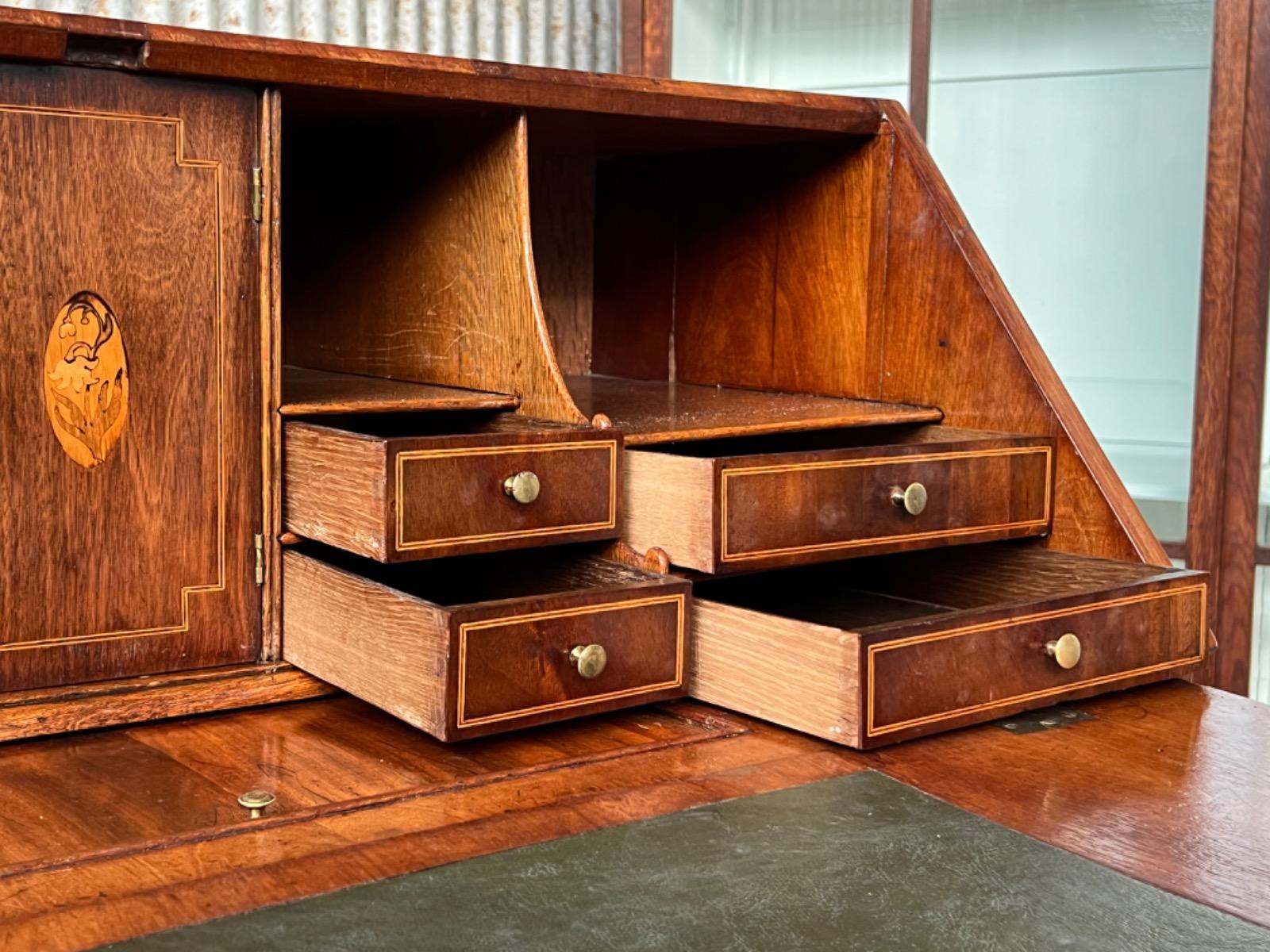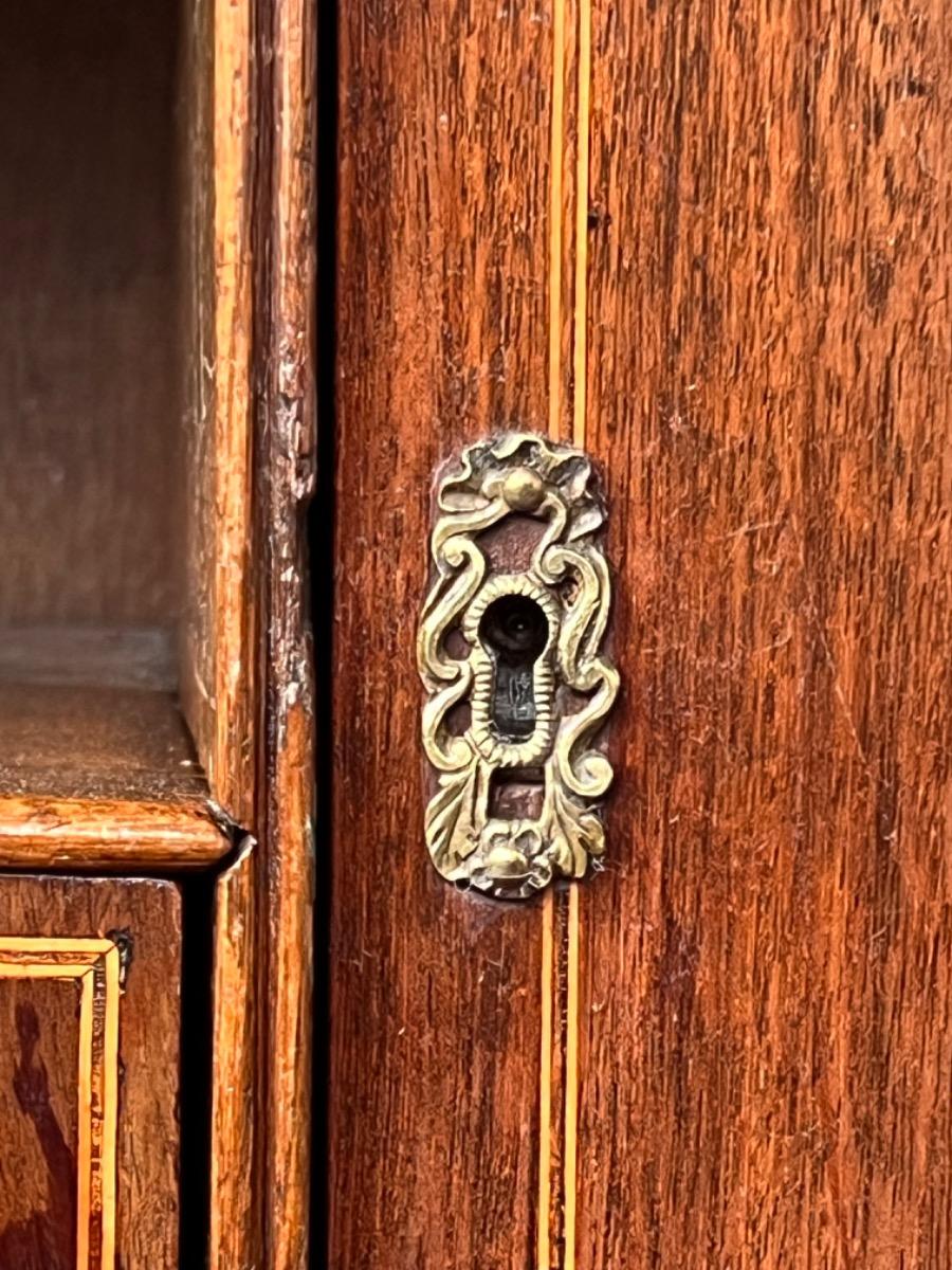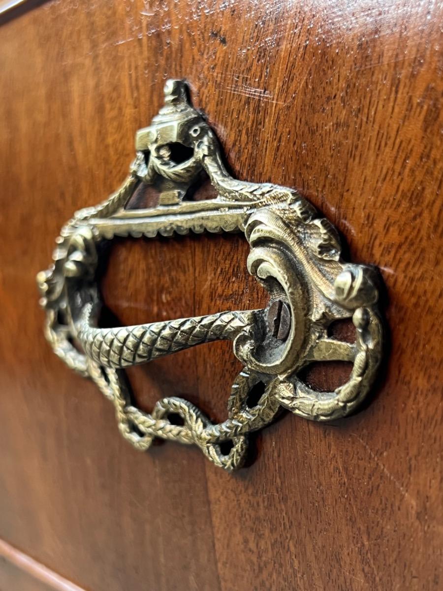 Gegoten messing beslag op de laden, klep en deurtje. Sloten en sleutels (3) werkend.