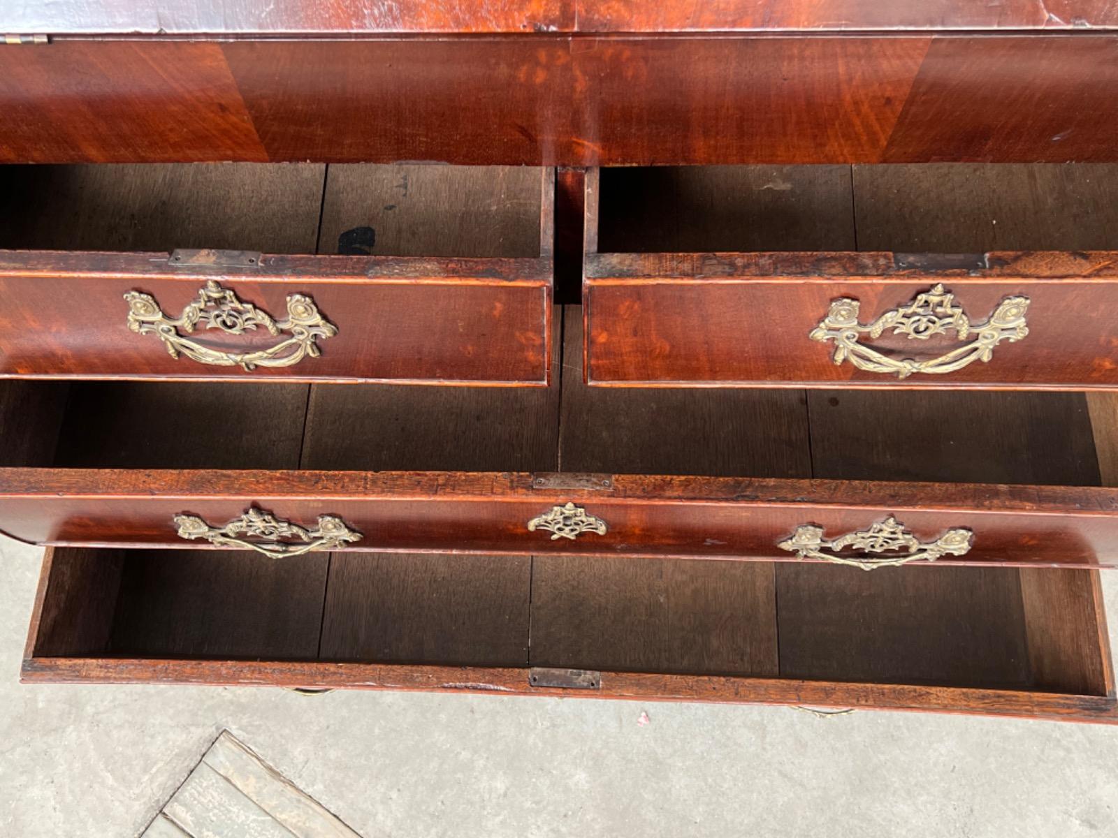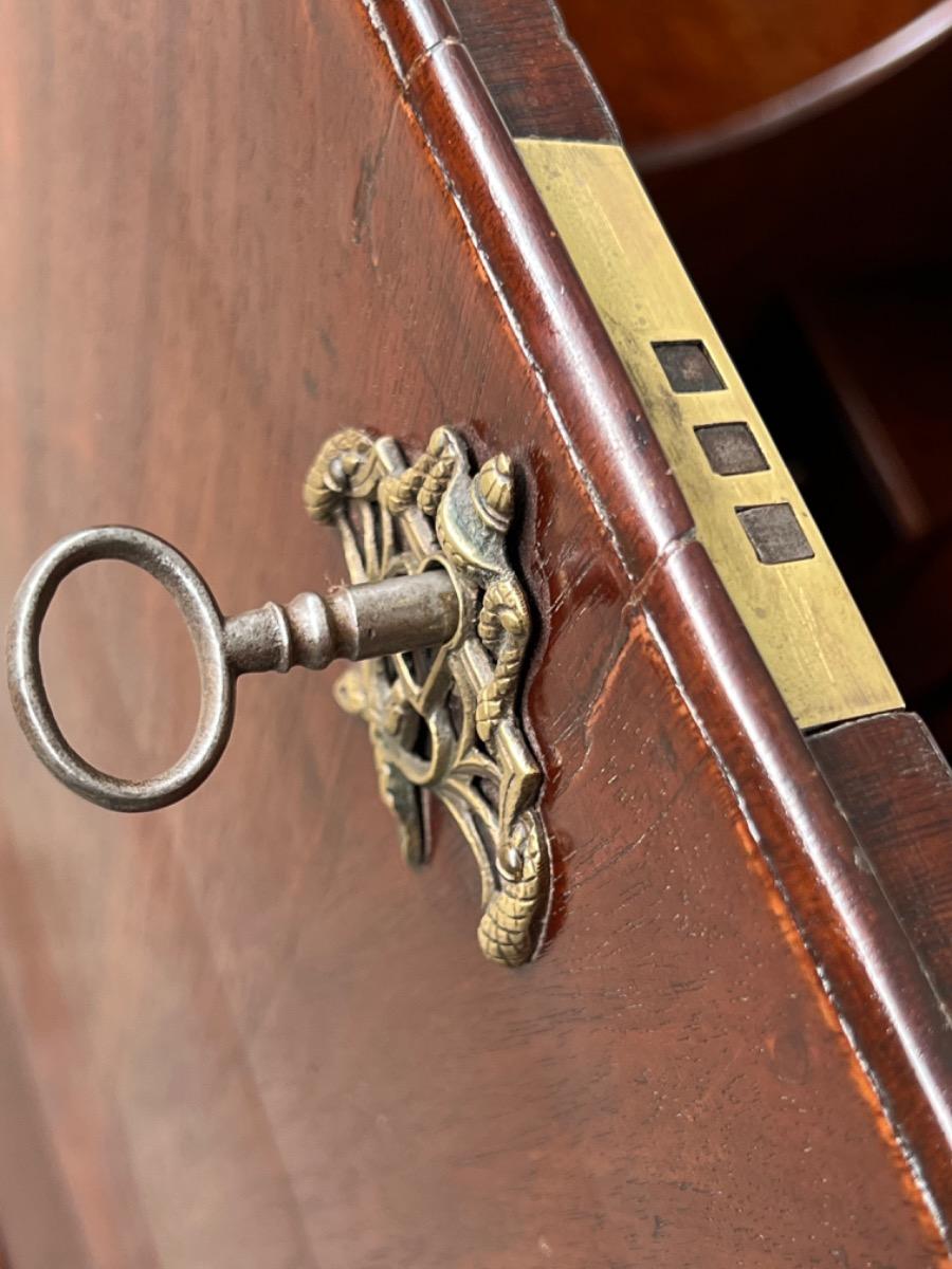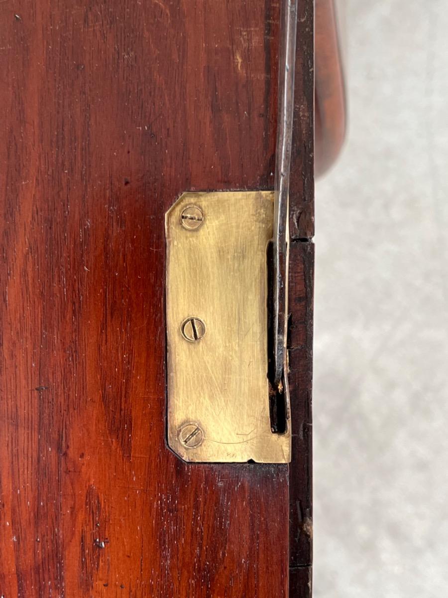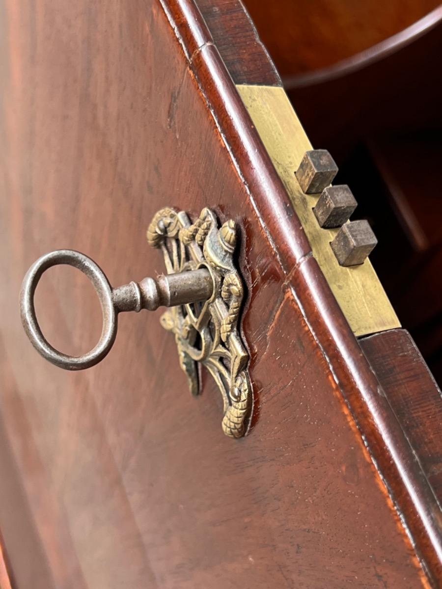 Hollands mahonie klep bureau, laat 18e eeuw. Louis XVI (Seize). 7 laden in interieur, waarvan èèn achter het centrale deurtje dat geflankeert wordt door 2 "geheime" laden / vlakken. van binnenuit te vergrendelen. Ook een "keldertje" met een vergrendelbare klep. Mooi doorlopend en gespiegeld Cuba mahonie fineer (op eiken), Oorspronkelijk messing beslag op de laden, klep en deurtje. Slot en sleutel werkend. Klep ingelegd met olijf groen kalfsleder. Meubel in heel goede en direct te gebruiken staat. Afm: H= 106 cm. B= 102-112 cm. D= 52 cm. (Klep open 88 cm.) Onlangs grondig nagelopen op losse delen van constructie en fineer. Houtworm controle : Geen levende houtworm aangetroffen op 8/3/2022 Buro-2096~