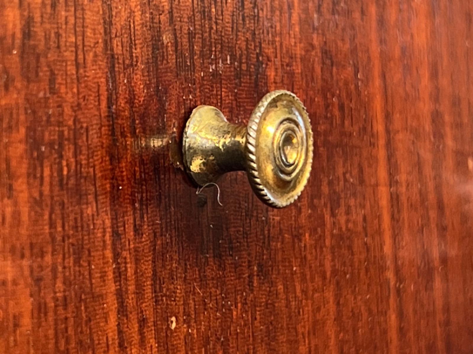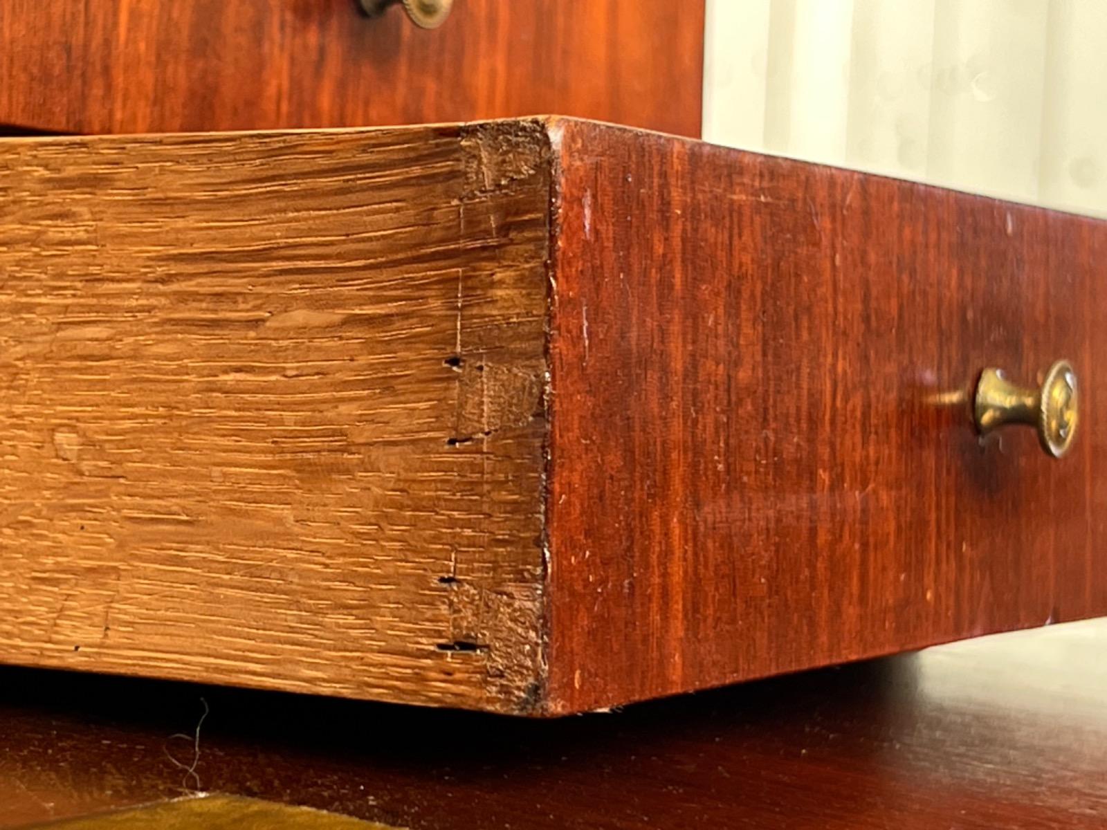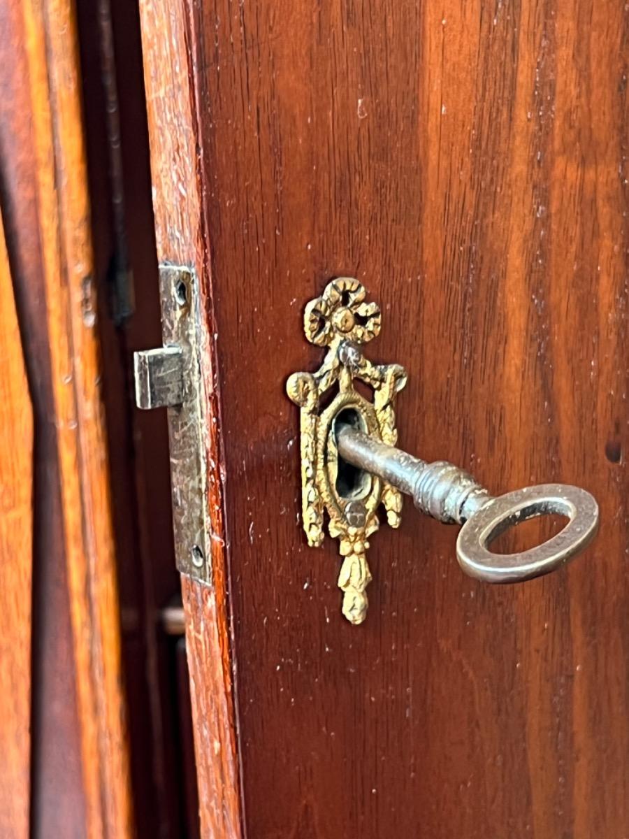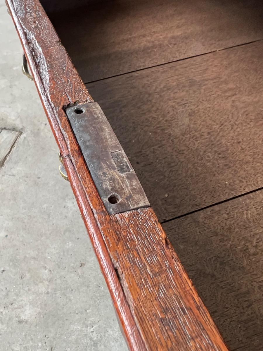 Hollands mahonie klep bureau, laat 18e eeuw. Louis XVI (Seize). 7 laden in interieur, waarvan èèn achter het centrale deurtje dat geflankeert wordt door 2 "geheime" laden / vlakken. van binnenuit te vergrendelen. Ook een "keldertje" met een vergrendelbare klep. Mooi doorlopend en gespiegeld Cuba mahonie fineer (op eiken), Oorspronkelijk messing beslag op de laden, klep en deurtje. Slot en sleutel werkend. Klep ingelegd met olijf groen kalfsleder. Meubel in heel goede en direct te gebruiken staat. Afm: H= 106 cm. B= 102-112 cm. D= 52 cm. (Klep open 88 cm.) Onlangs grondig nagelopen op losse delen van constructie en fineer. Houtworm controle : Geen levende houtworm aangetroffen op 8/3/2022 Buro-2096~