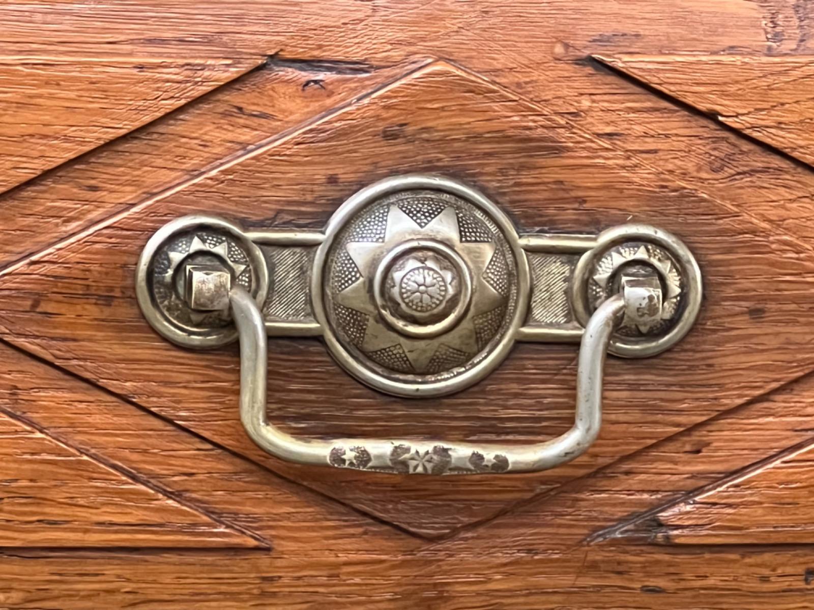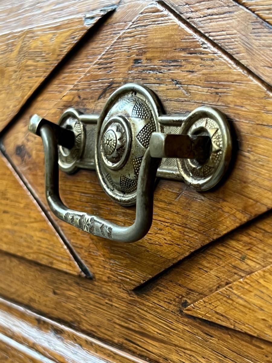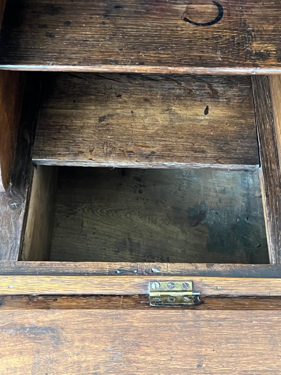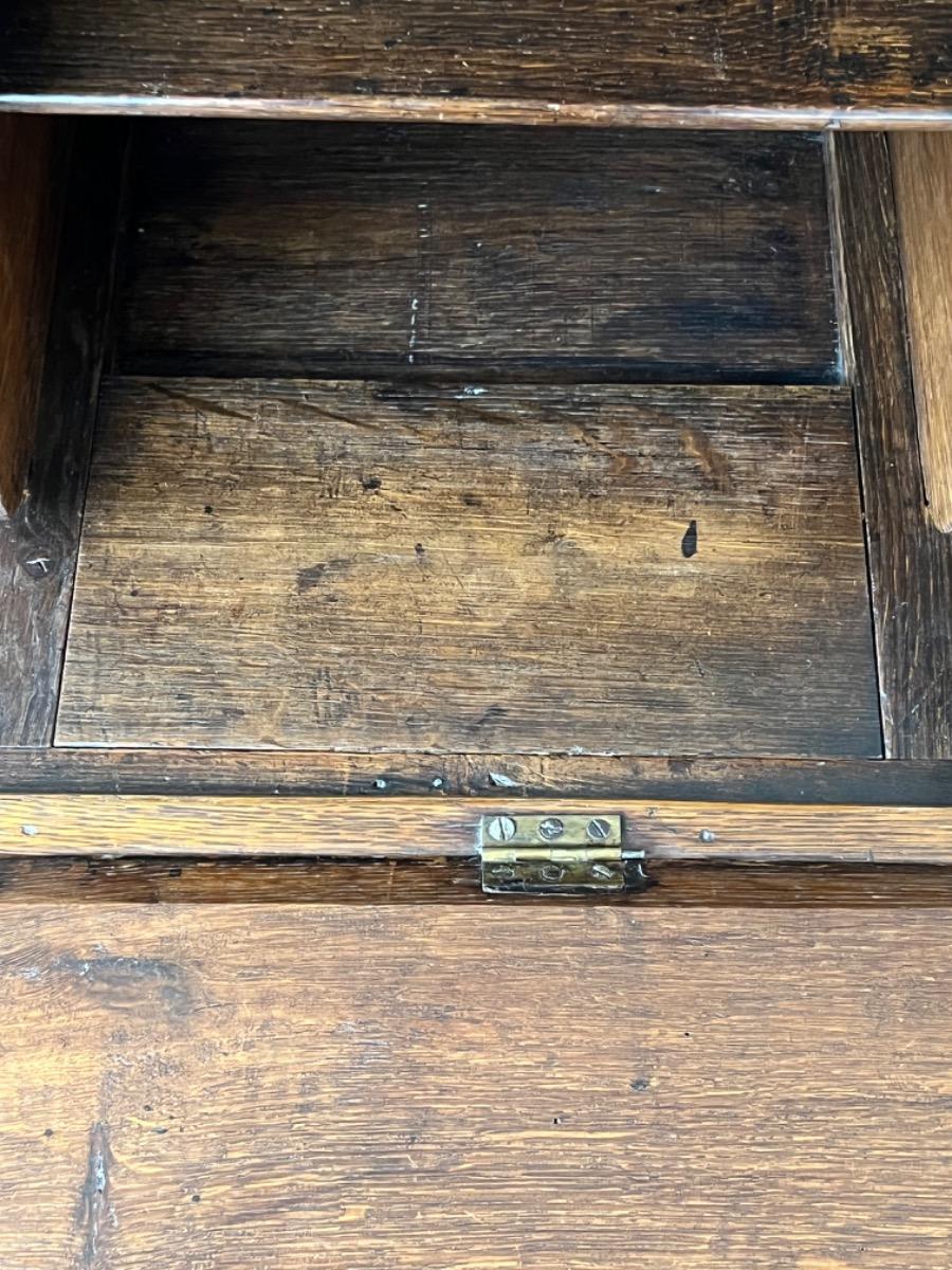 Onderkast met 2 laden voordien van oorspronkelijk beslag. Bovenst lade is een ‘schijnlade’ het verhult de geheime laden die toegankelijk zijn via het binnen werk achter de klep.