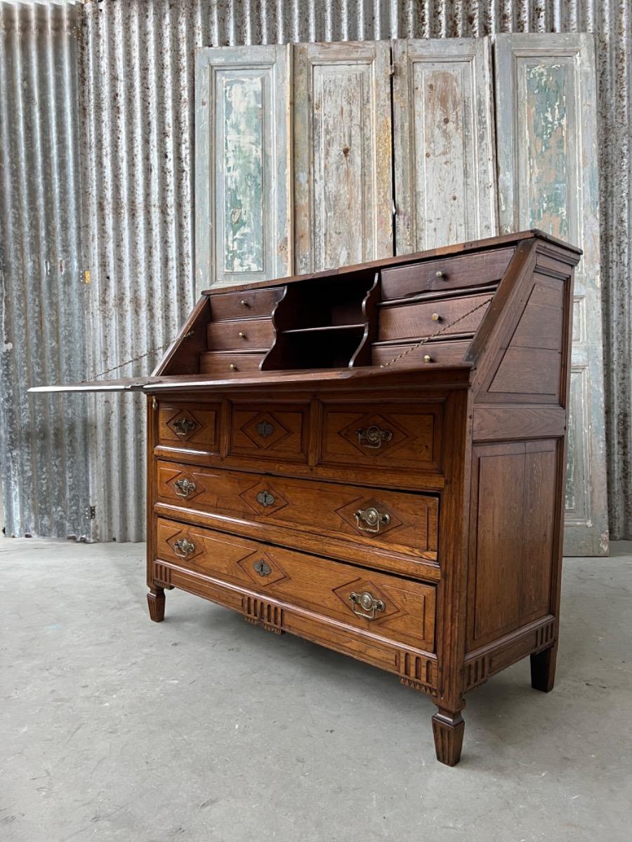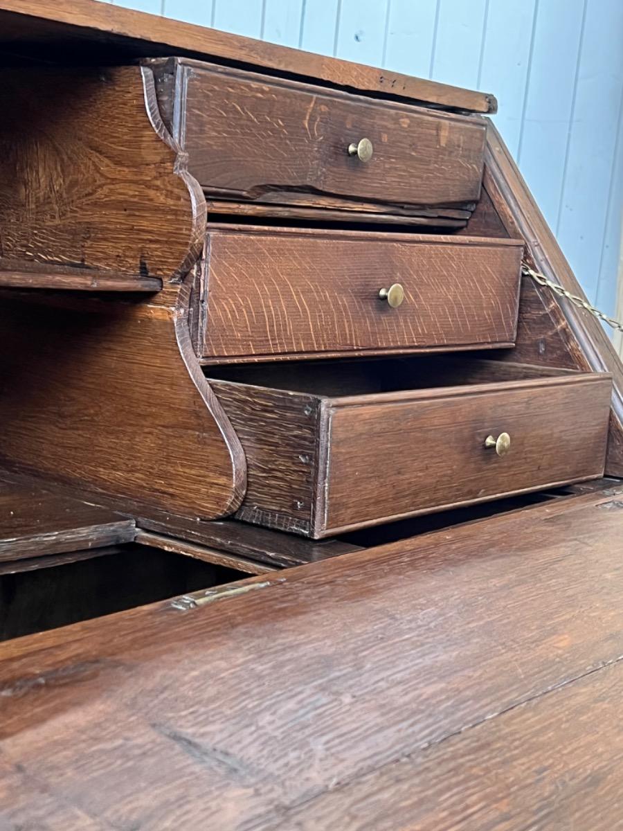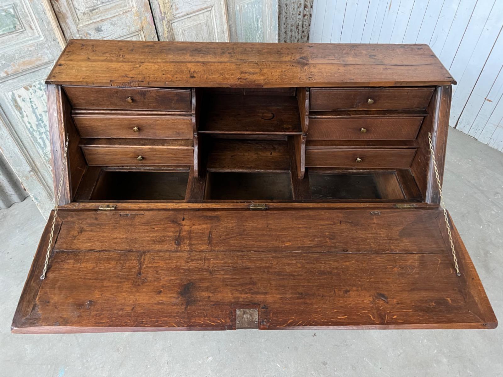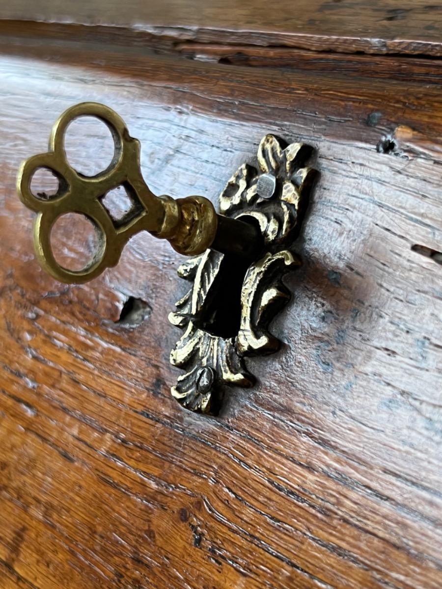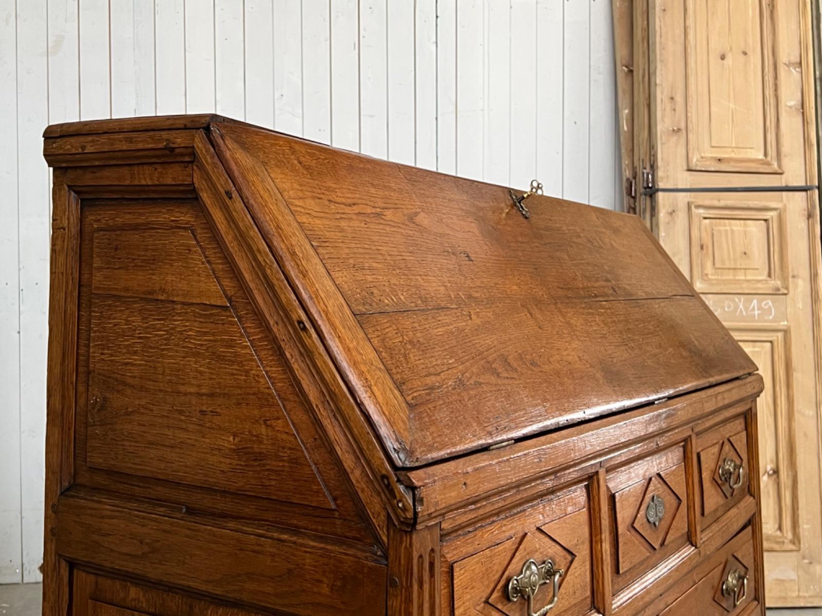 Onderkast met 2 laden voordien van oorspronkelijk beslag. Bovenst lade is een ‘schijnlade’ het verhult de geheime laden die toegankelijk zijn via het binnen werk achter de klep.