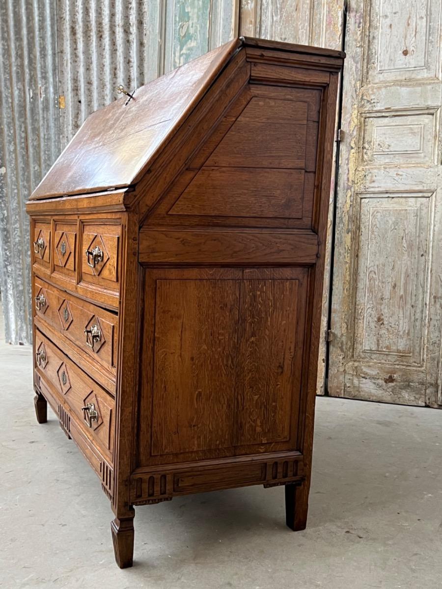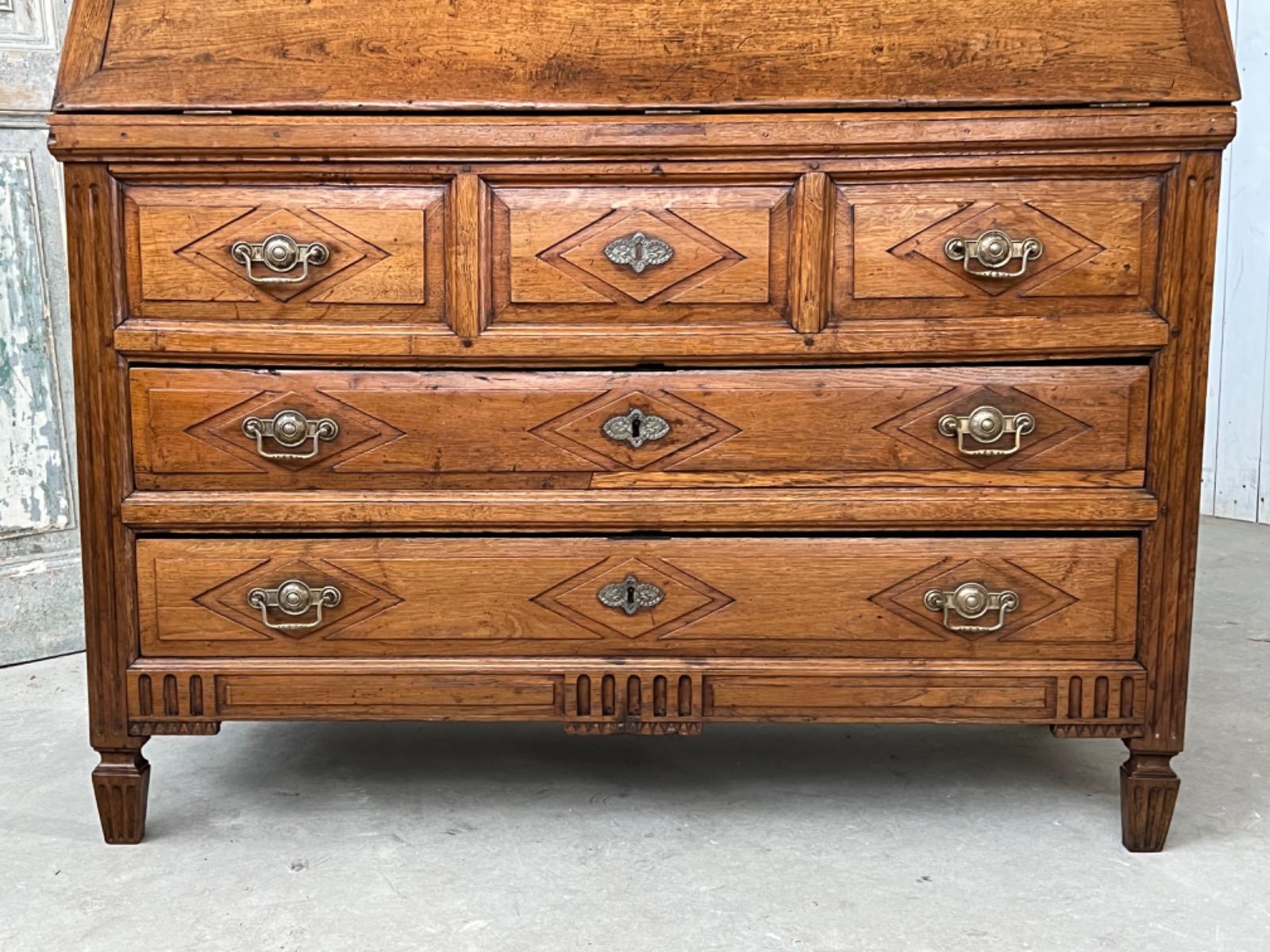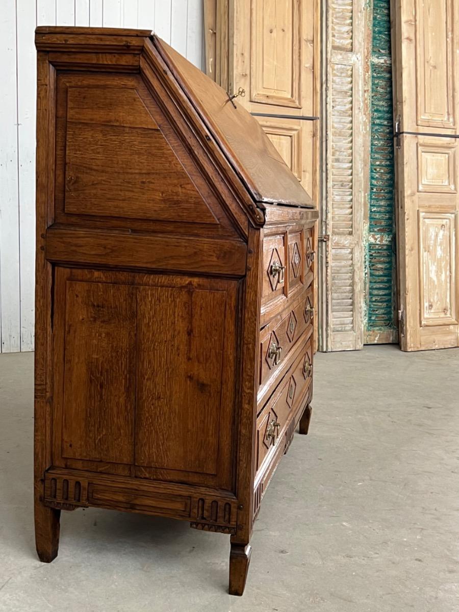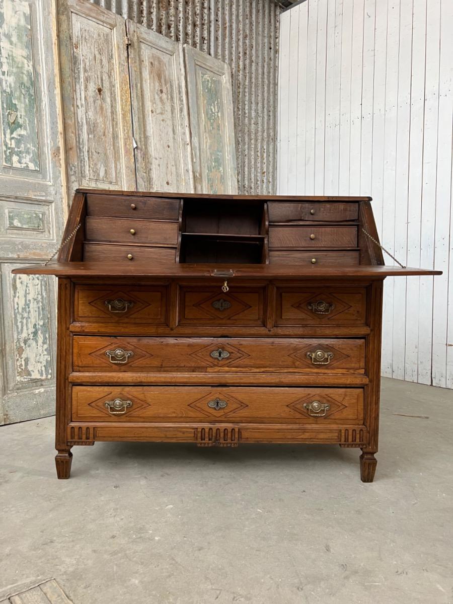 Onderkast met 2 laden voordien van oorspronkelijk beslag. Bovenst lade is een ‘schijnlade’ het verhult de geheime laden die toegankelijk zijn via het binnen werk achter de klep.