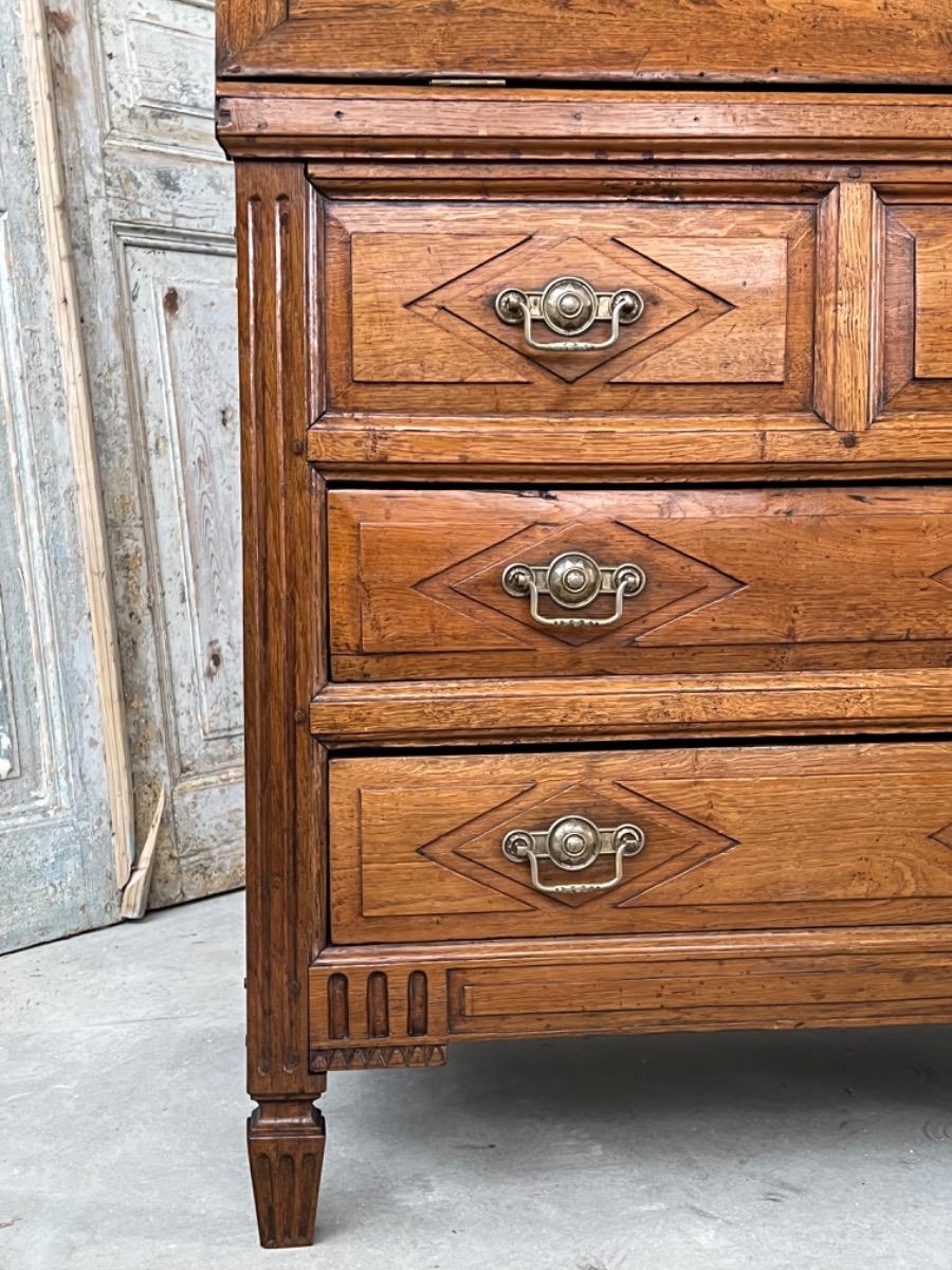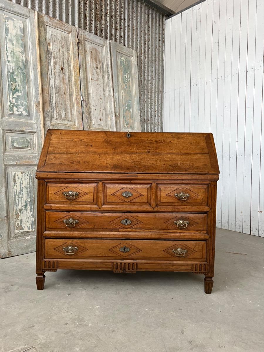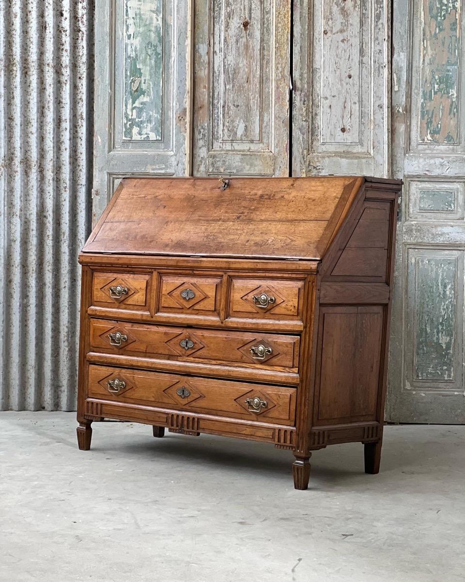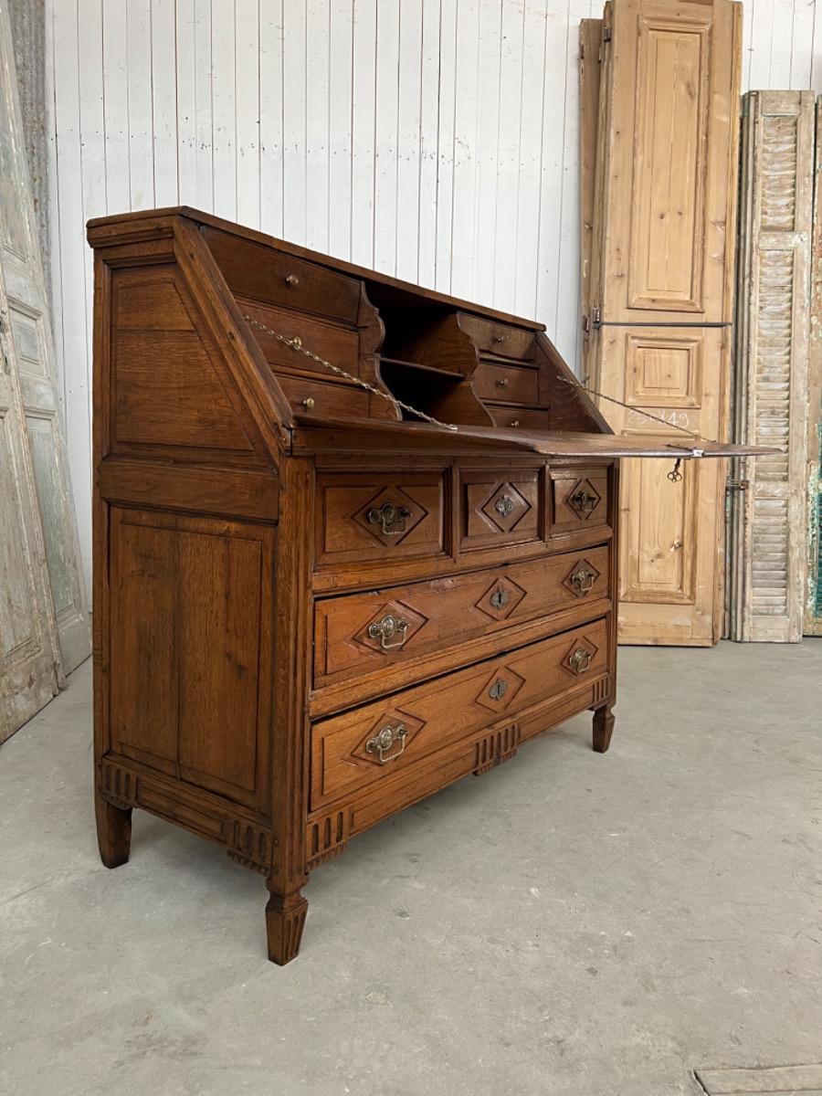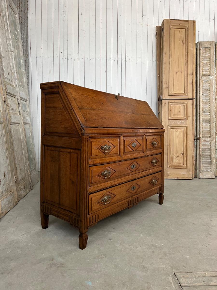 Onderkast met 2 laden voordien van oorspronkelijk beslag. Bovenst lade is een ‘schijnlade’ het verhult de geheime laden die toegankelijk zijn via het binnen werk achter de klep.
