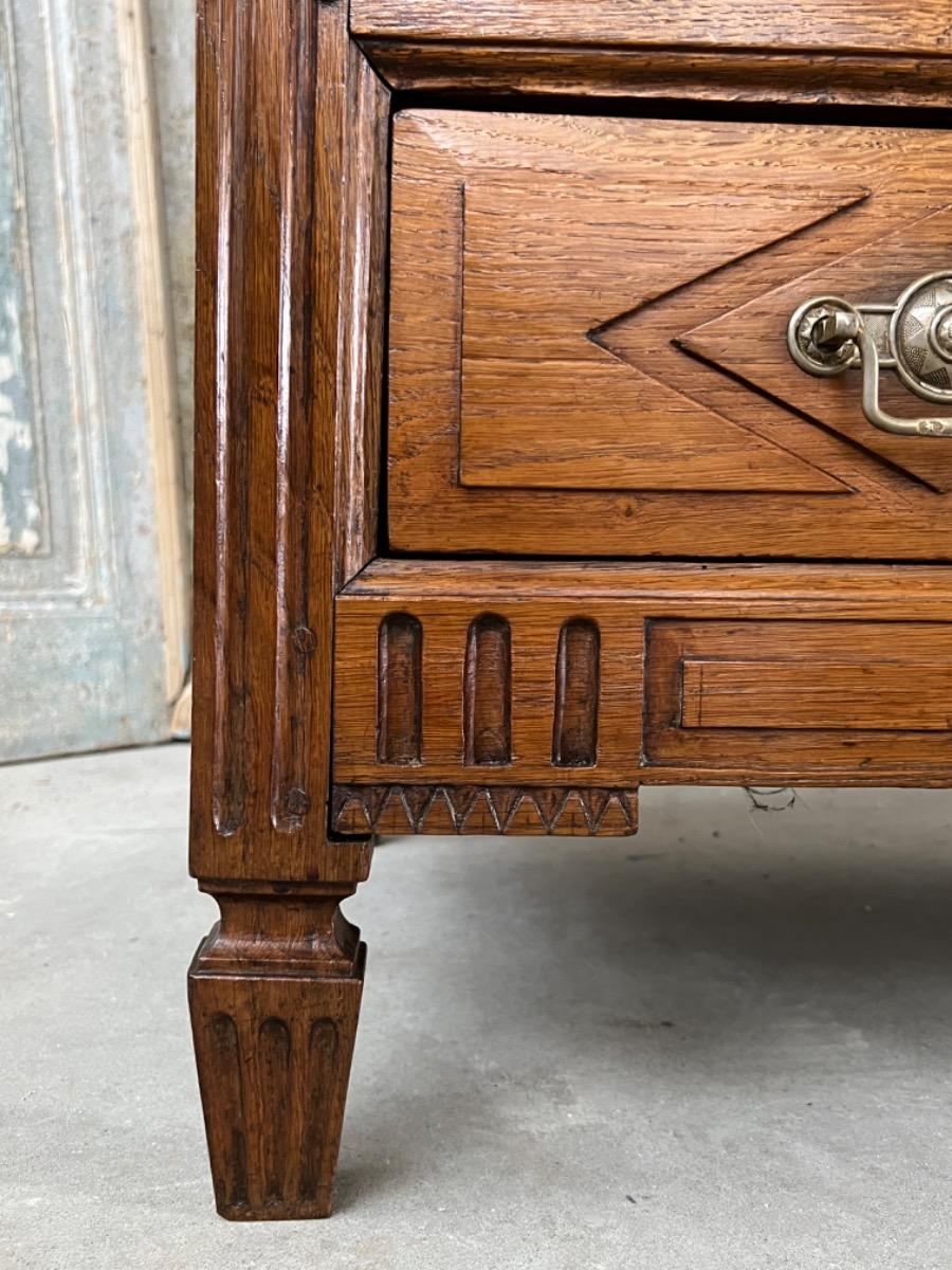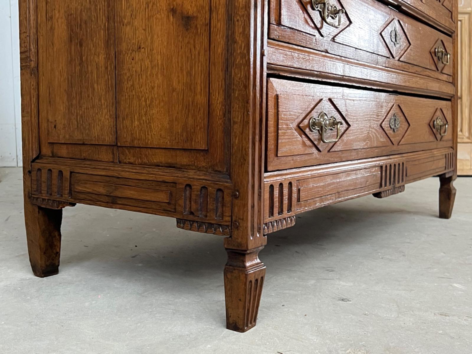 Geheel op fraaie Franse tapse poten met snij en steekwerk. Schortje in het midden met ‘pijplijst’ net als op de hoeken beide poten ook op de zijden. Zijden gepaneeld.