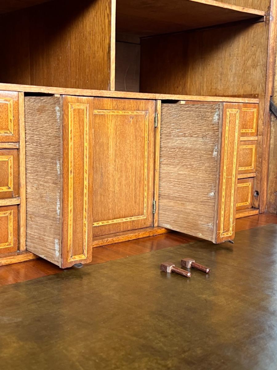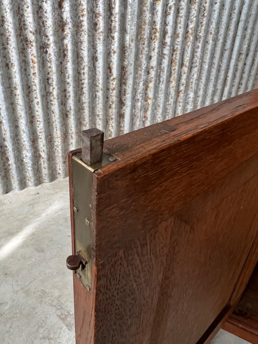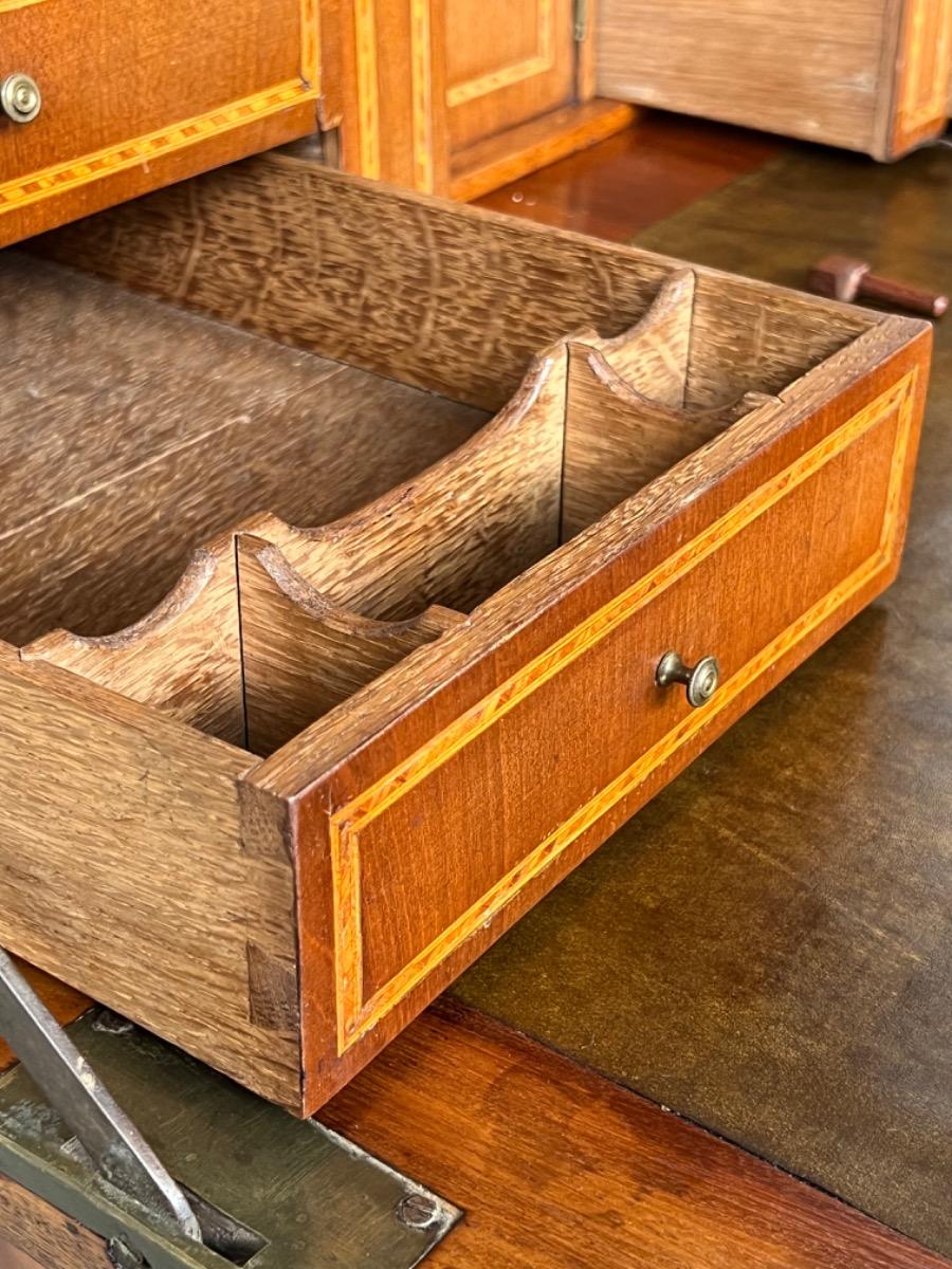 Schrijfblad met olijf groen kalfsleder ingelegd. Sloten en sleutels werkend.