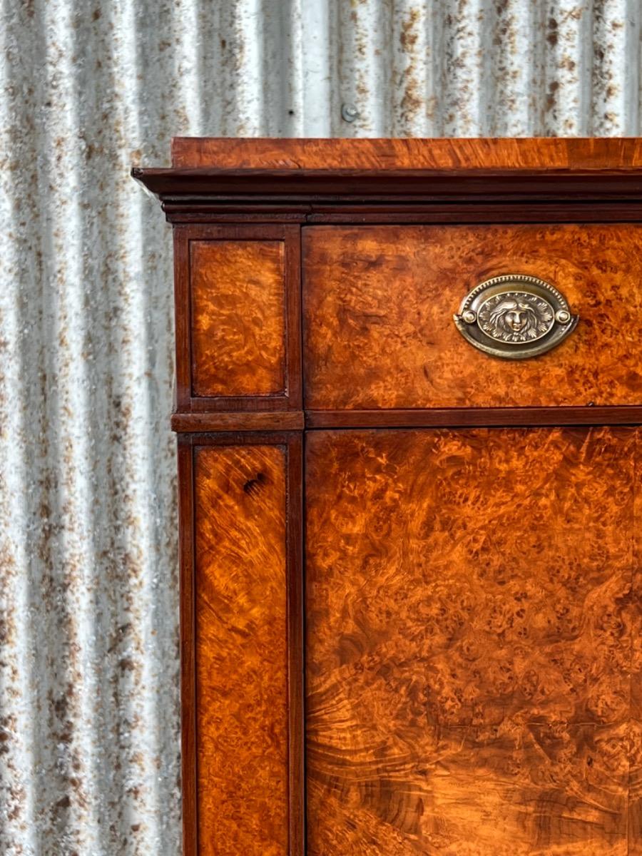 Directoire klep secretaire, Thuya / Amboina wortel gefineerd. Interieur met lade en afsluitbaar deurtje eveneens Thuya gefineerd met Padouk elementen. Klep met olijfgroen leder bekleed. Strak model zeer fraai boek gefineerd. Kap lade met latoen koper ‘zonnen’ beslag. Slot en sleutel van klep en deuren oorspronkelijk en werkend. Geen scheuren in zijden of klep. Ook bovenzijden gefineerd met Thuya. (Zie foto’s) In zeer goede en direct te gebruiken staat. Frankrijk, Ca. 1795 - 1800 Afm: H= 160 cm. B= 95 - 99 cm. (Smalste deel - breedste deel) D= 43 - 46 cm. (Ondiepste deel - diepste deel) Onlangs grondig nagelopen op losse delen van constructie en fineer. Houtworm controle : Geen active houtworm aangetroffen op 18/4/2024 Sec-2532~