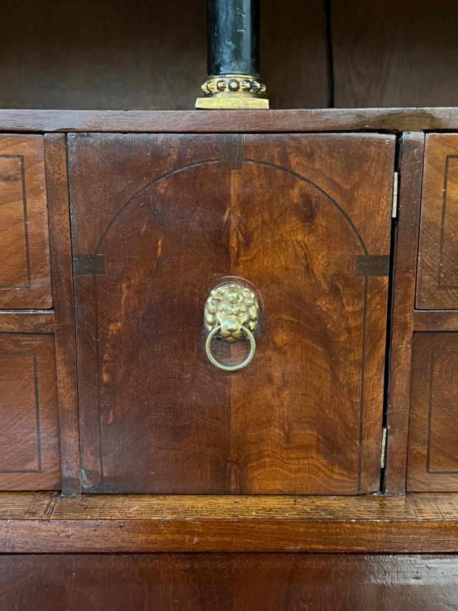 Het interieur vol met laden, deurtje met verborgen laden. Twee deurs onderkast eveneens met oorspronkelijk slot en beslag. Slot van klep en deur met dezelfde sleutel! Klaverblad sleutel, zie foto.