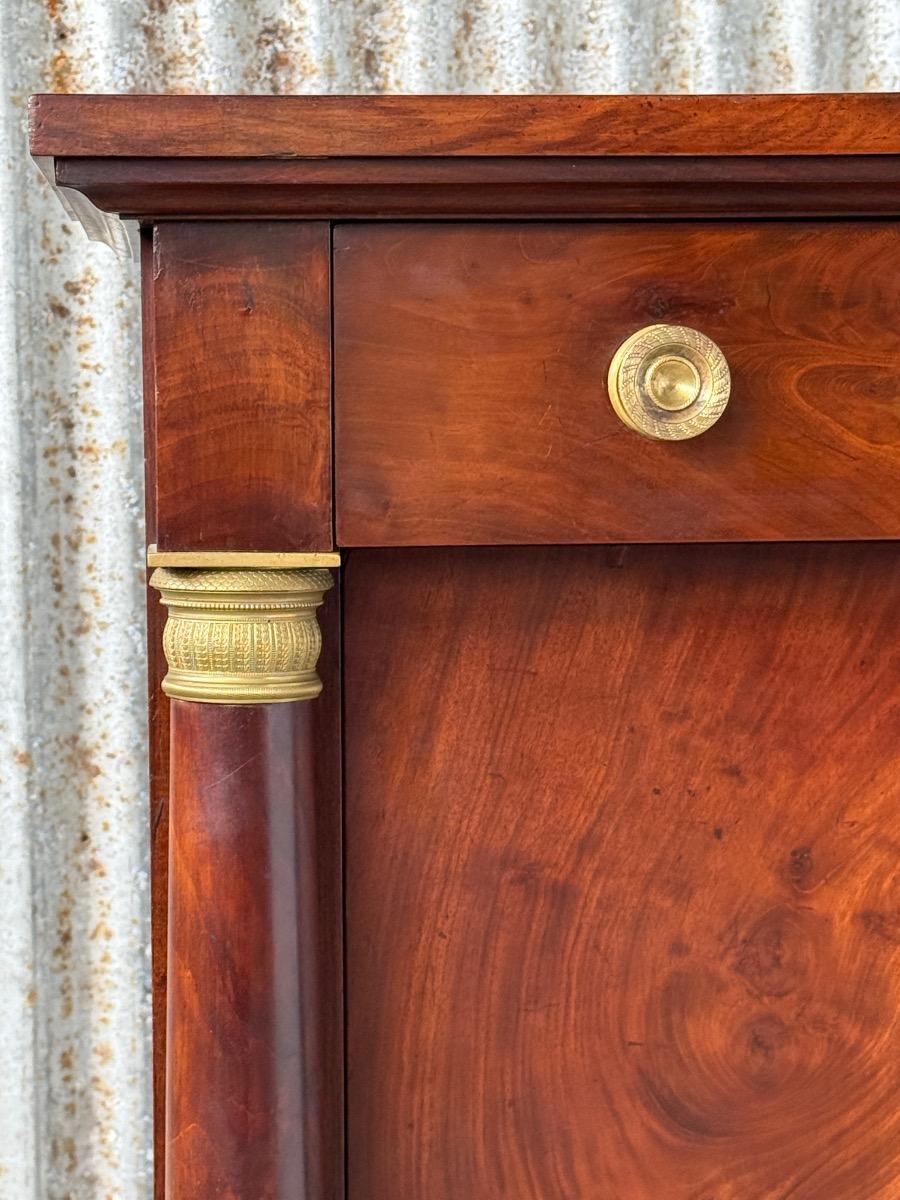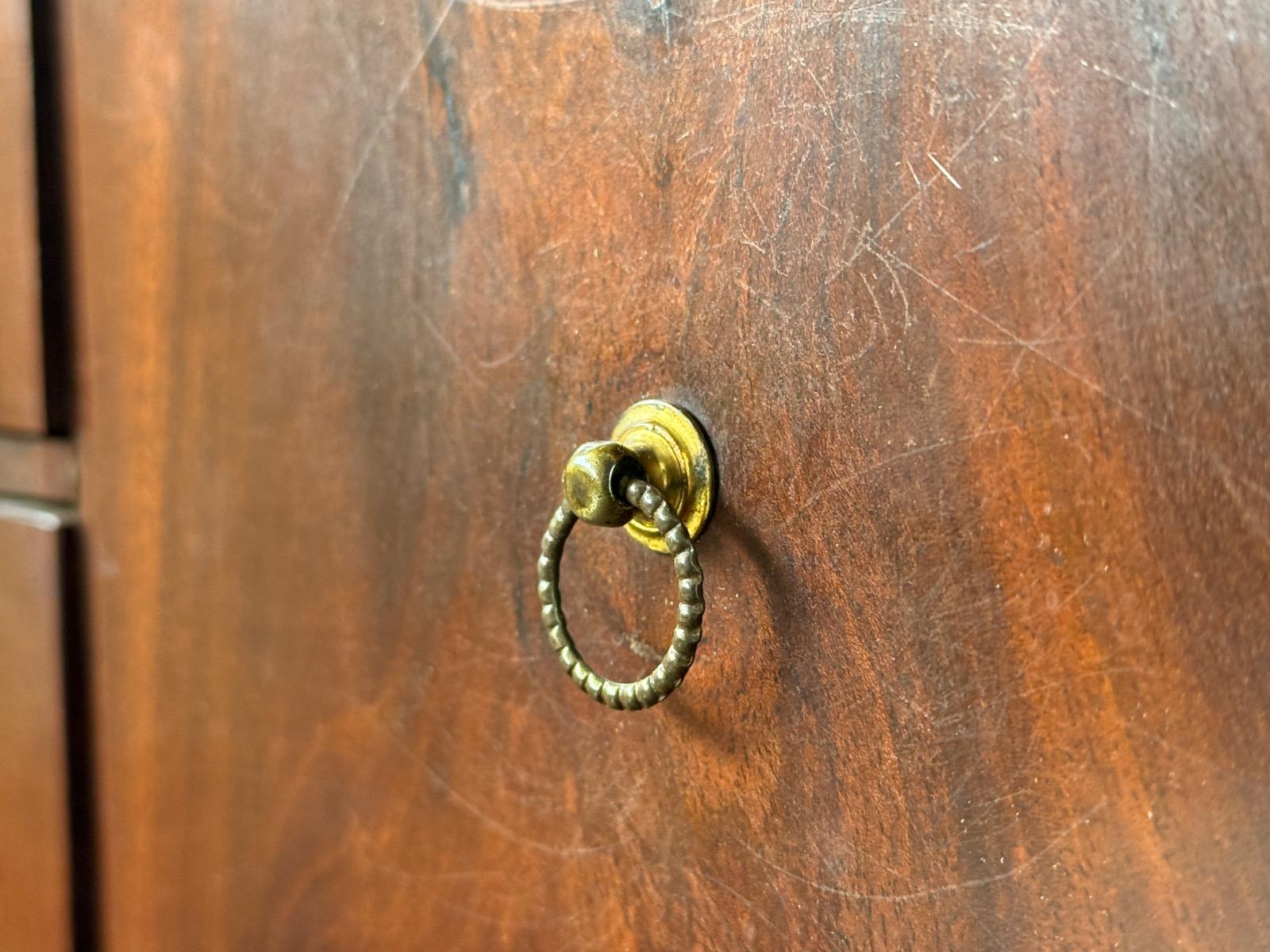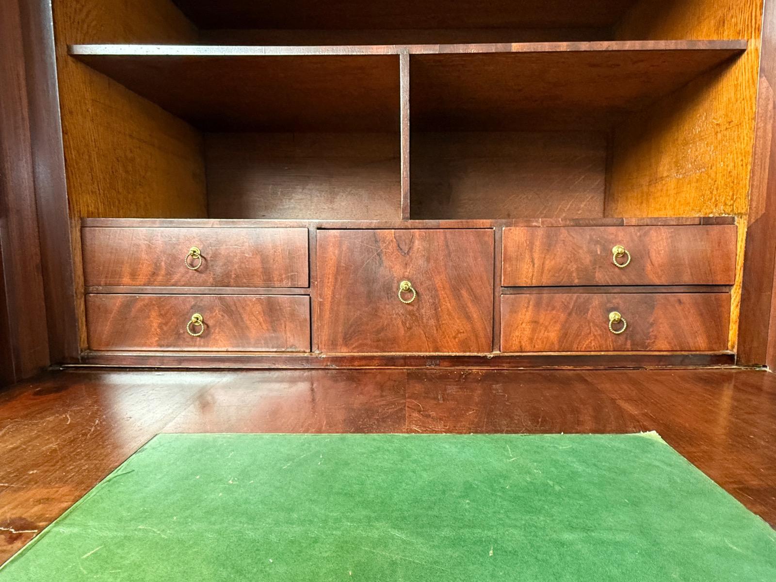 Het interieur vol met laden, oorspronkelijk vuur vergulde lade trekkertjes. De onderkast, achter de twee deuren een eiken plank.