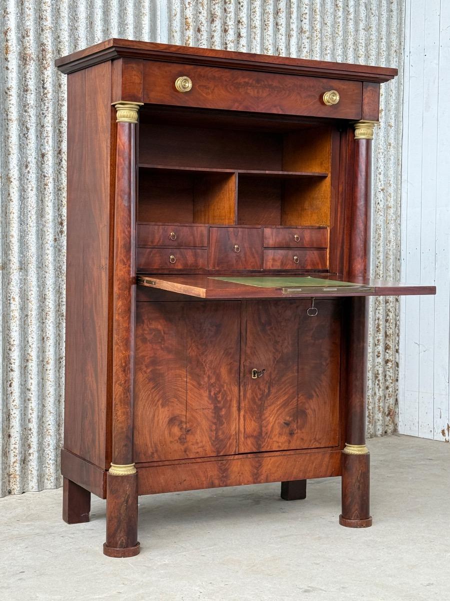 Overstekende kap lade met rond deels verguld beslag. Flinke klep, ingelegd met groen kalfsleder, voorzien van oorspronkelijk slot èn werkende sleutel