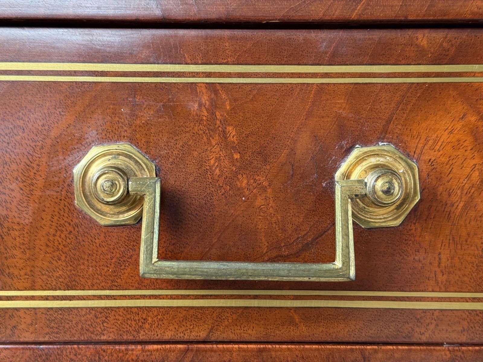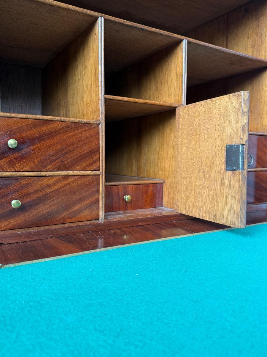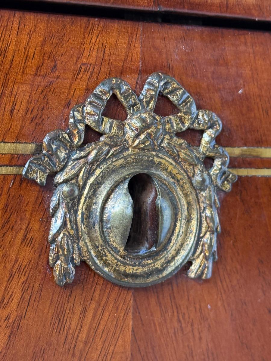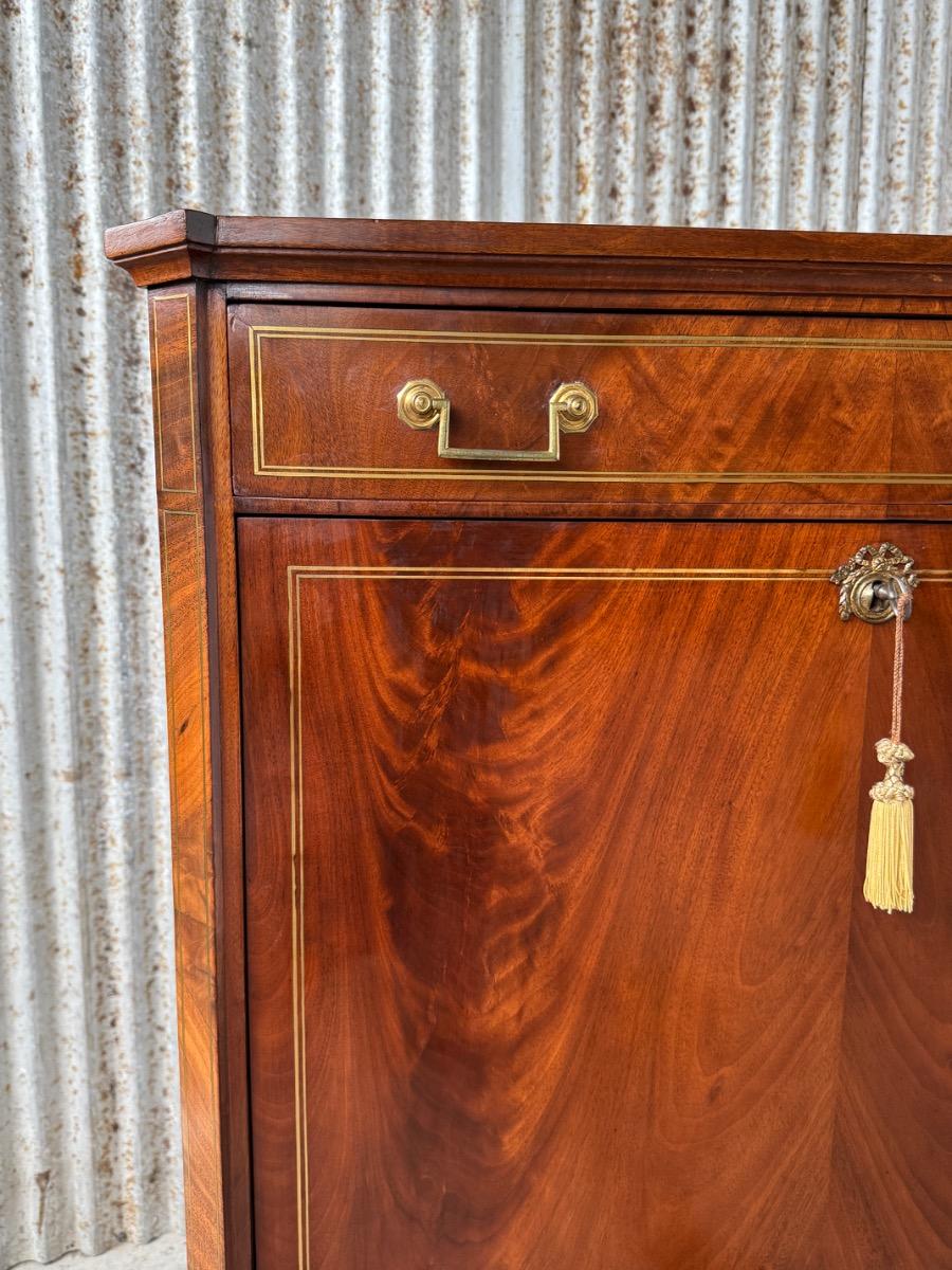 Hollands Directoire secretaire a abattant, eind 18e eeuw. In zeer goede en direct te gebruiken staat. Blad, deuren, regels en stijlen (overhoeks geplaatst) met fraai ingelegd messing biezen. Frontaal mooi doorlopend bloem mahonie fineer (op eiken) Kenmerkend rechthoekig massief gegoten messing grepen op de bovenlade. Groen vilt schrijfblad met groen goudleder bies ingelegd. Oude restauraties van latere datum. Sloten en sleutels werkend, allen oorspronkelijk. Geheel op tapse en messing ingelegde poten. Holland, Directoire, een korte overgangs periode tussen Louis XVI en Empire. Ca. 1790 - 1795 Afm: H= 149 cm. B= 86 - 92 cm. (smalst- breedst) D= 42 - 45 cm. (ondiepst-diepst) Onlangs grondig nagelopen op losse delen van constructie en fineer. Geen actieve houtworm aangetroffen op 7/7/2025 Sec-2979~