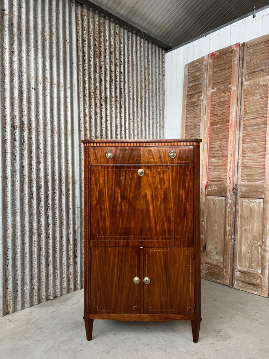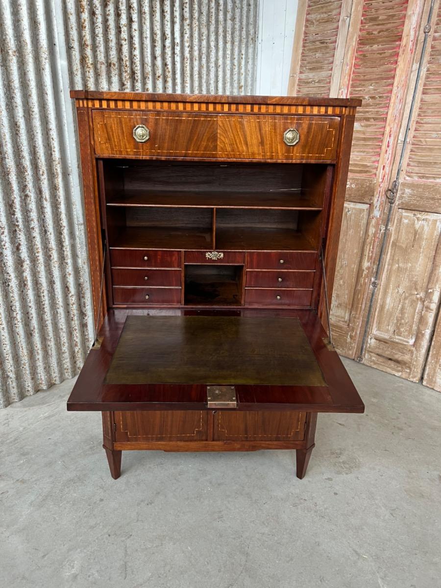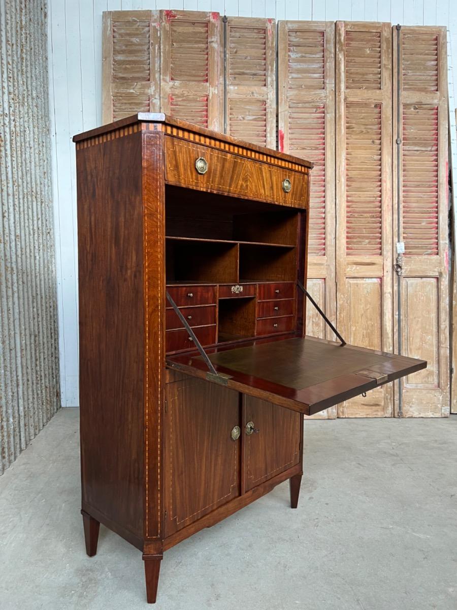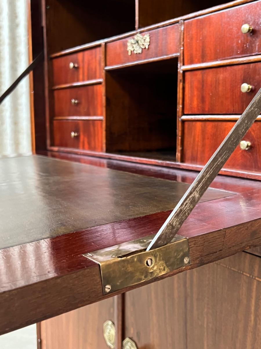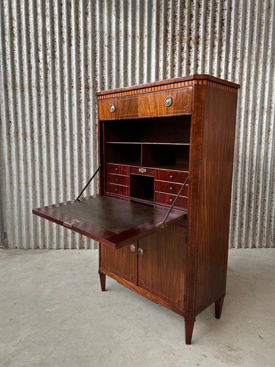 Hollands louis xvi klep secretaire, eind 18e eeuw. Overhoeks geplaatste stijlen met ingelegde bies. En ingelegde tandlijst. Mooi doorlopend en gespiegeld Cuba mahonie fineer (op eiken), Hexagonaal verguld messing beslag op de bovenlade. Schrijfblad met olijf groen kalfsleder ingelegd. Sloten en sleutels werkend. Geheel op vier tapse poten. Holland ca. 1775 - 1795 Afm: H= 145 cm. B= 86 cm. D= 40 cm. Onlangs grondig nagelopen op losse delen van constructie en fineer. Houtworm controle : Geen levende houtworm aangetroffen 2/1/2022 sec-2256~