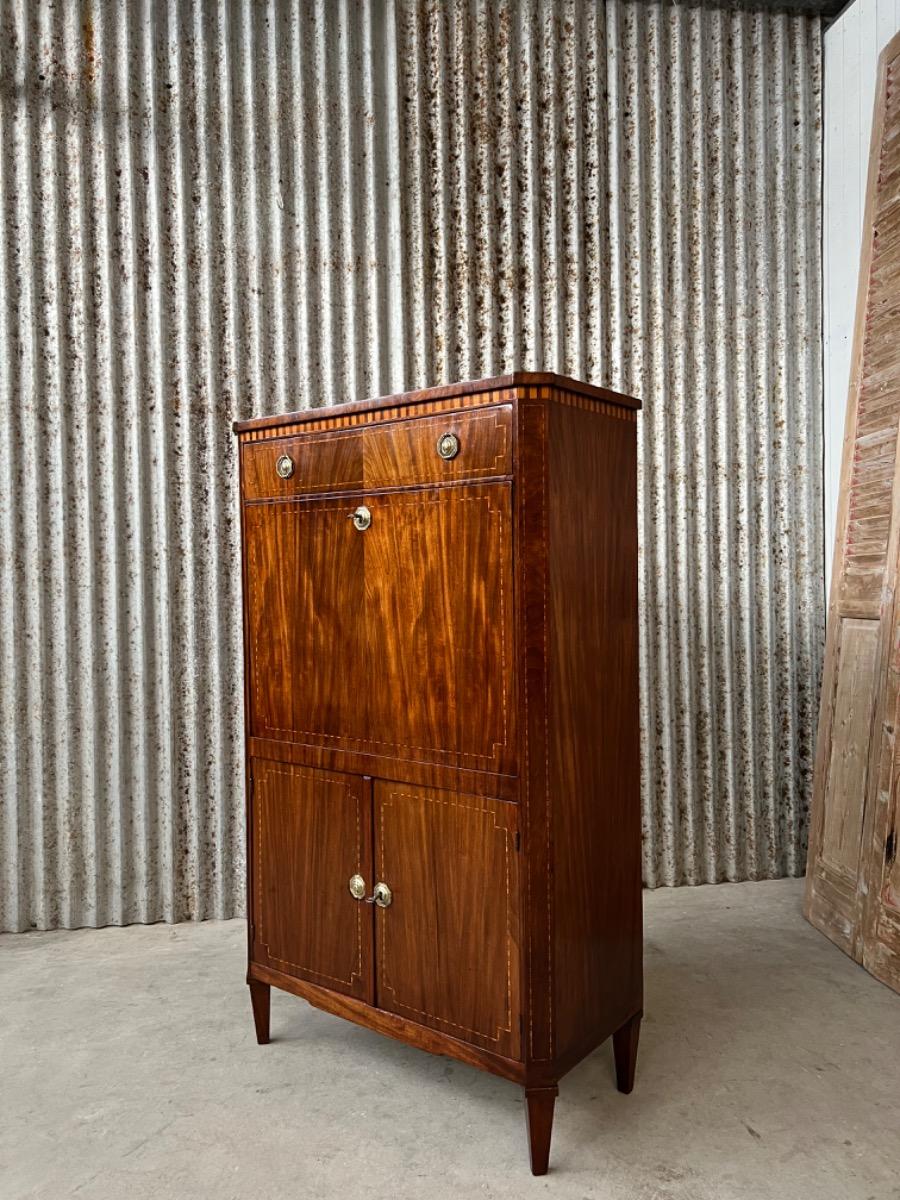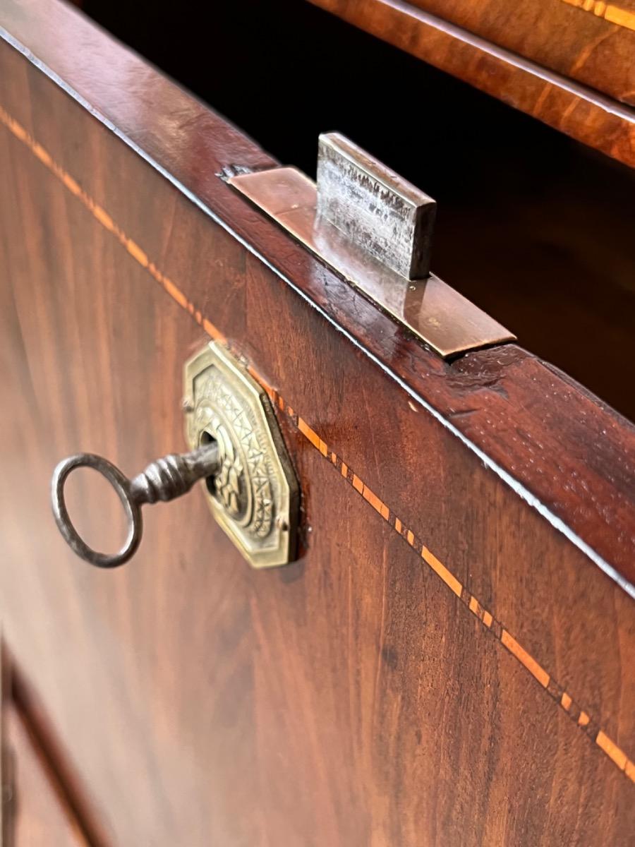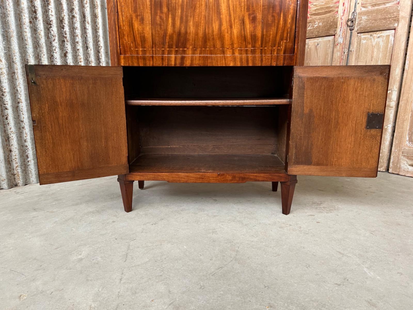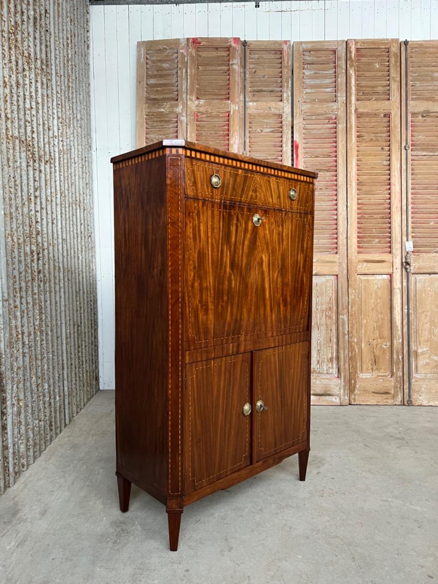 Hollands louis xvi klep secretaire, eind 18e eeuw. Overhoeks geplaatste stijlen met ingelegde bies. En ingelegde tandlijst. Mooi doorlopend en gespiegeld Cuba mahonie fineer (op eiken), Hexagonaal verguld messing beslag op de bovenlade. Schrijfblad met olijf groen kalfsleder ingelegd. Sloten en sleutels werkend. Geheel op vier tapse poten. Holland ca. 1775 - 1795 Afm: H= 145 cm. B= 86 cm. D= 40 cm. Onlangs grondig nagelopen op losse delen van constructie en fineer. Houtworm controle : Geen levende houtworm aangetroffen 2/1/2022 sec-2256~