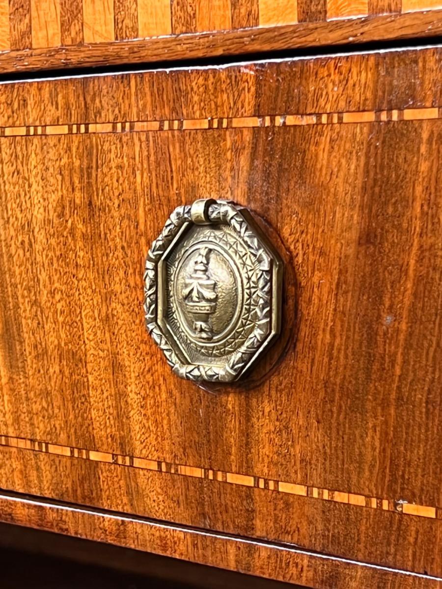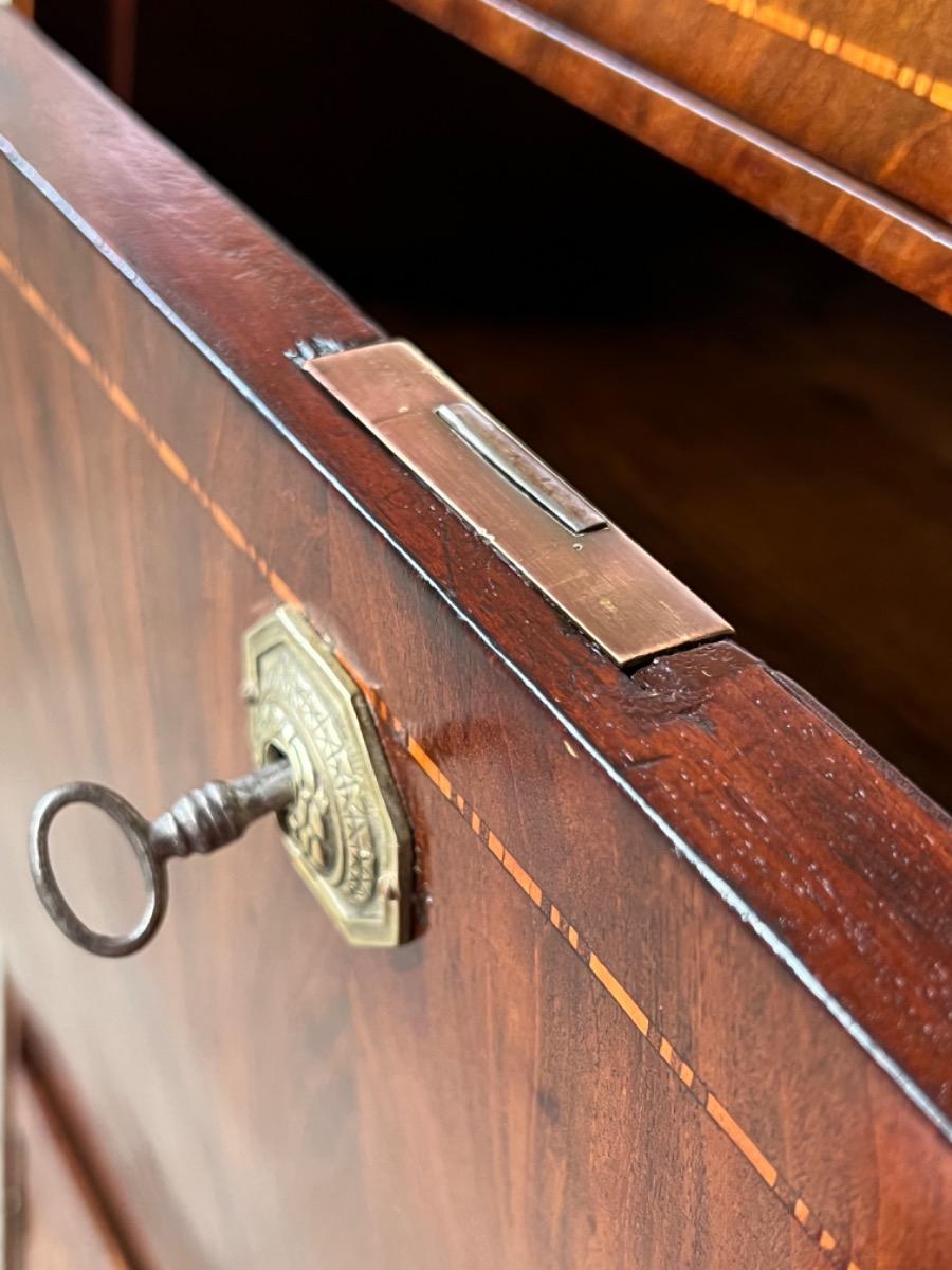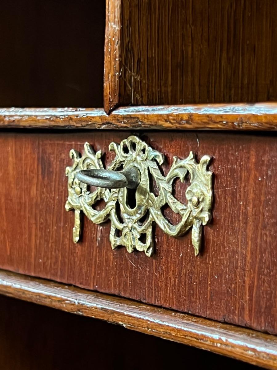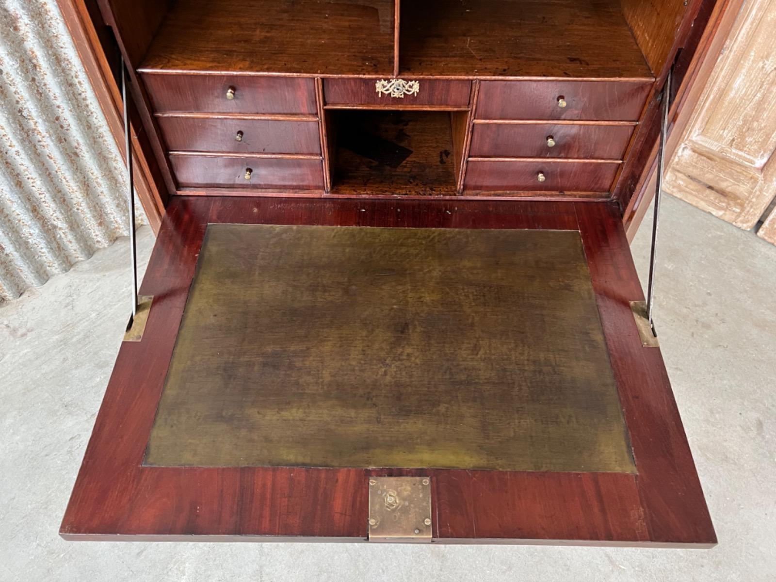 Hollands louis xvi klep secretaire, eind 18e eeuw. Overhoeks geplaatste stijlen met ingelegde bies. En ingelegde tandlijst. Mooi doorlopend en gespiegeld Cuba mahonie fineer (op eiken), Hexagonaal verguld messing beslag op de bovenlade. Schrijfblad met olijf groen kalfsleder ingelegd. Sloten en sleutels werkend. Geheel op vier tapse poten. Holland ca. 1775 - 1795 Afm: H= 145 cm. B= 86 cm. D= 40 cm. Onlangs grondig nagelopen op losse delen van constructie en fineer. Houtworm controle : Geen levende houtworm aangetroffen 2/1/2022 sec-2256~