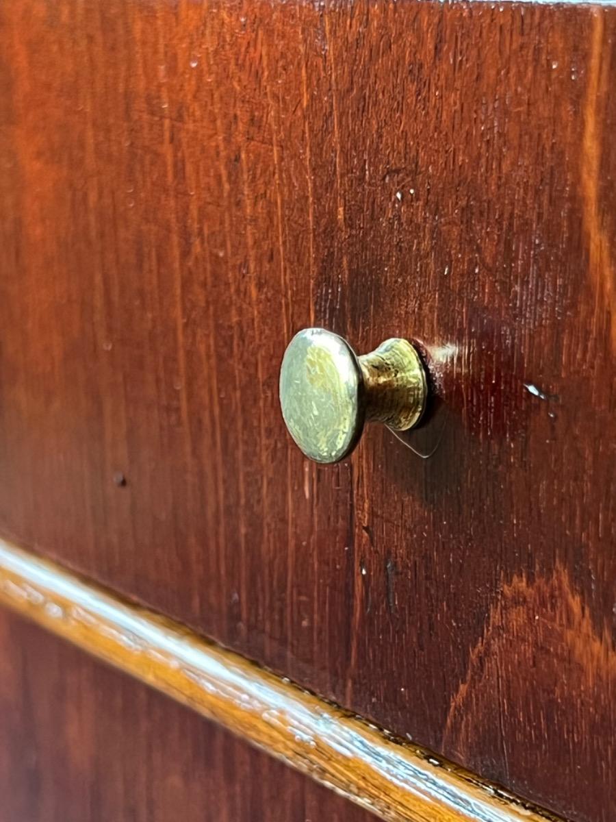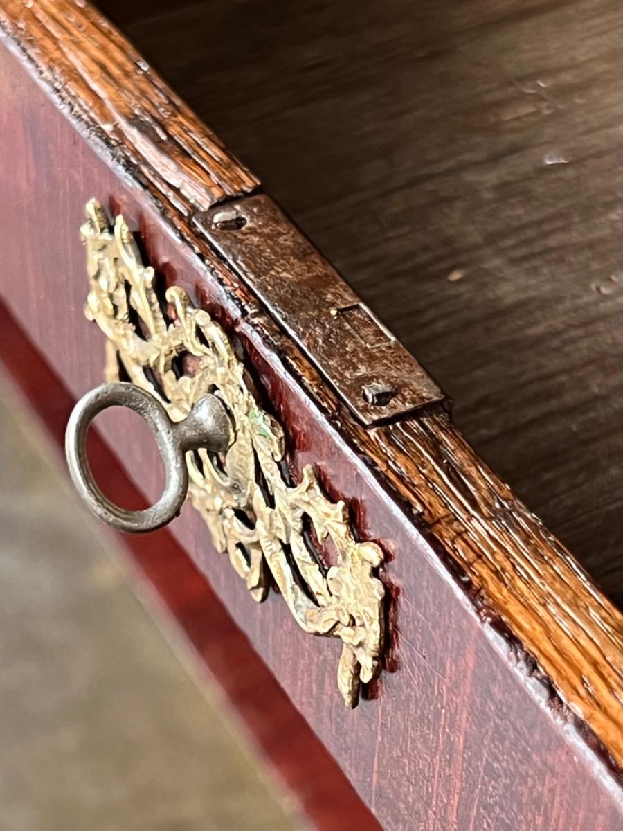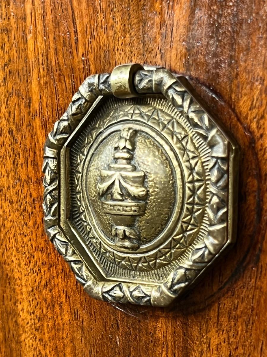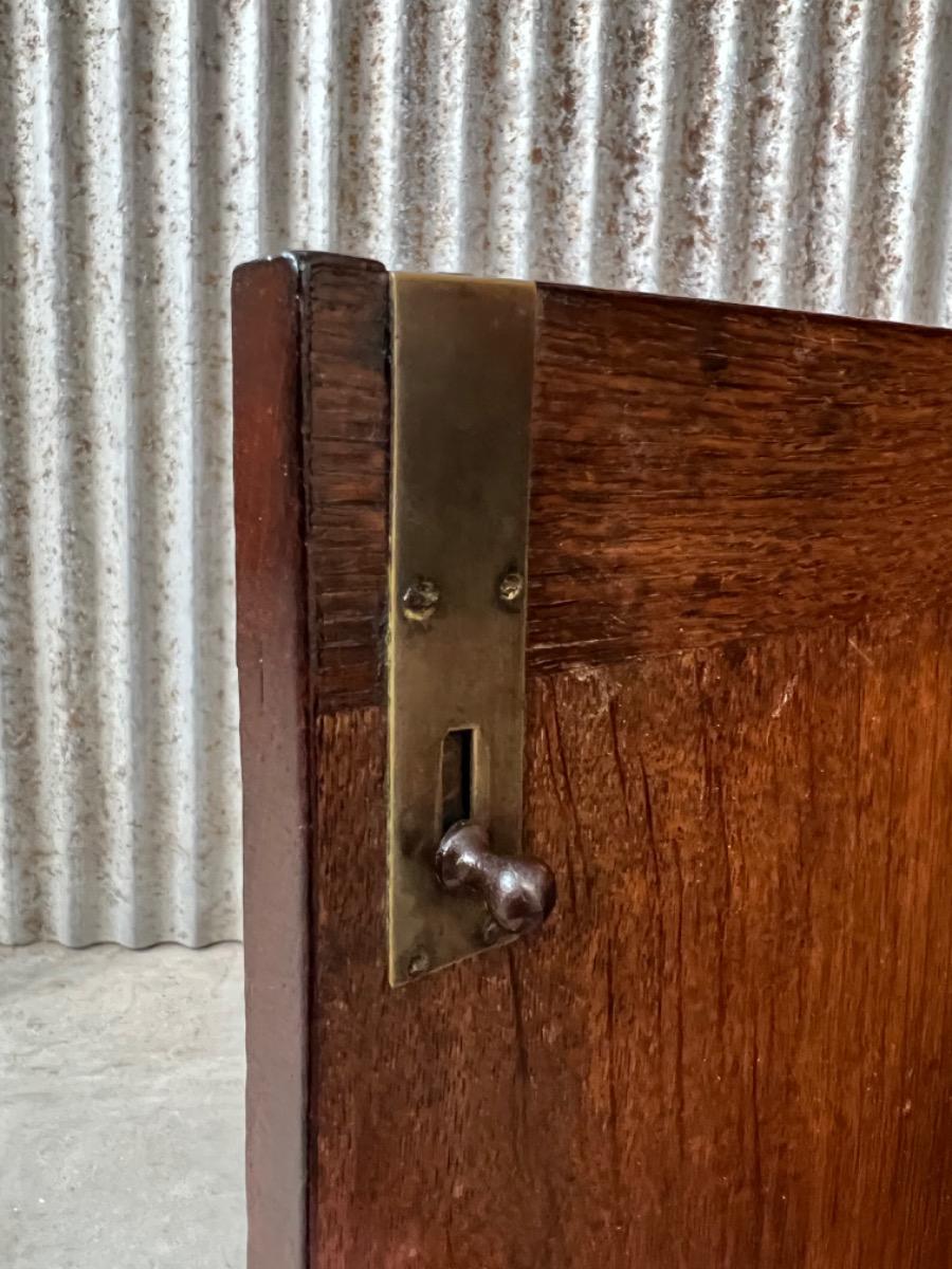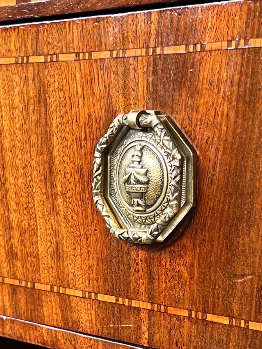 Hollands louis xvi klep secretaire, eind 18e eeuw. Overhoeks geplaatste stijlen met ingelegde bies. En ingelegde tandlijst. Mooi doorlopend en gespiegeld Cuba mahonie fineer (op eiken), Hexagonaal verguld messing beslag op de bovenlade. Schrijfblad met olijf groen kalfsleder ingelegd. Sloten en sleutels werkend. Geheel op vier tapse poten. Holland ca. 1775 - 1795 Afm: H= 145 cm. B= 86 cm. D= 40 cm. Onlangs grondig nagelopen op losse delen van constructie en fineer. Houtworm controle : Geen levende houtworm aangetroffen 2/1/2022 sec-2256~