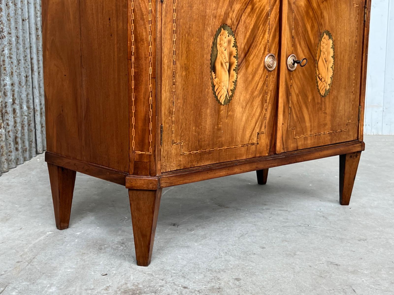 Mooi doorlopend en gespiegeld Cuba mahonie fineer (op eiken), met ingelegde schelp motief.