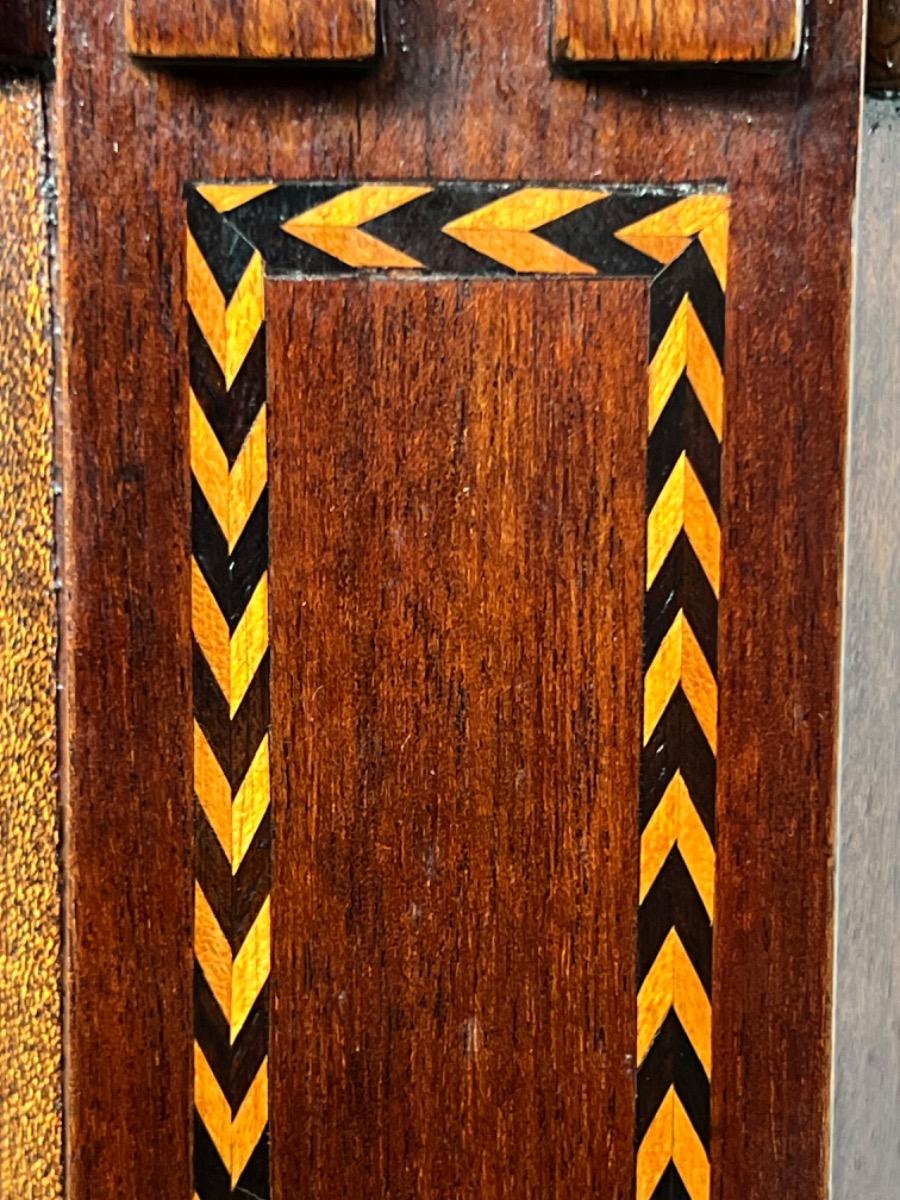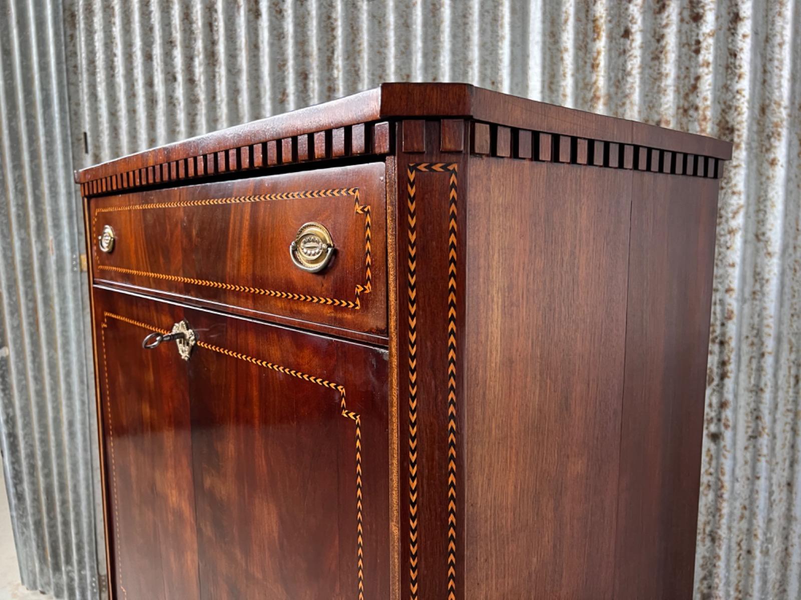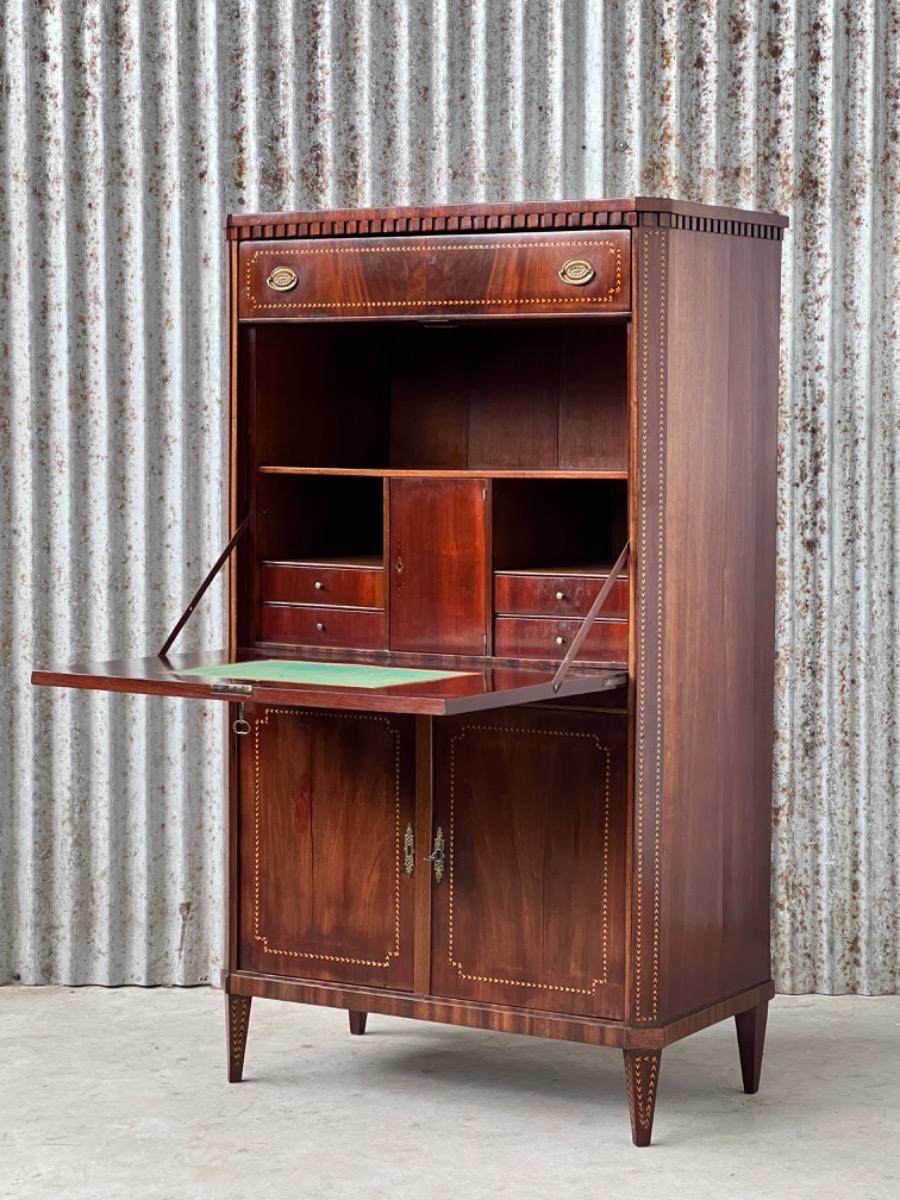 Hollands louis xvi klep secretaire, eind 18e eeuw. Overhoeks geplaatste stijlen met fraai gedetailleerd ingelegde ebben en hulst bies. Frontaal mooi doorlopend en recht en bloem nervig mahonie fineer (op eiken) Verguld messing beslag op de bovenlade, klep en deuren. Slot en sleutel werkend (oorspronkelijk). Schrijfblad met groen vilt (gebruikt) ingelegd. Oude restauraties van latere datum. Sloten en sleutels werkend. Geheel op tapse poten. Holland ca. 1775 - 1795 Afm: H= 151 cm. B= 86 - 87 cm. (smalst- breedst) D= 47 - 49 cm. (ondiepst-diepst) Onlangs grondig nagelopen op losse delen van constructie en fineer. Geen levende houtworm aangetroffen op 3/1/2025 Sec-2872~