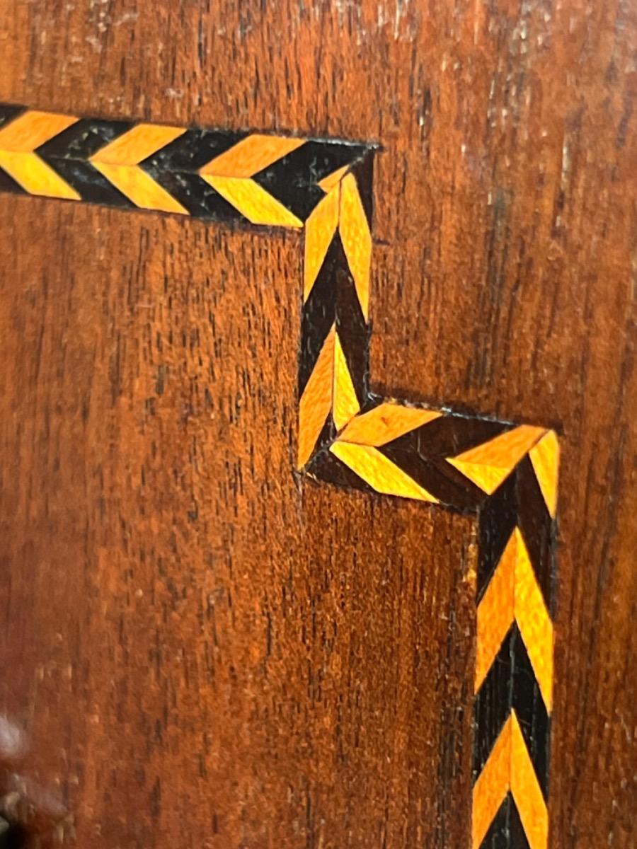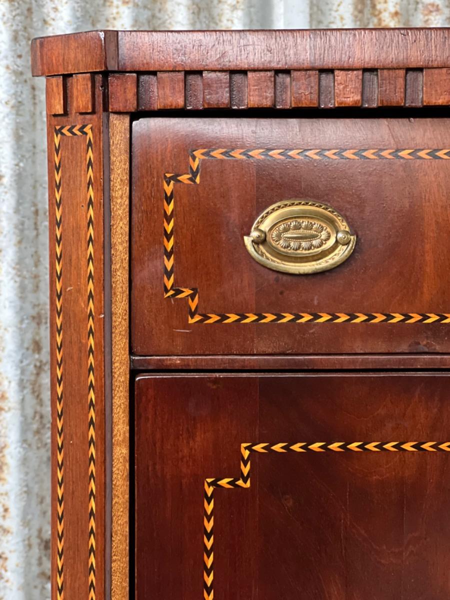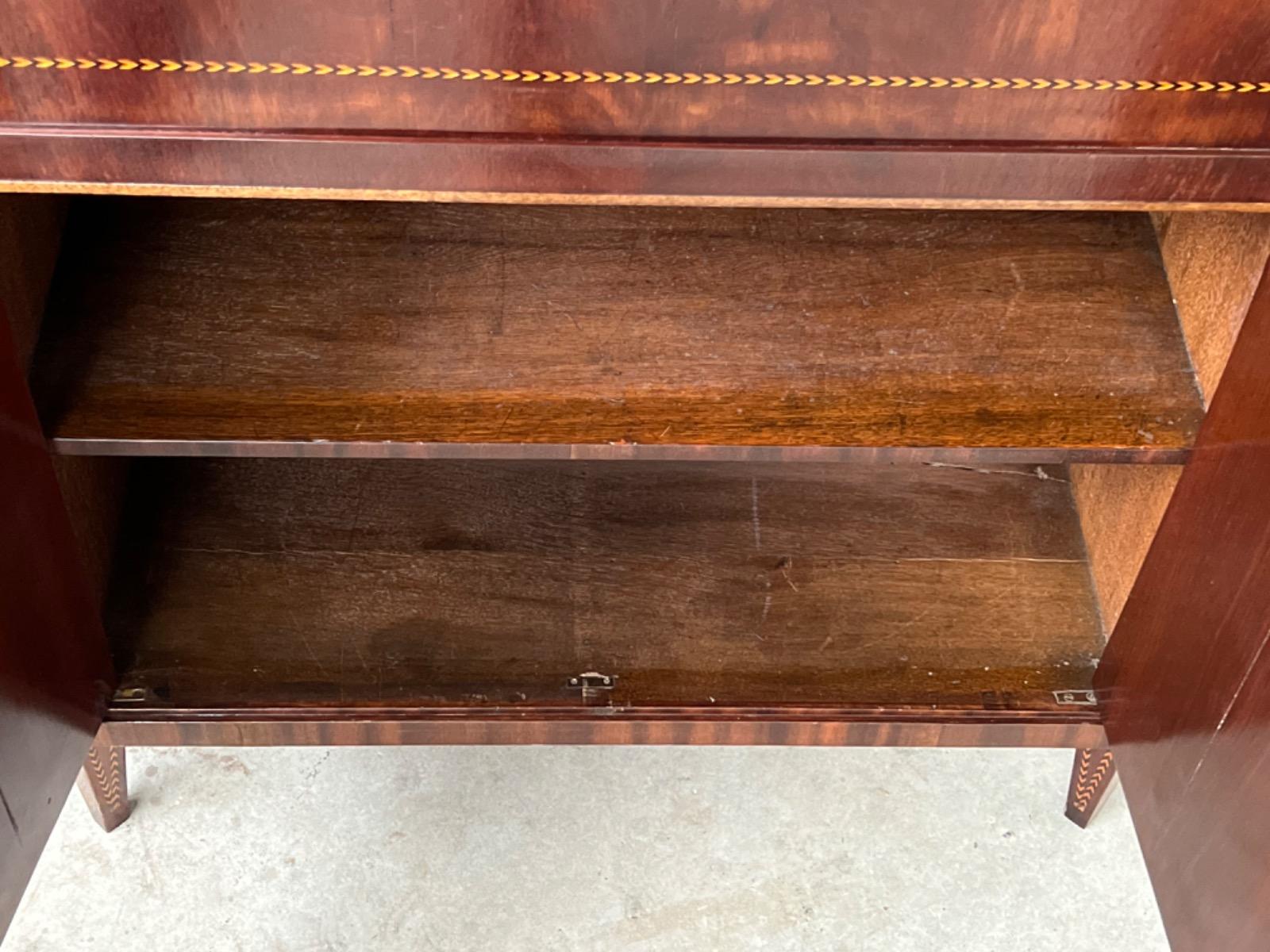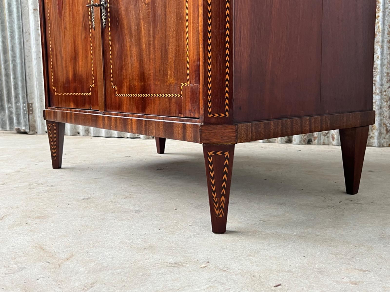Hollands louis xvi klep secretaire, eind 18e eeuw. Overhoeks geplaatste stijlen met fraai gedetailleerd ingelegde ebben en hulst bies. Frontaal mooi doorlopend en recht en bloem nervig mahonie fineer (op eiken) Verguld messing beslag op de bovenlade, klep en deuren. Slot en sleutel werkend (oorspronkelijk). Schrijfblad met groen vilt (gebruikt) ingelegd. Oude restauraties van latere datum. Sloten en sleutels werkend. Geheel op tapse poten. Holland ca. 1775 - 1795 Afm: H= 151 cm. B= 86 - 87 cm. (smalst- breedst) D= 47 - 49 cm. (ondiepst-diepst) Onlangs grondig nagelopen op losse delen van constructie en fineer. Geen levende houtworm aangetroffen op 3/1/2025 Sec-2872~