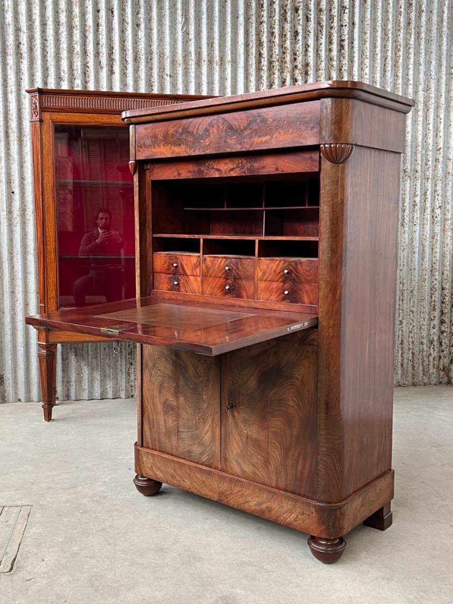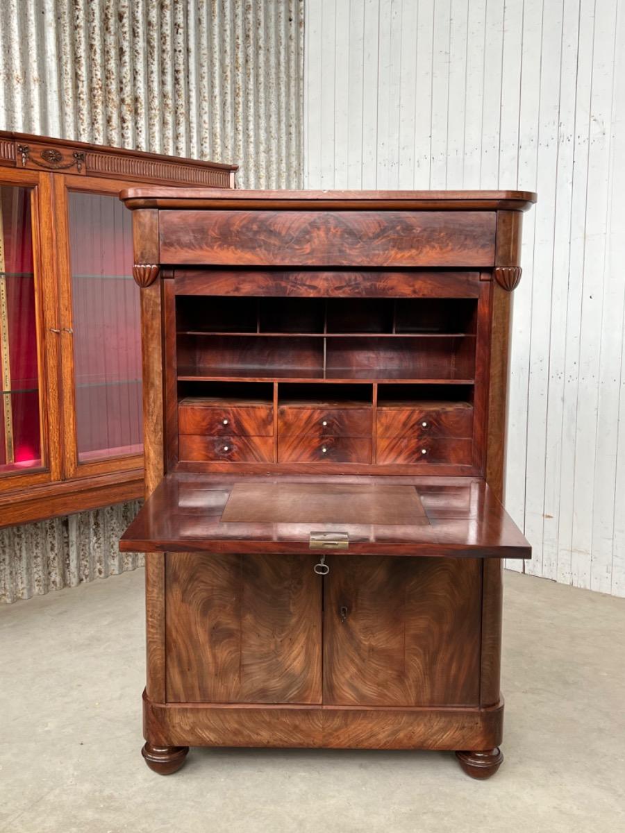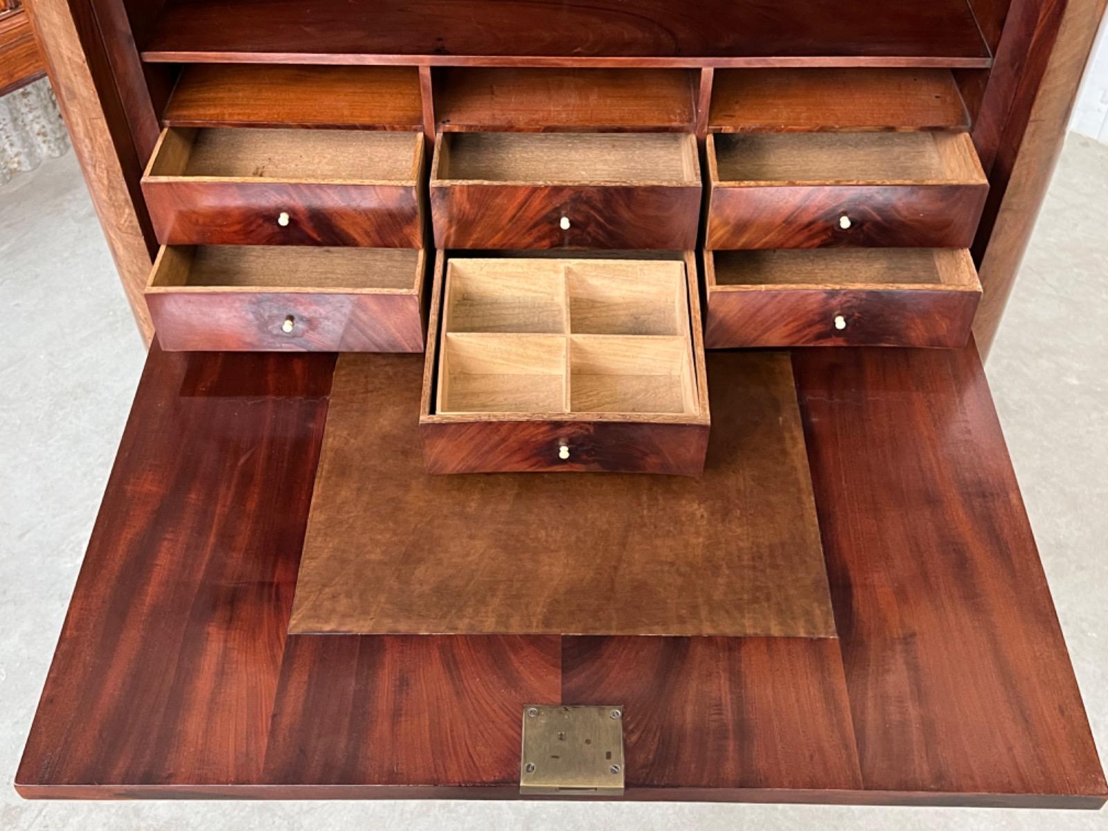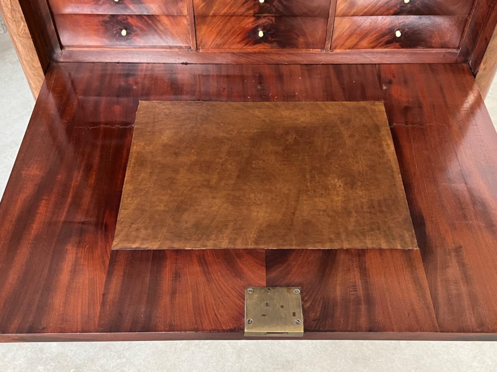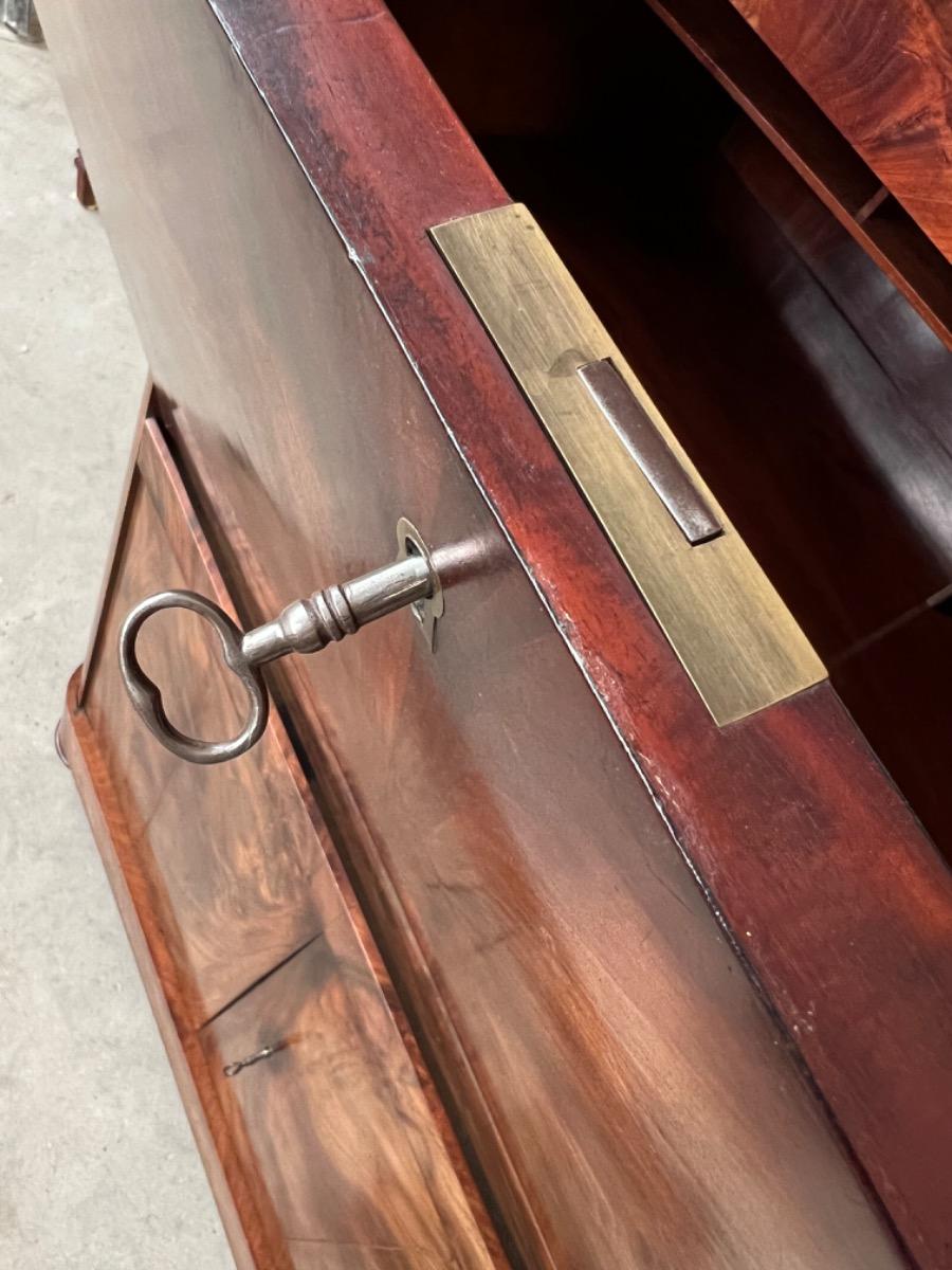 Mahonie secretaire strak model, zeer fraai bloemmahonie gefineerd met massief messing entreé's