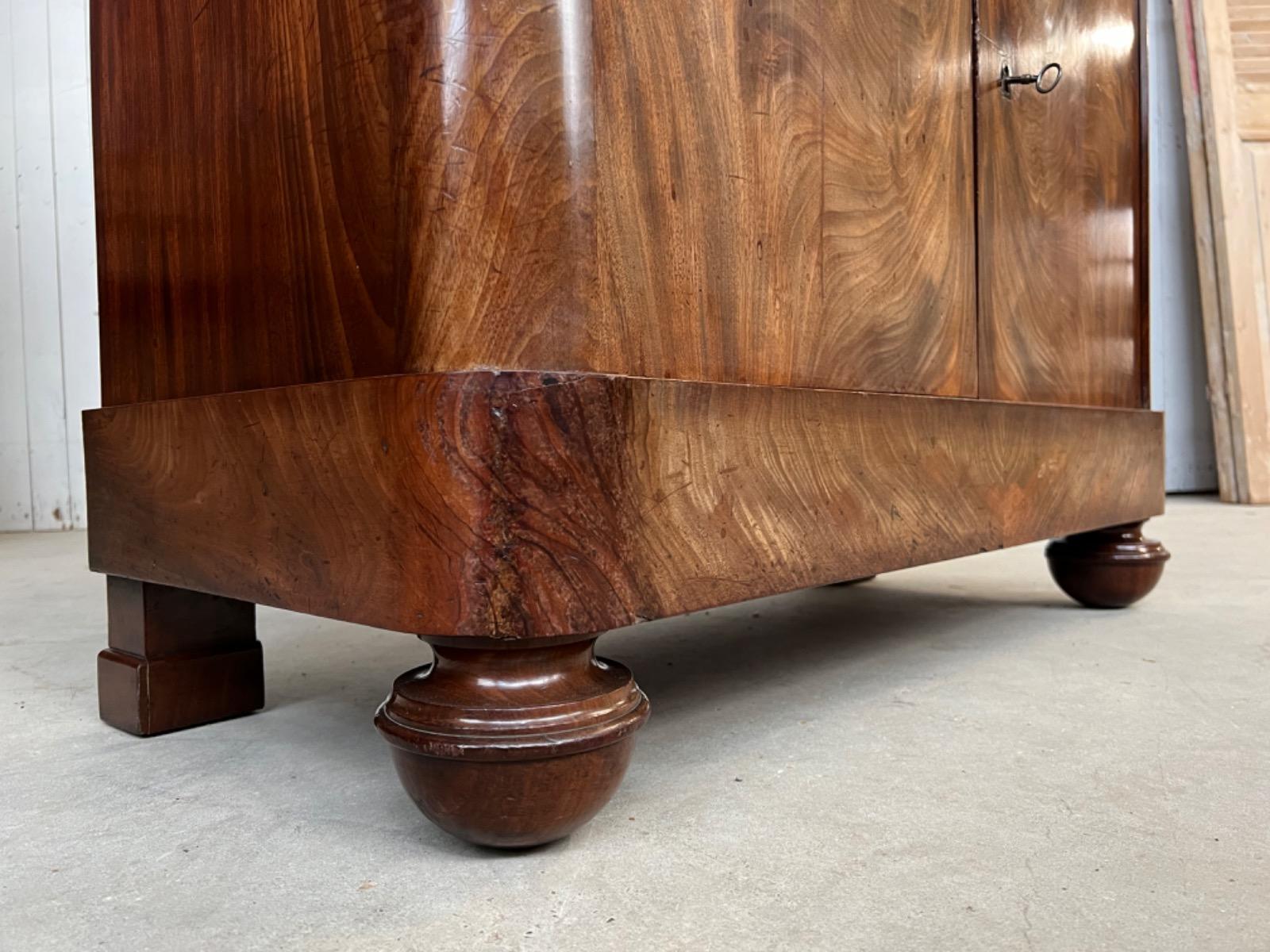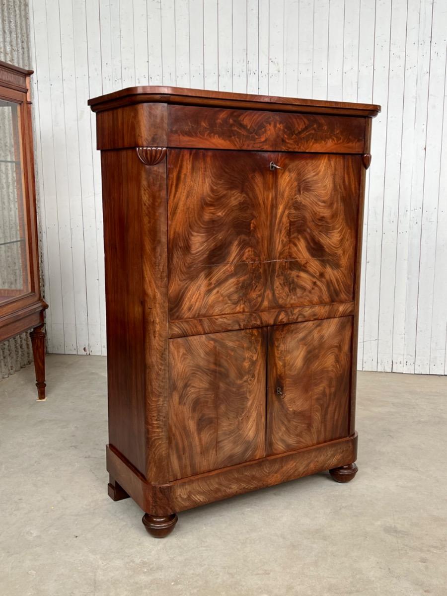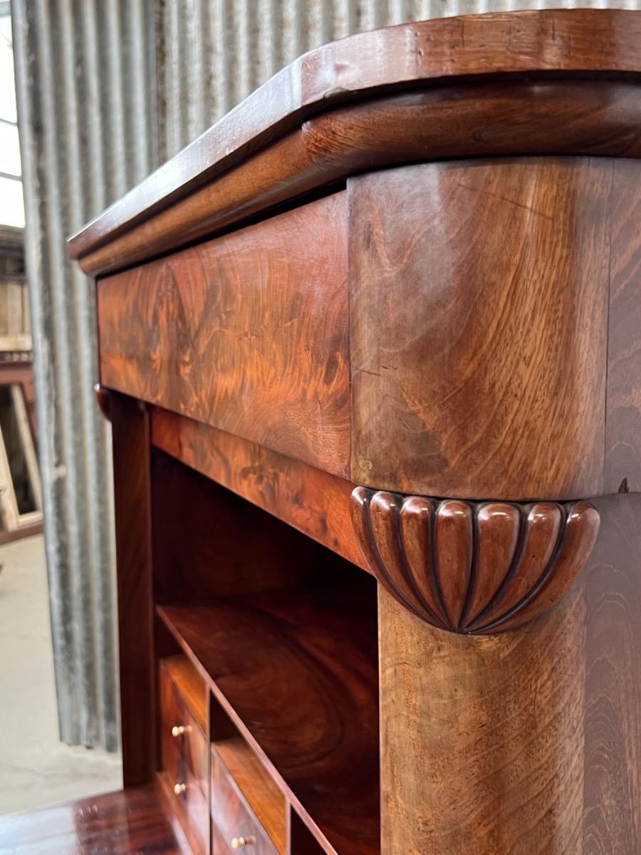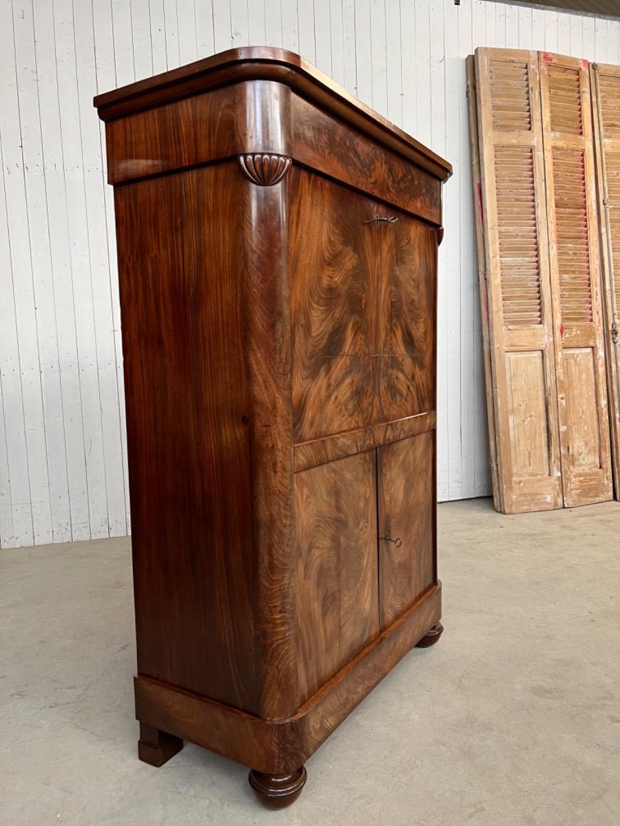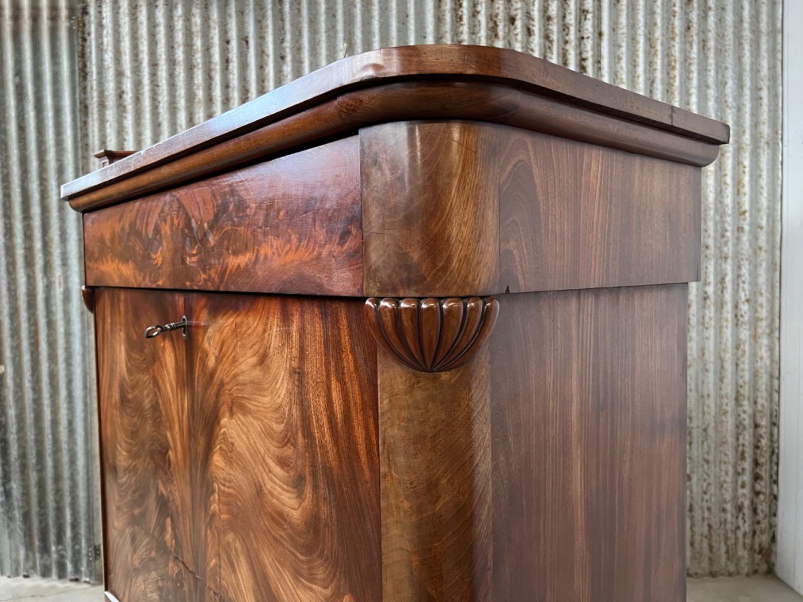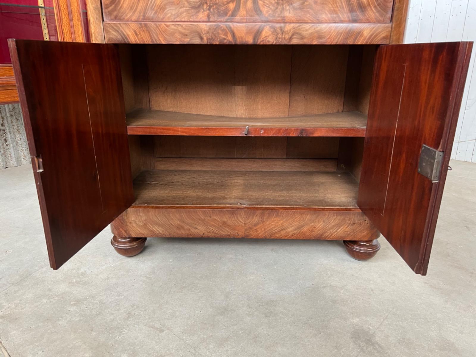 Mahonie secretaire strak model, zeer fraai bloemmahonie gefineerd met massief messing entreé's