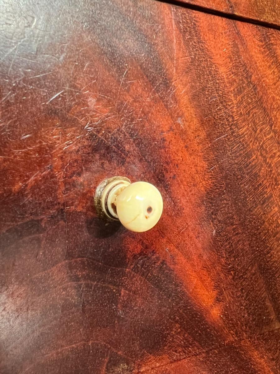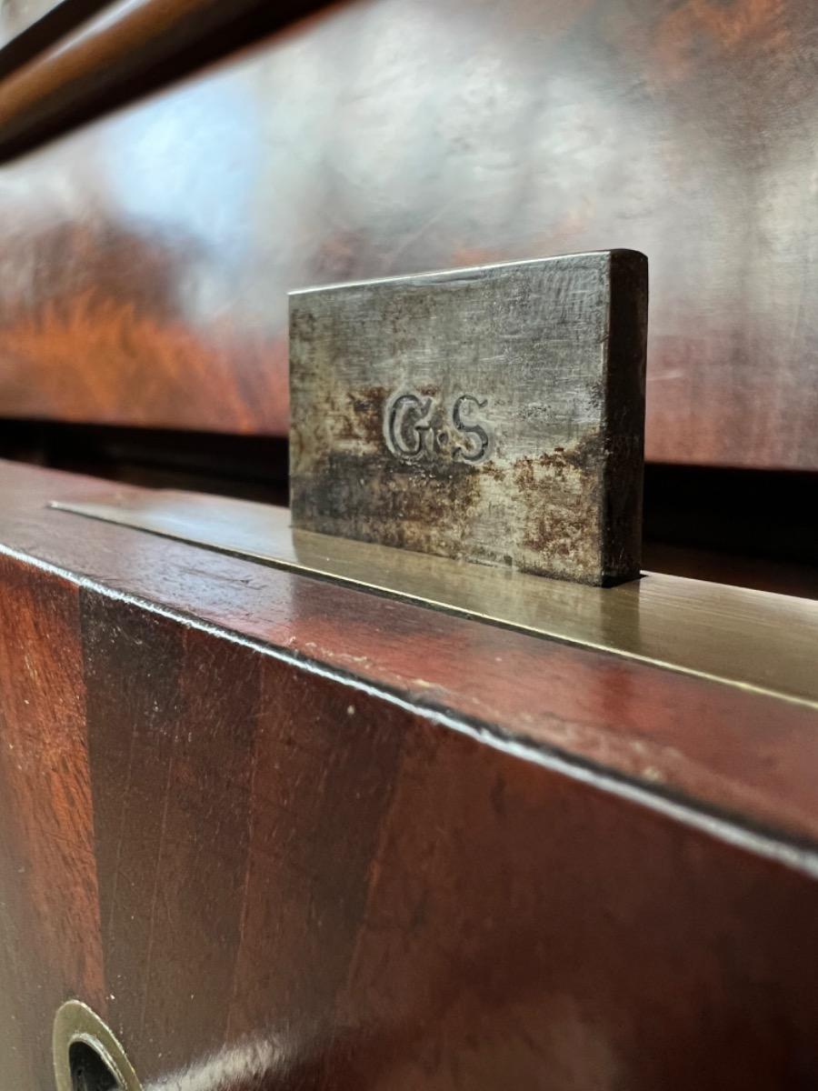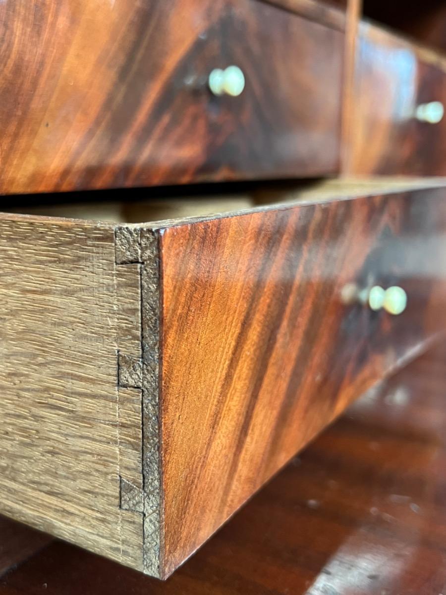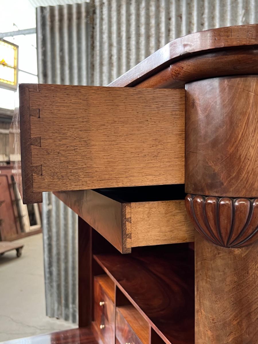 6 laden in het interieur met ivoren knopjes en 1 blinde lade in de kap. Sloten en sleutels oorspronkelijk èn werkend.