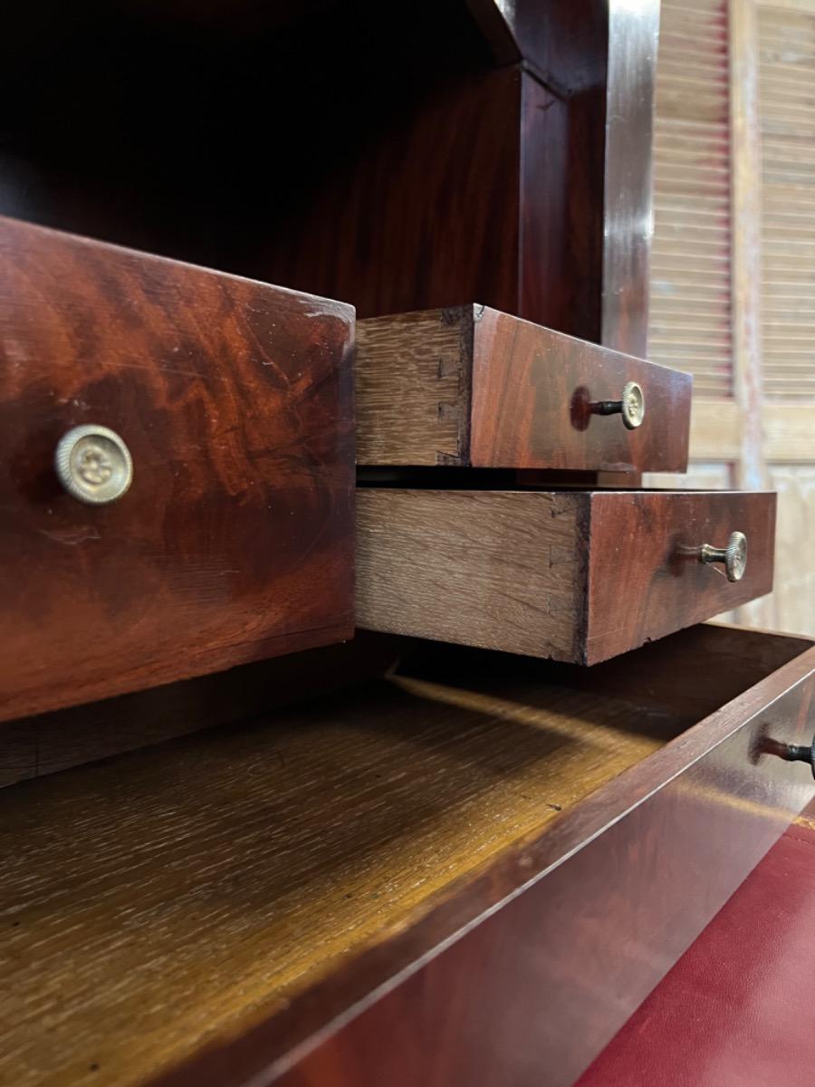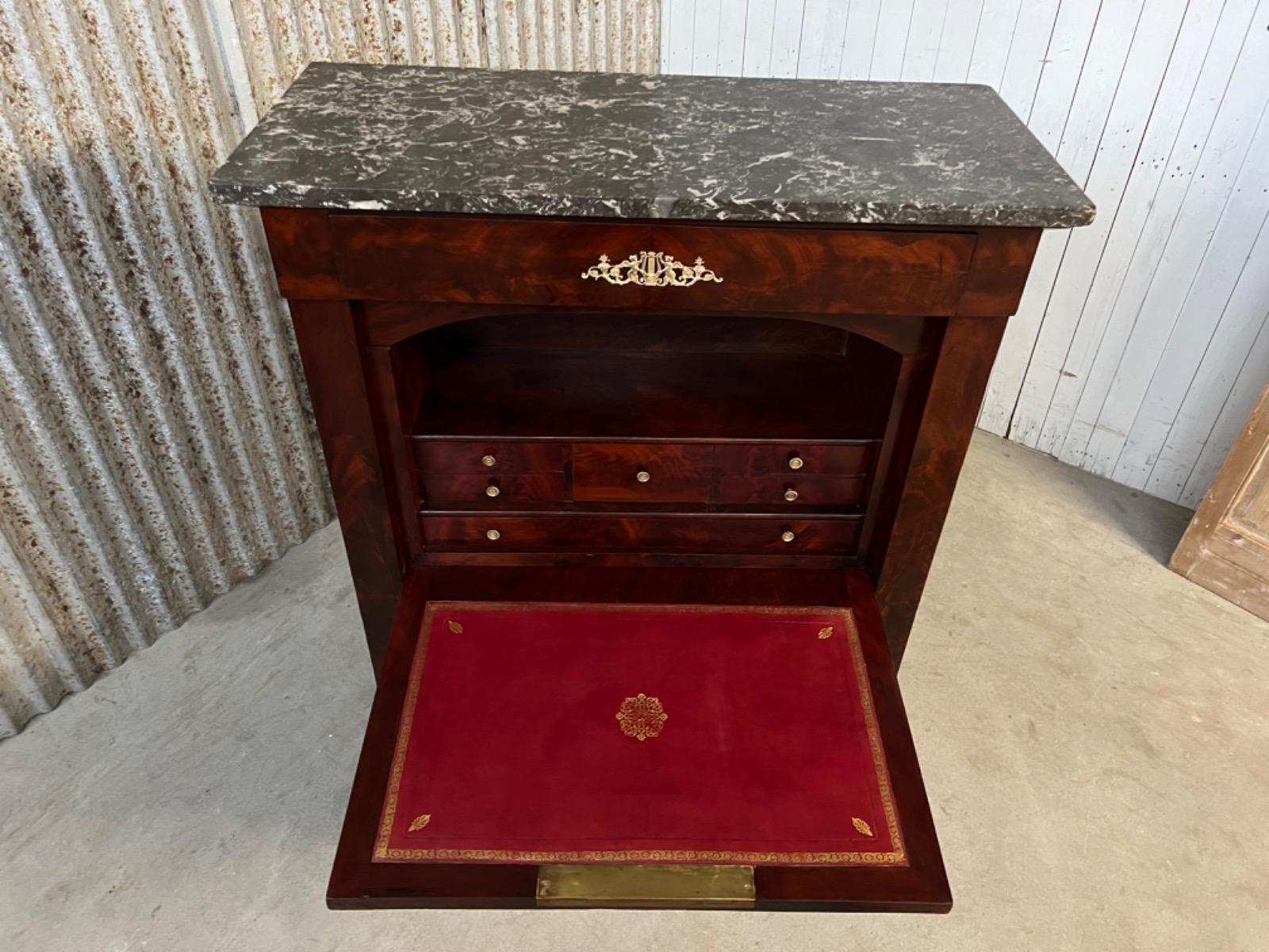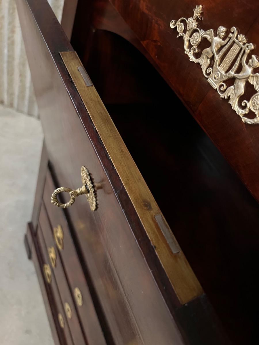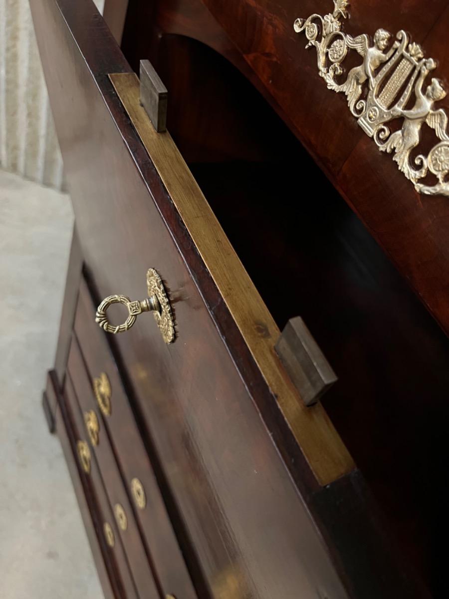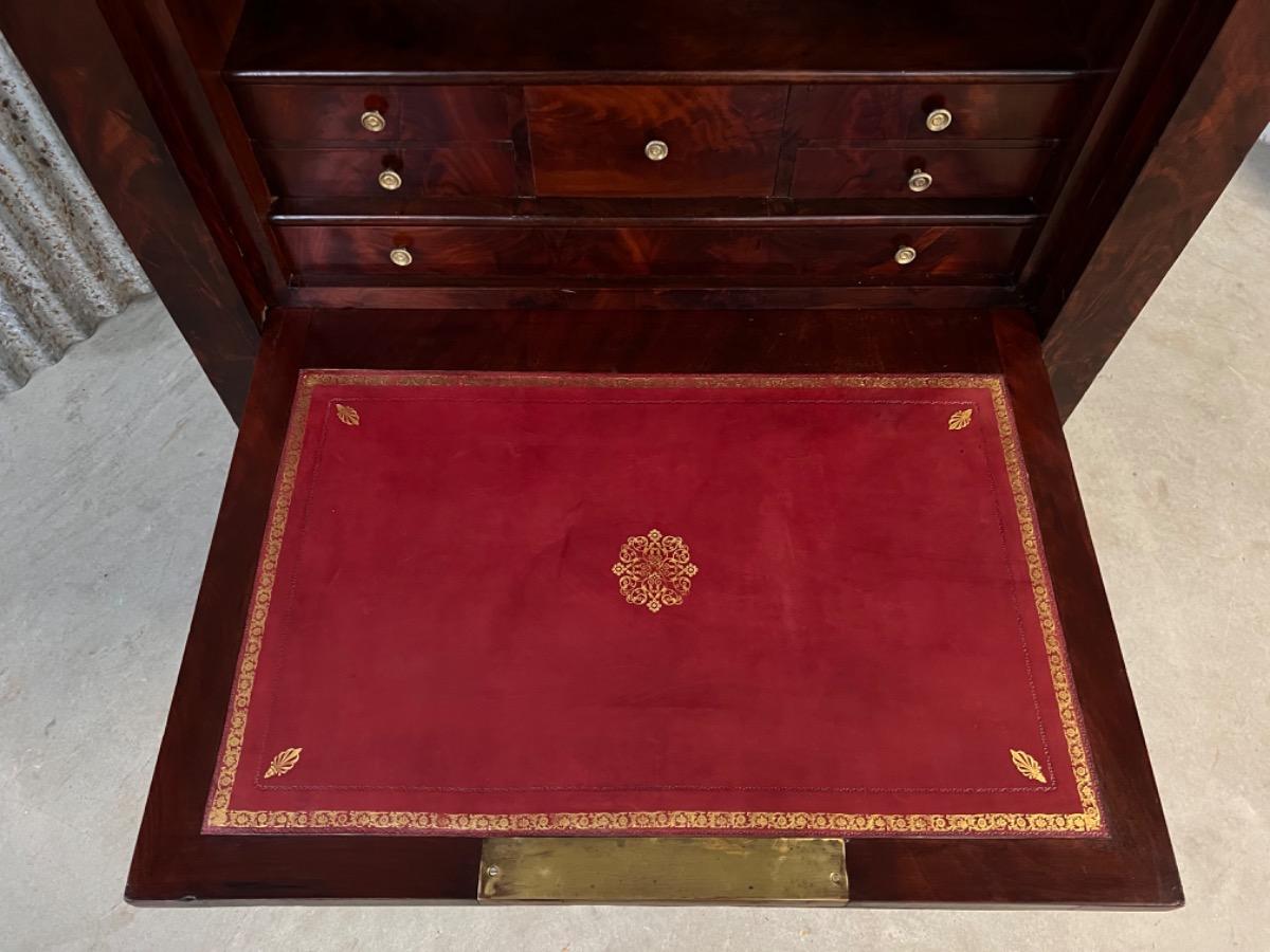 Empire secretaire á abattànt, met voluut vormige mahonie pilaar.